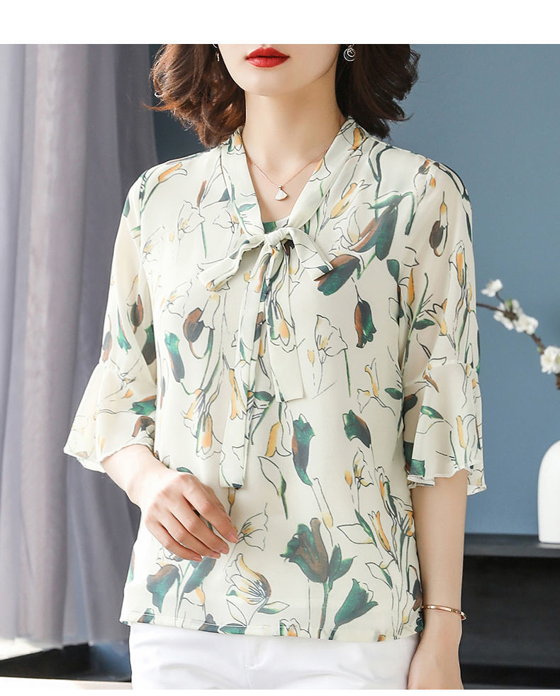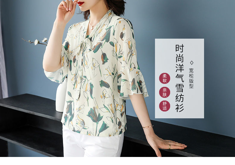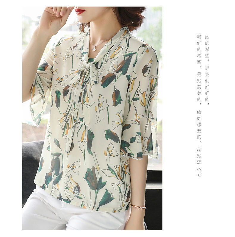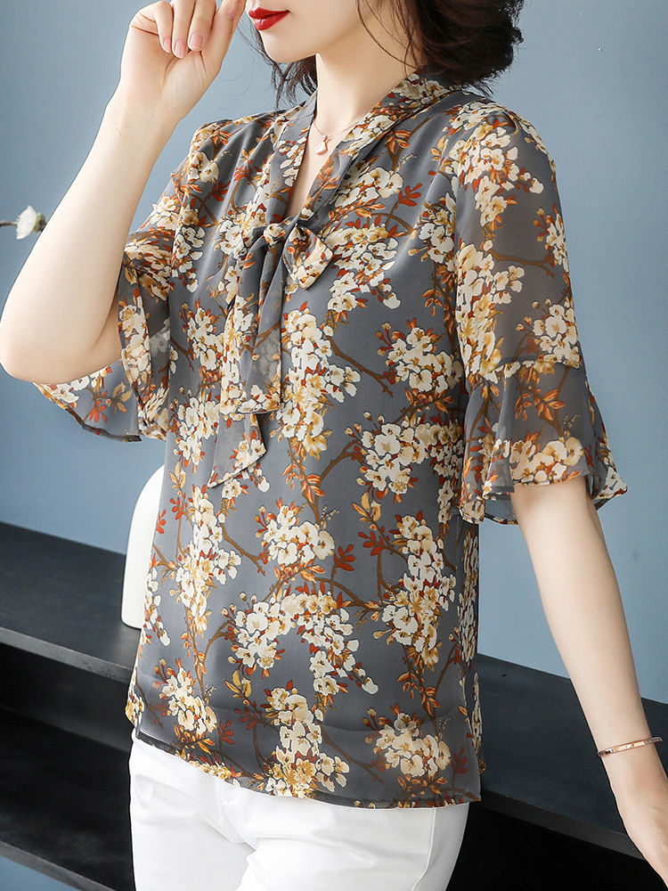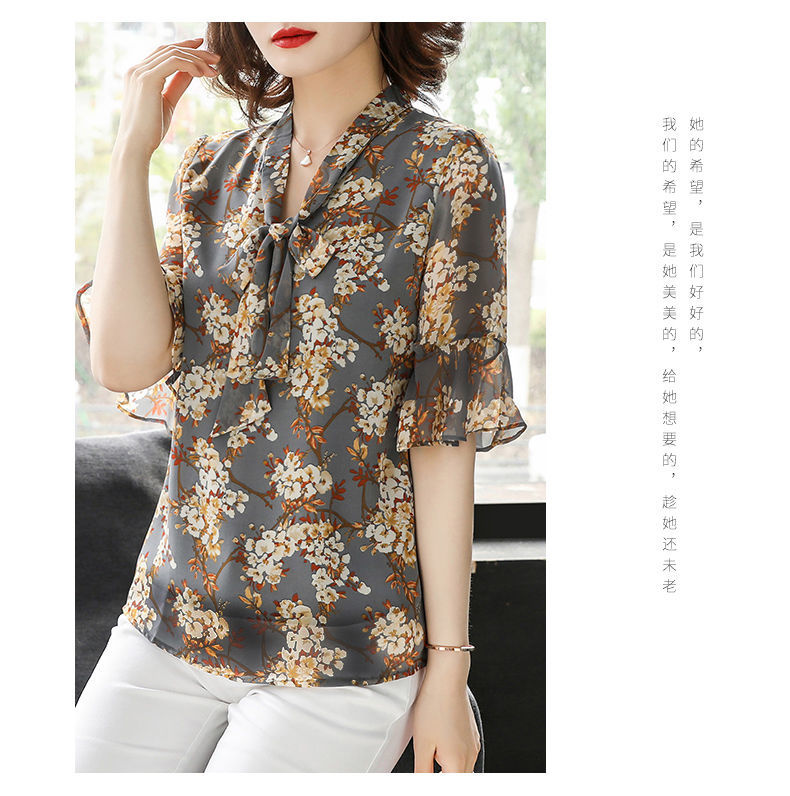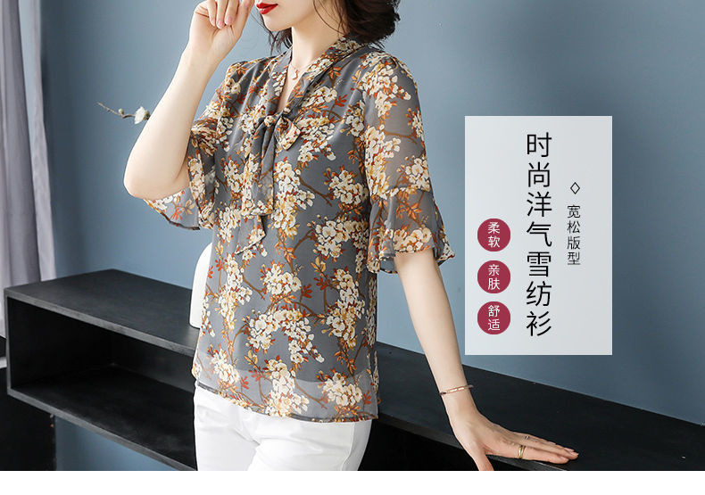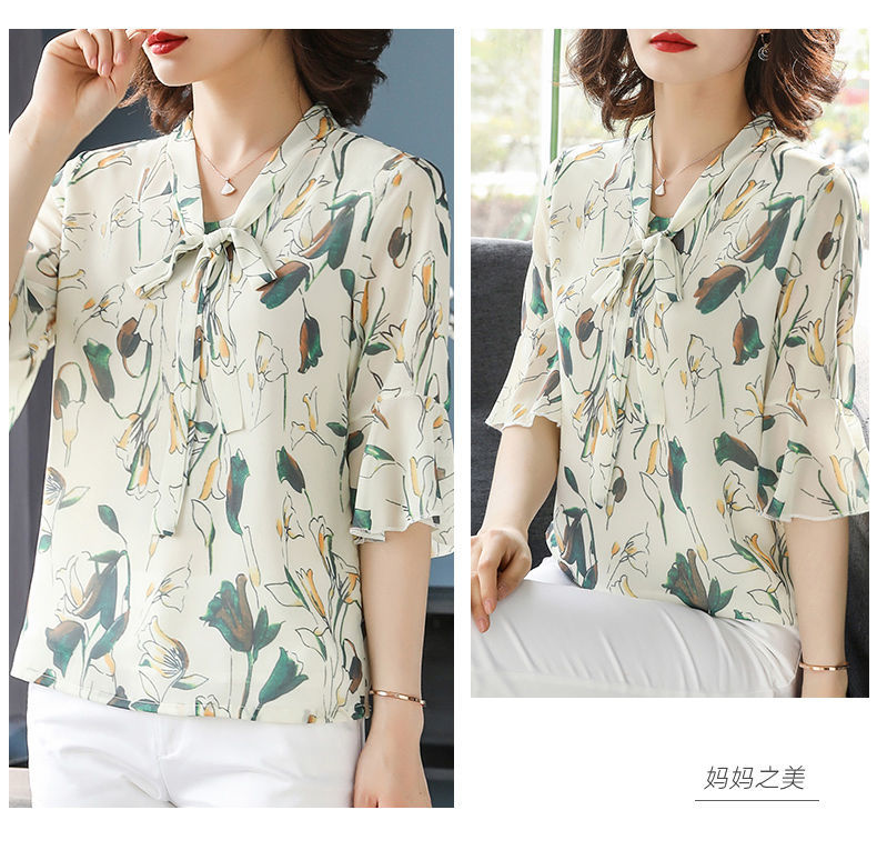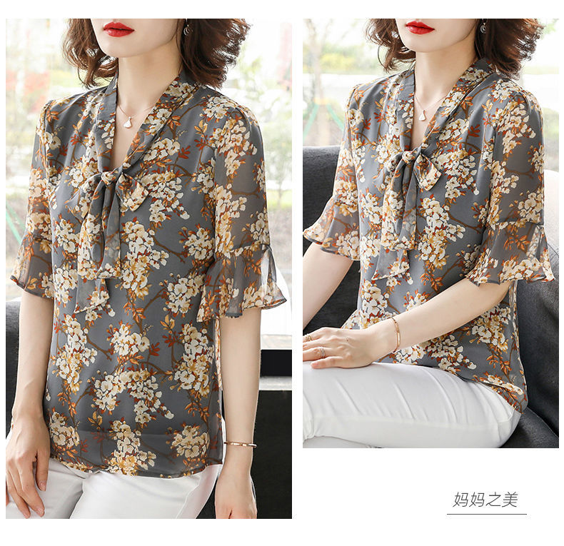 雪纺夏装洋气时尚碎花衬衫上衣中年女中老年女装短袖T恤妈妈装
