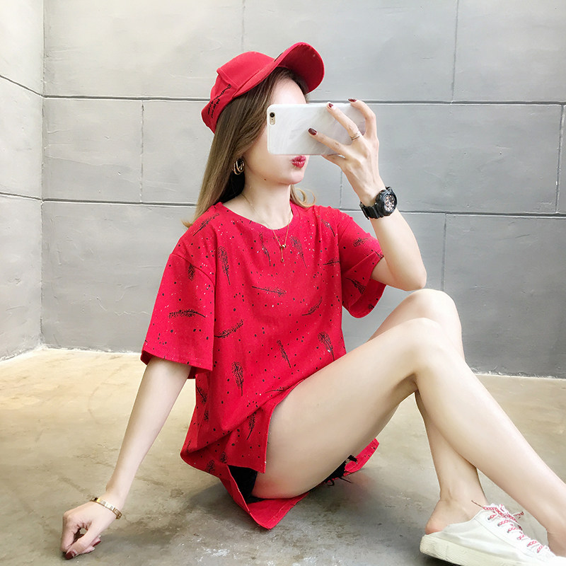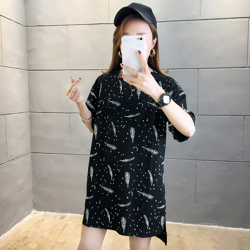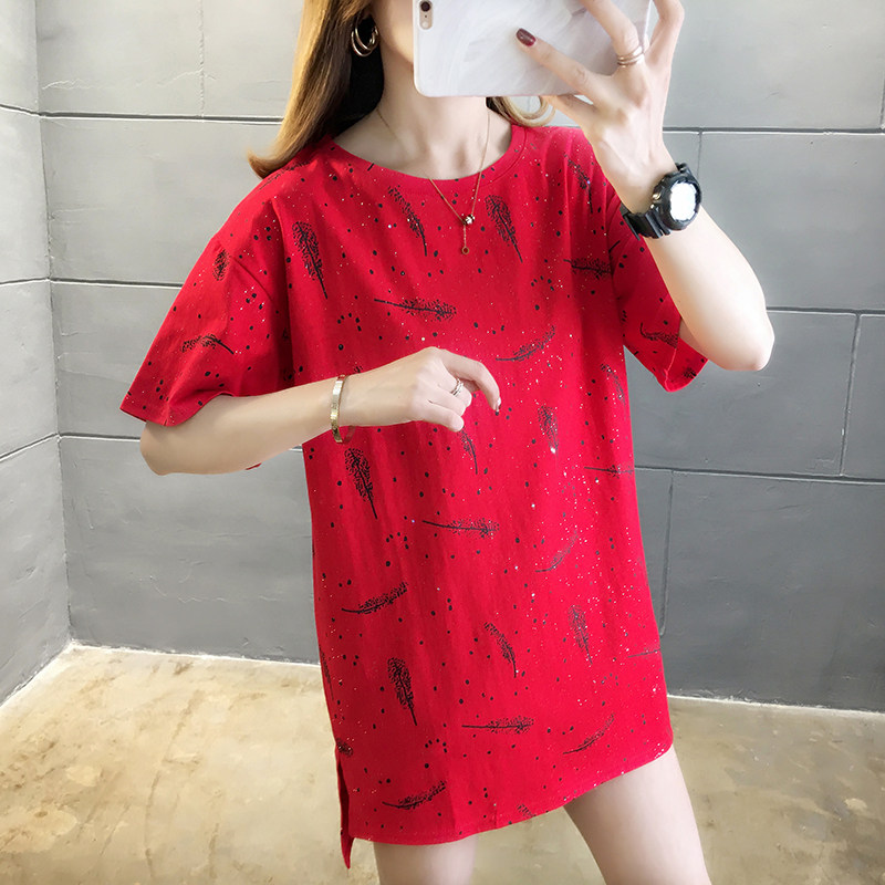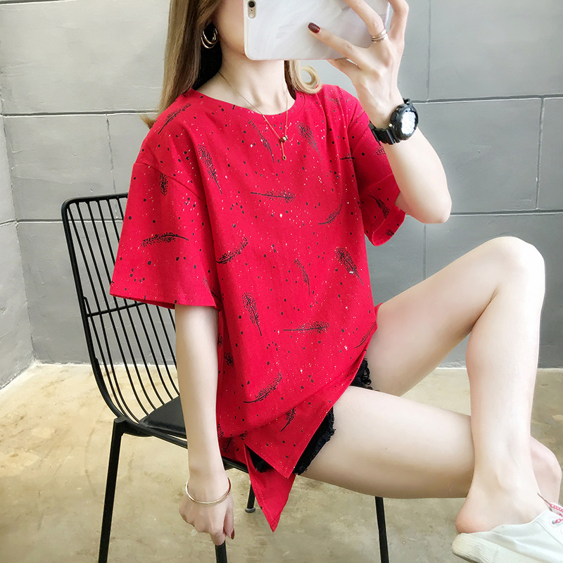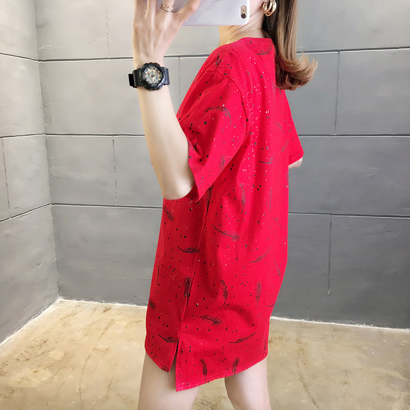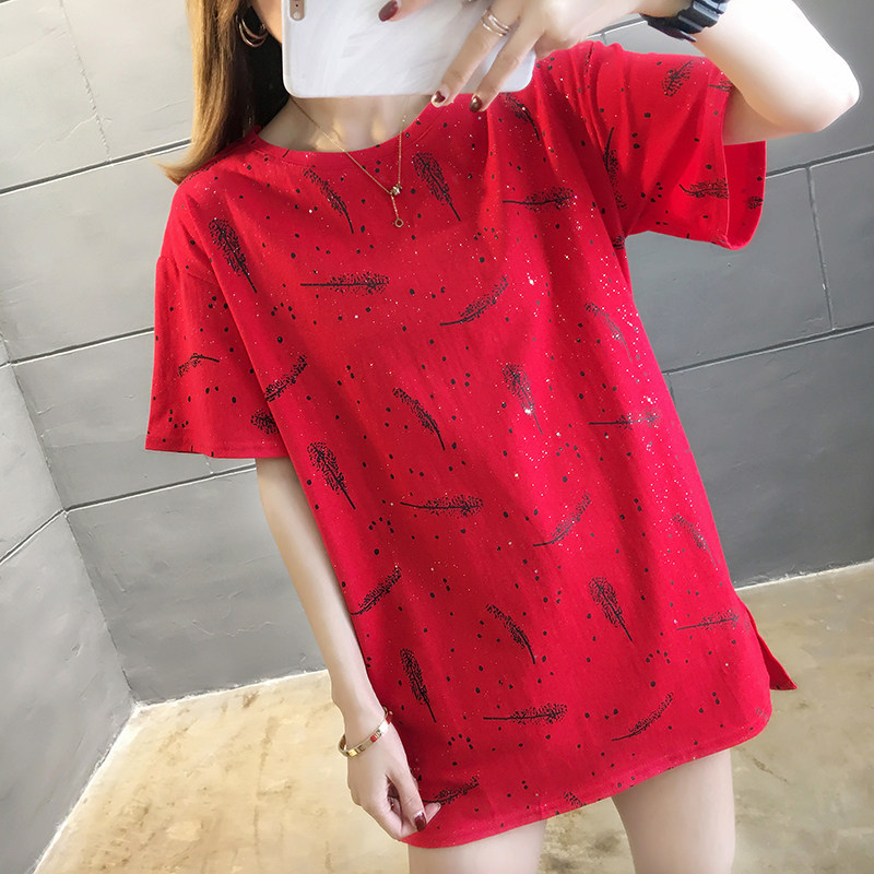 35棉65涤韩版印花宽松中长款亮片短袖T恤女潮夏实拍