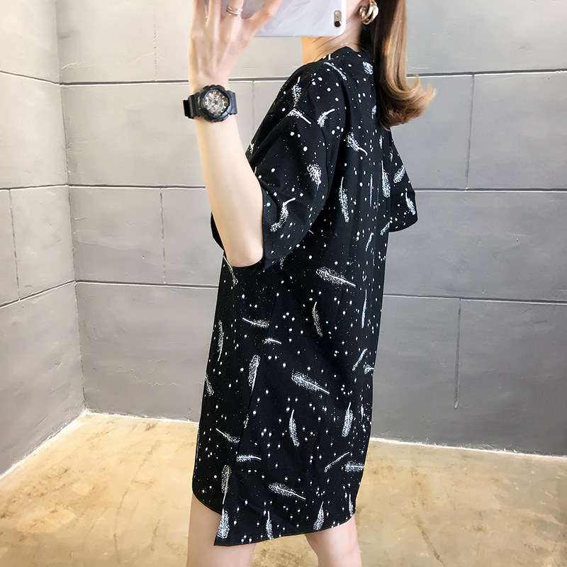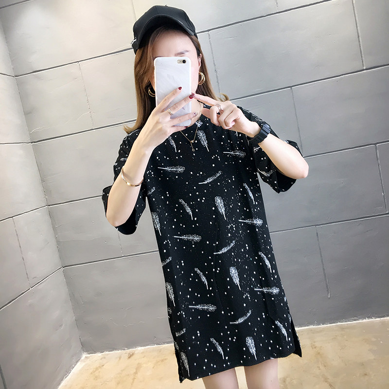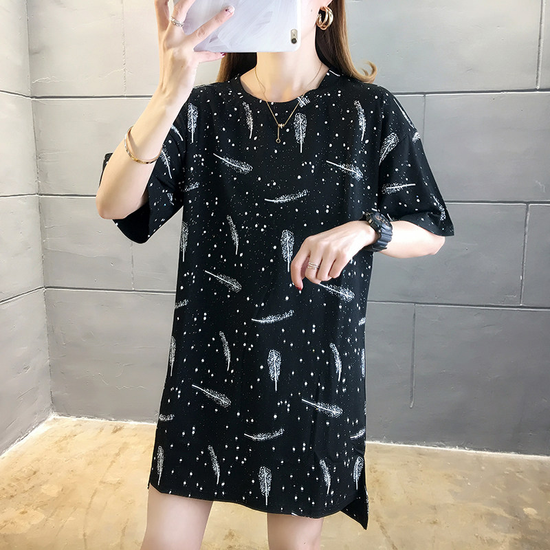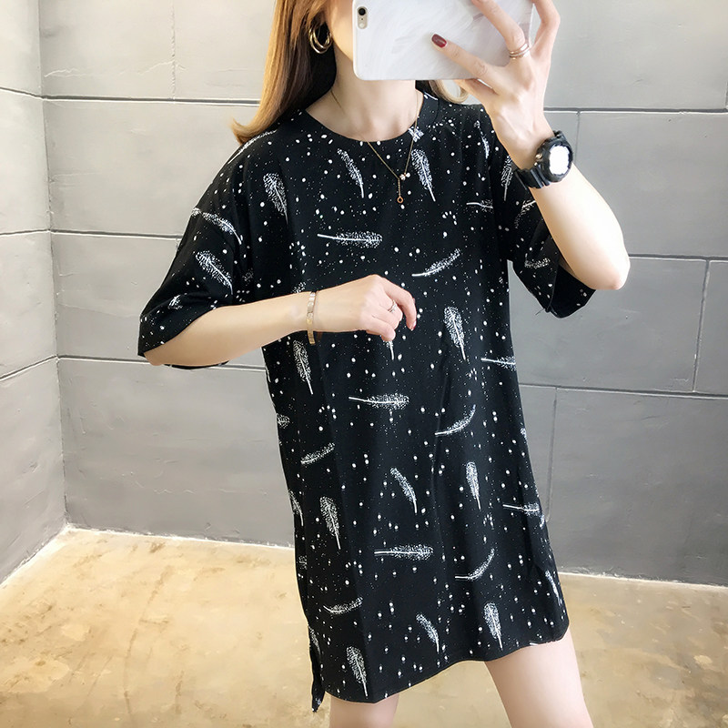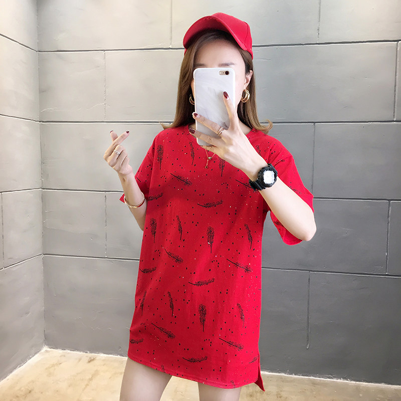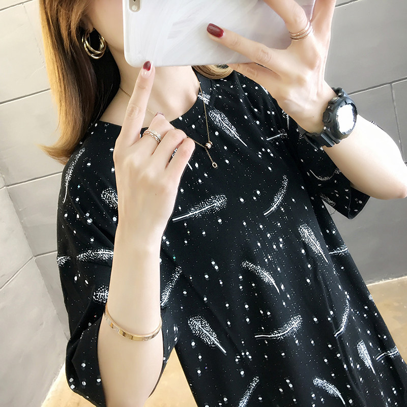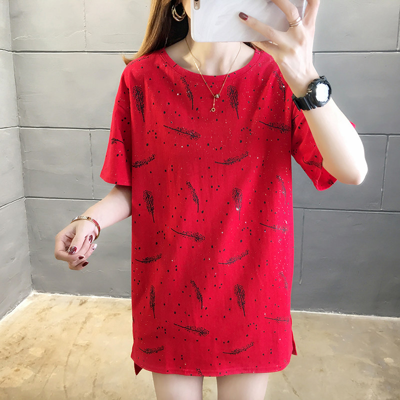35棉65涤韩版印花宽松中长款亮片短袖T恤女潮夏实拍