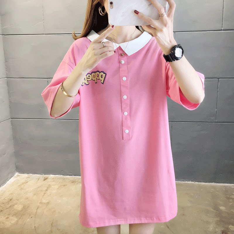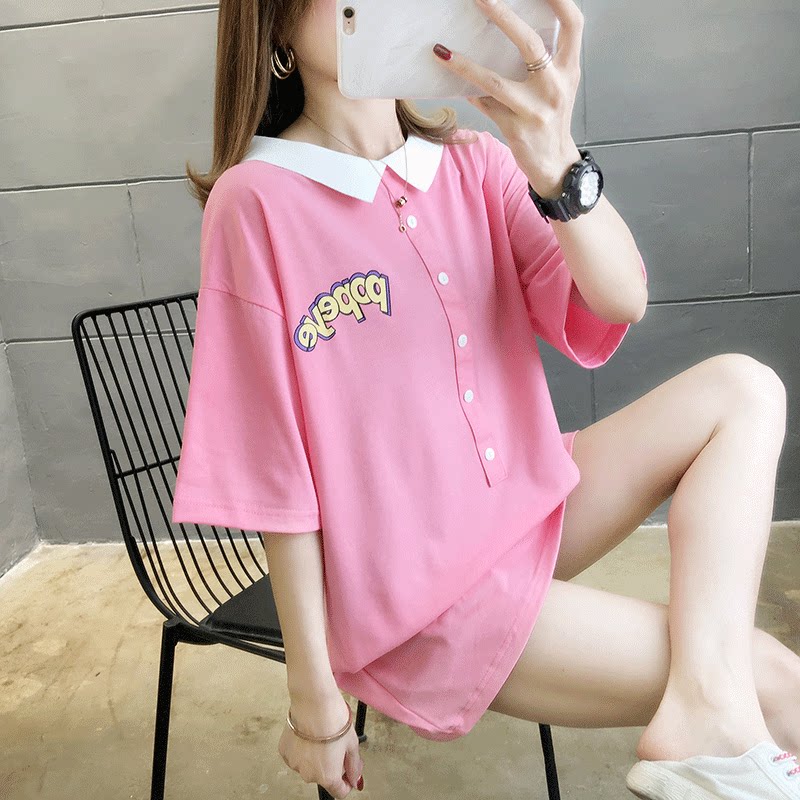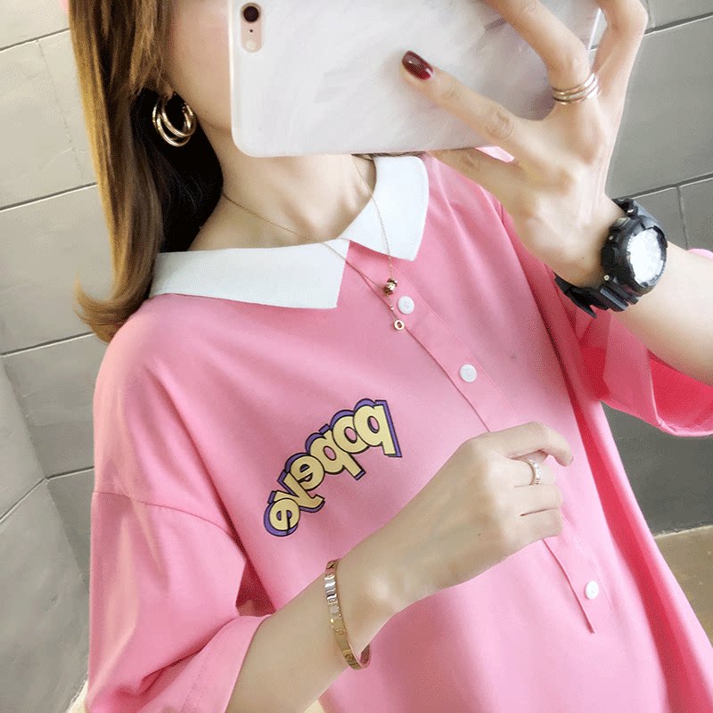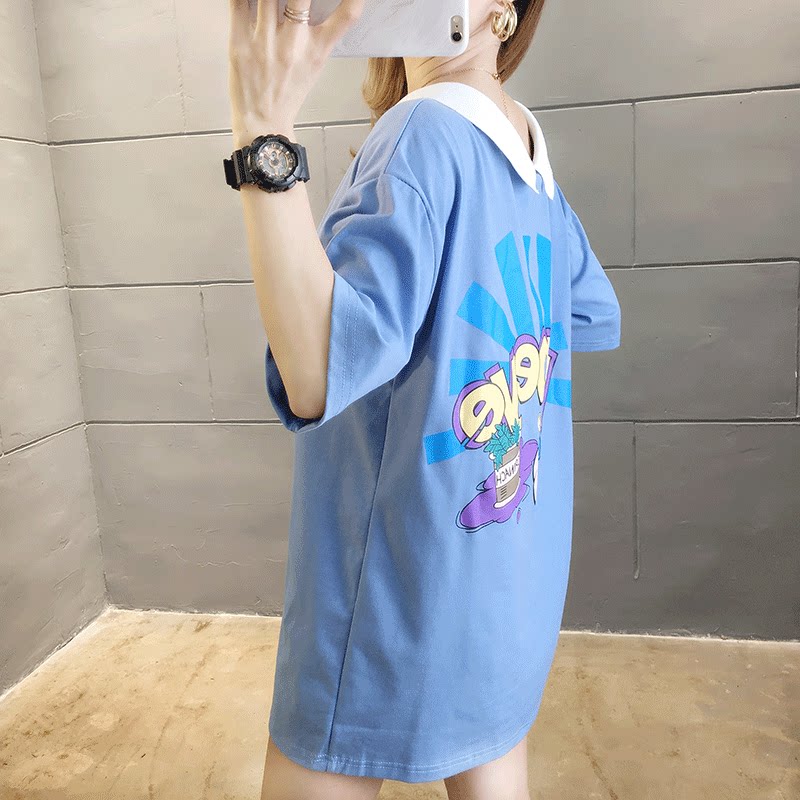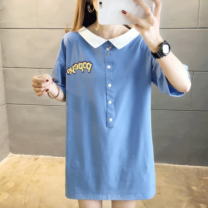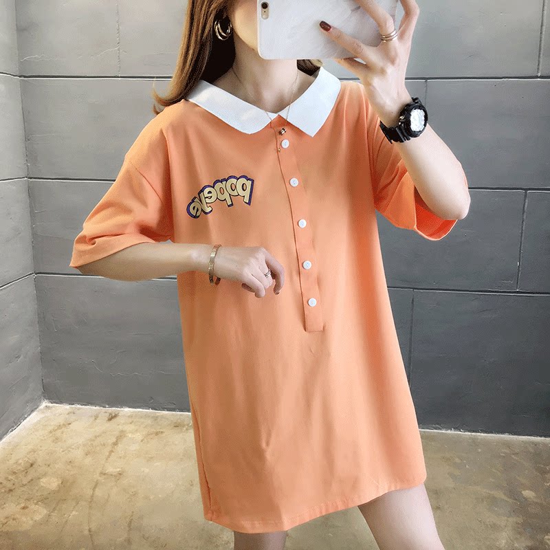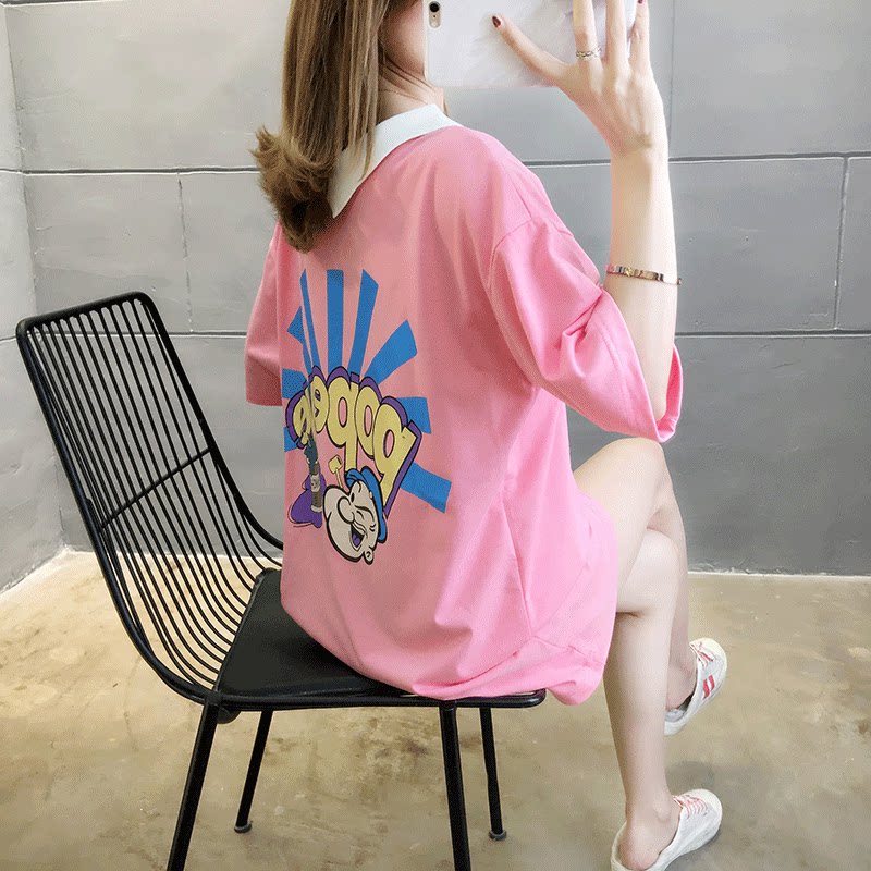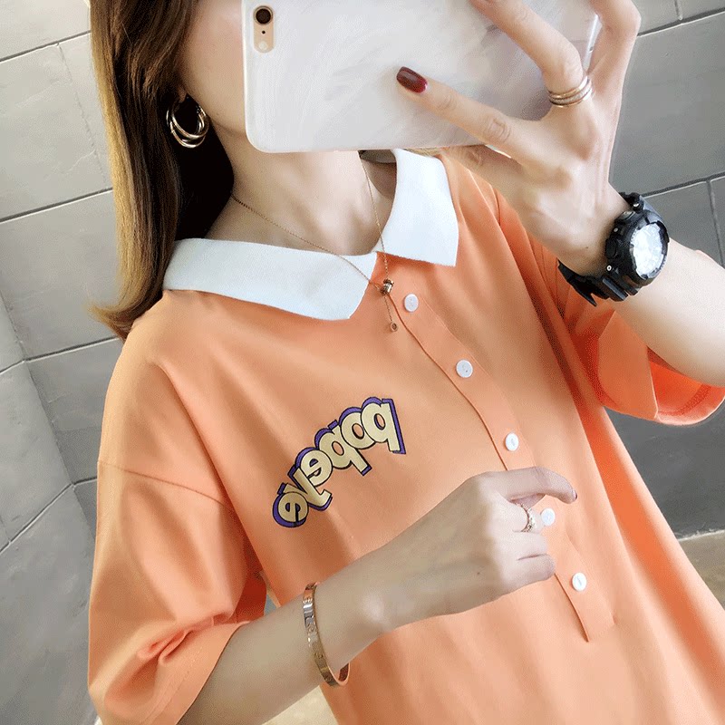 35棉65涤韩版印花宽松中长款Polo领短袖T恤女潮夏实拍