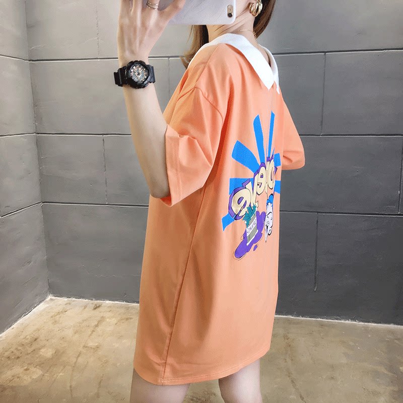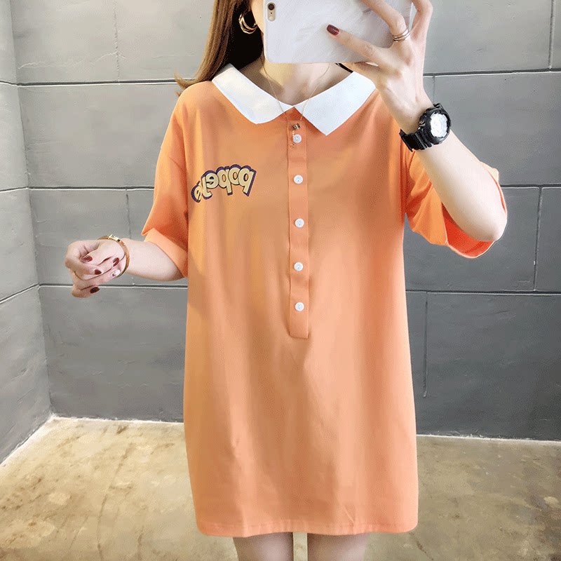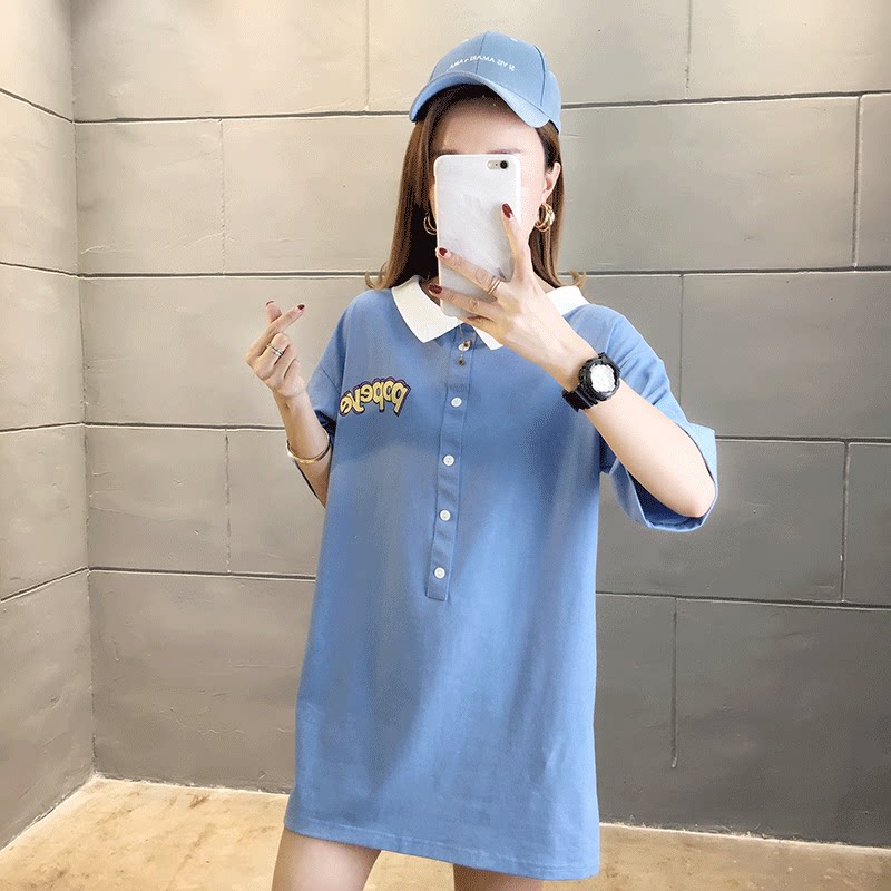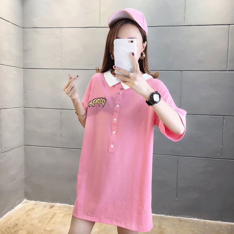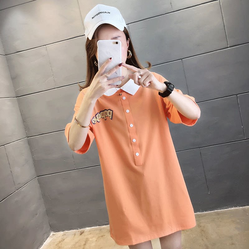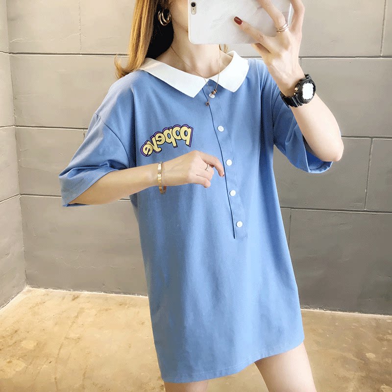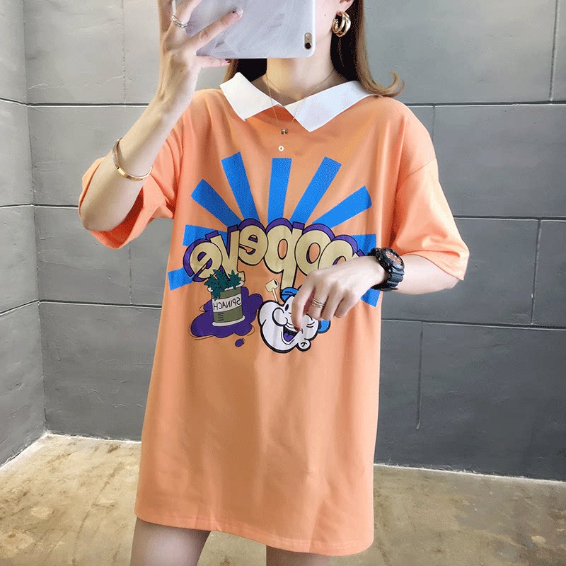 35棉65涤韩版印花宽松中长款Polo领短袖T恤女潮夏实拍