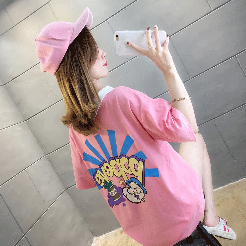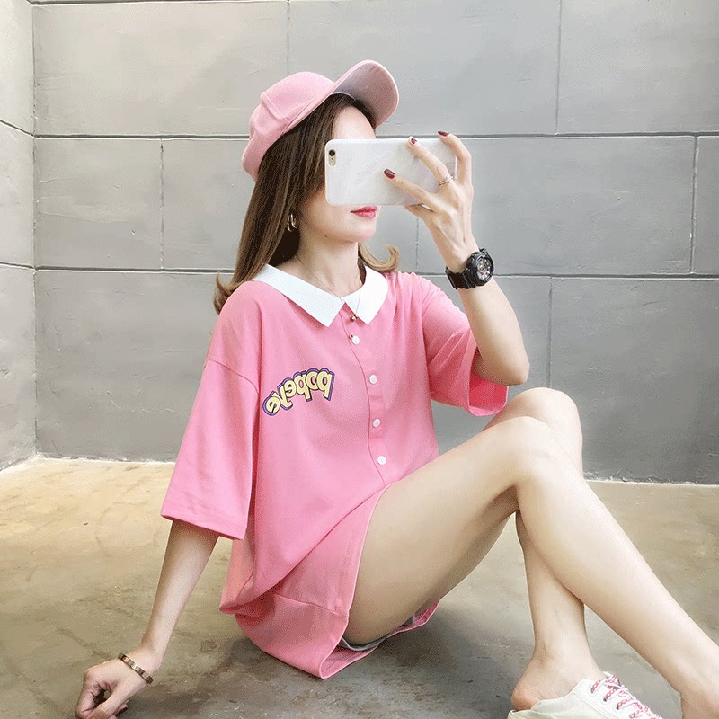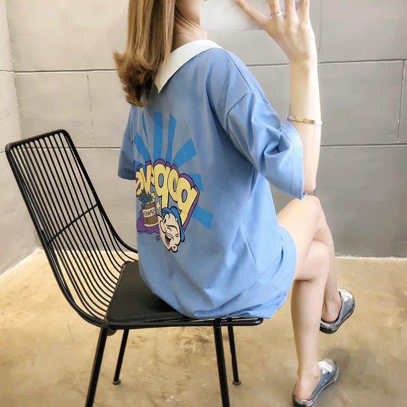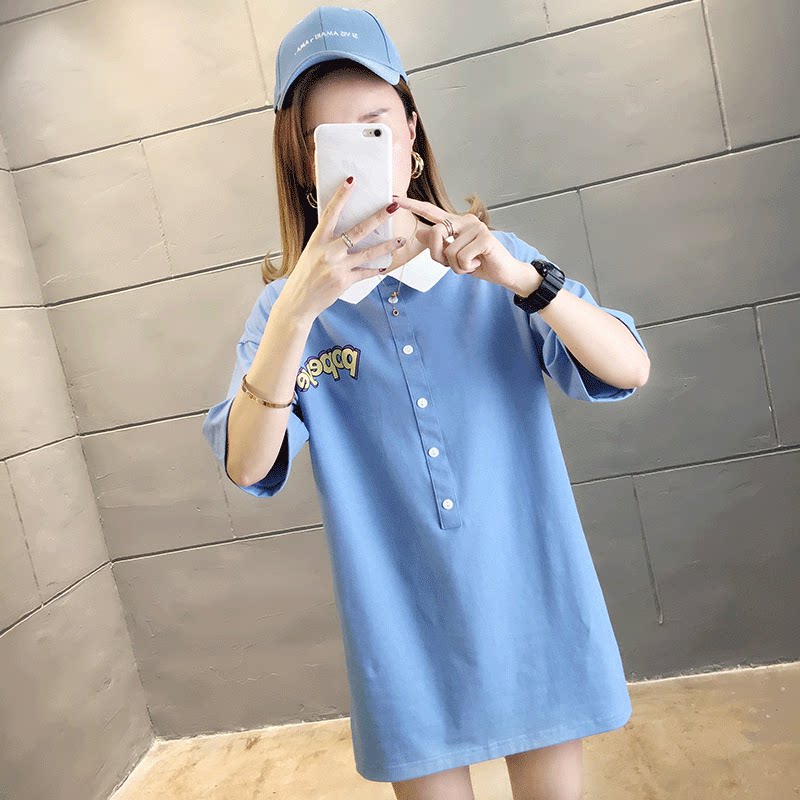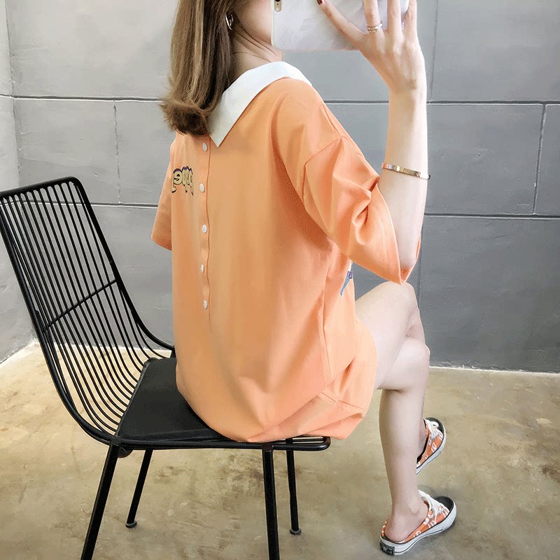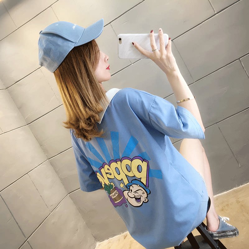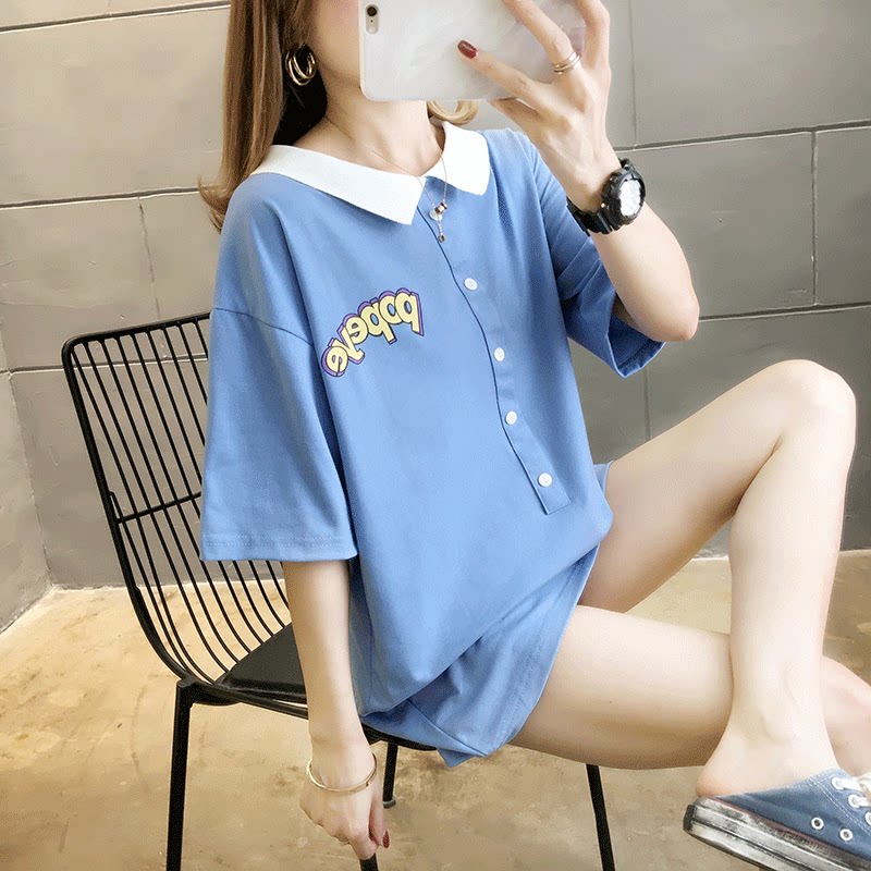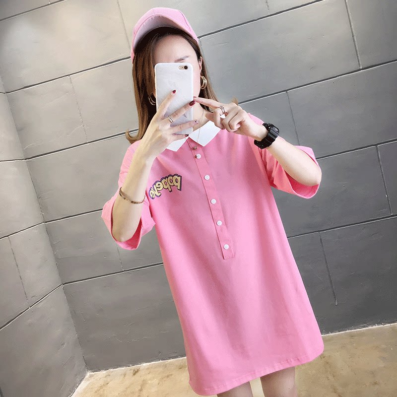 35棉65涤韩版印花宽松中长款Polo领短袖T恤女潮夏实拍