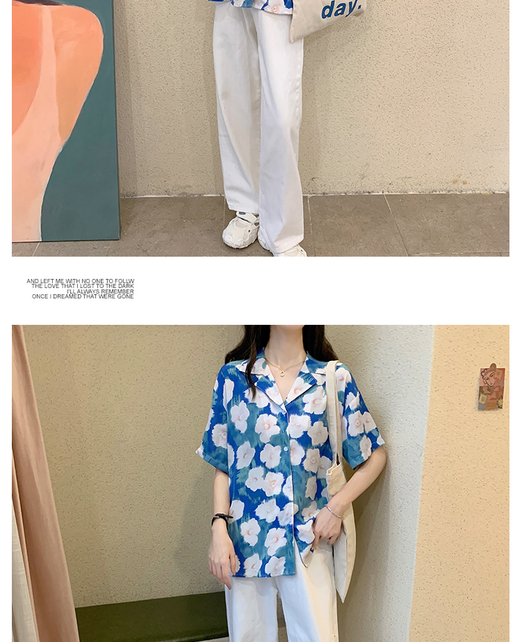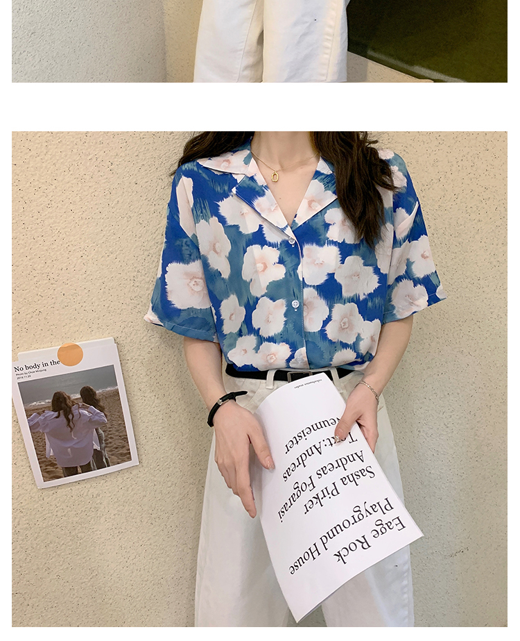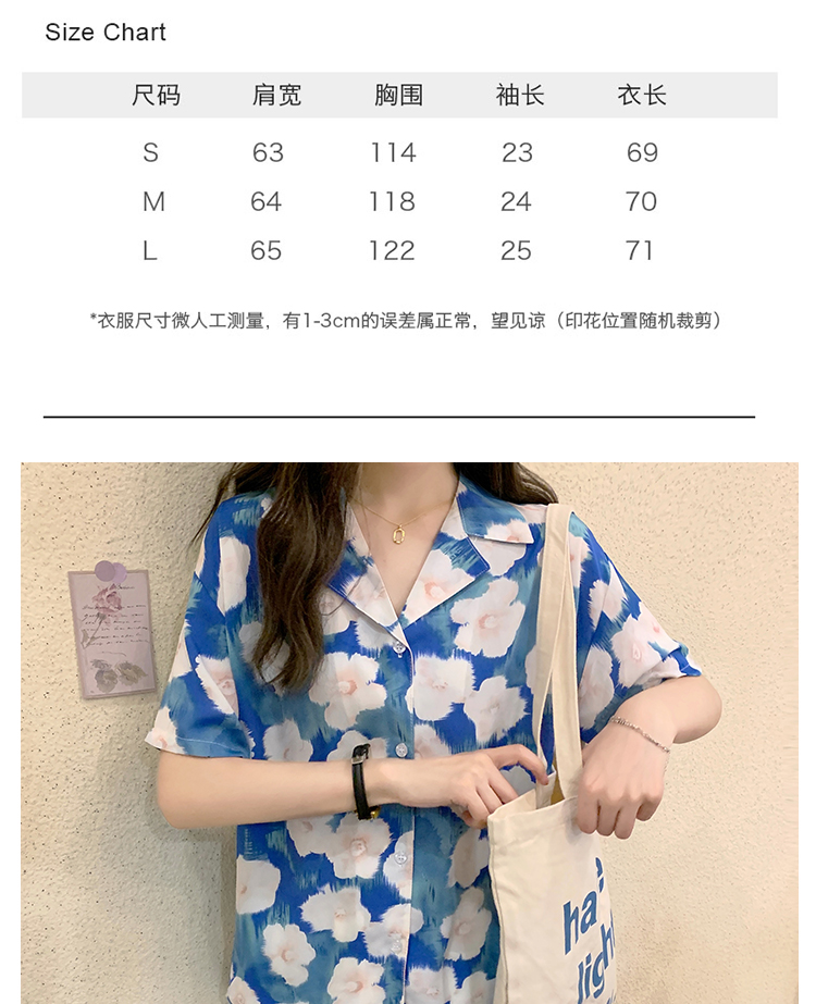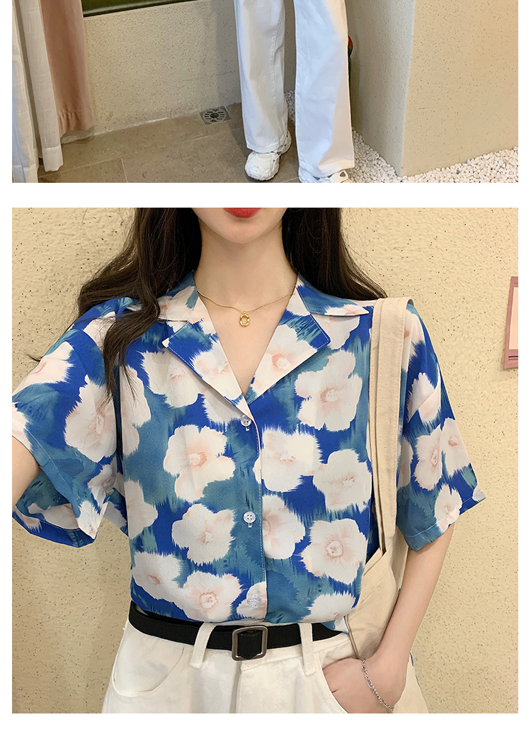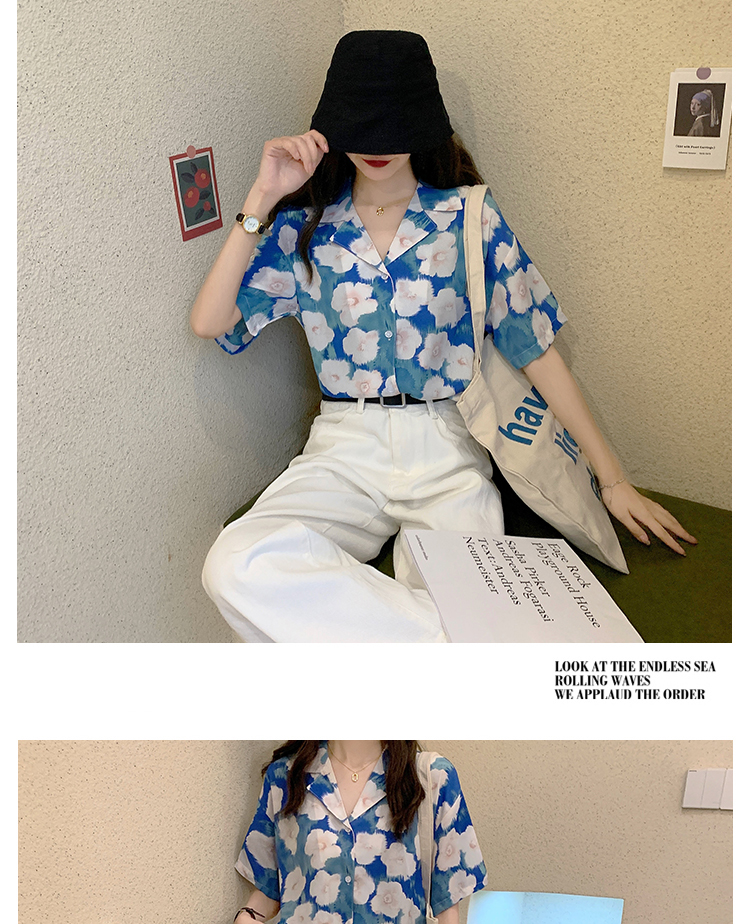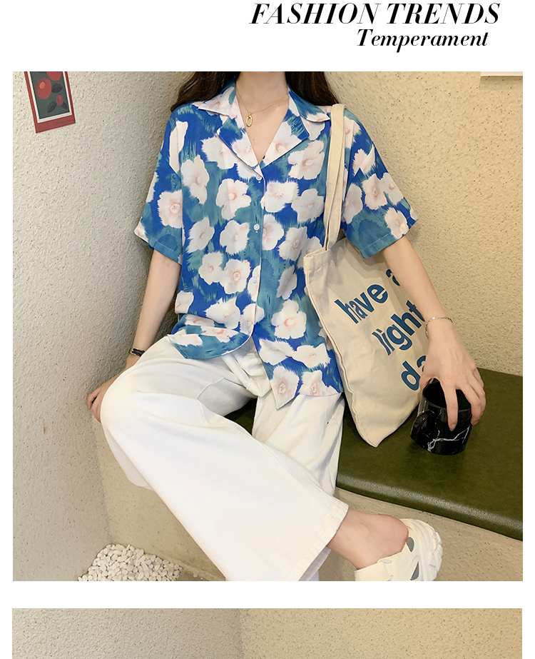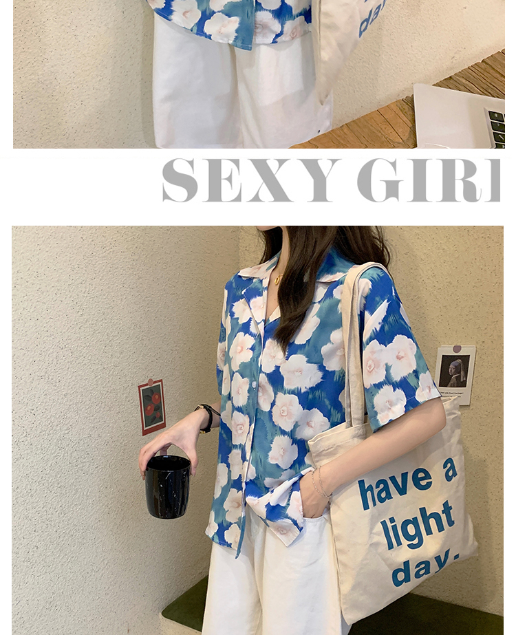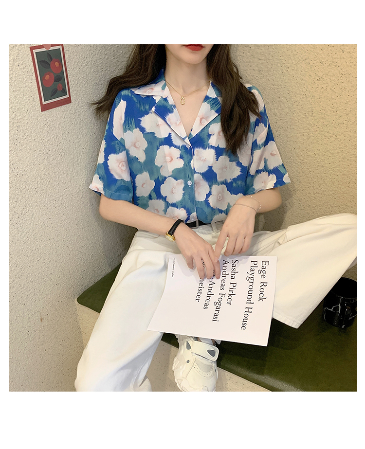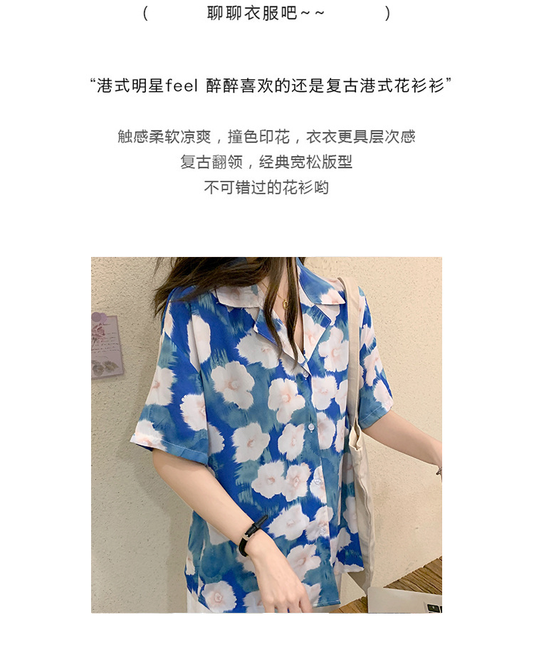 2021夏季新款港味复古设计感小众印花宽松百搭短袖上衣衬衫女