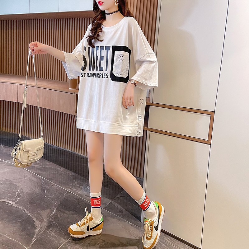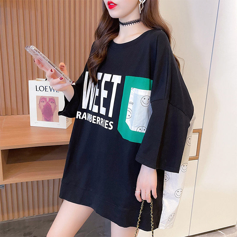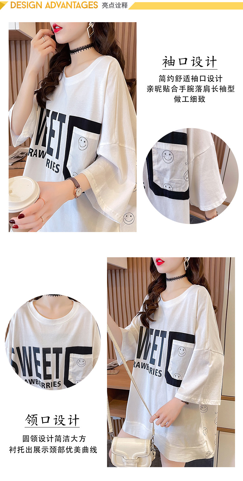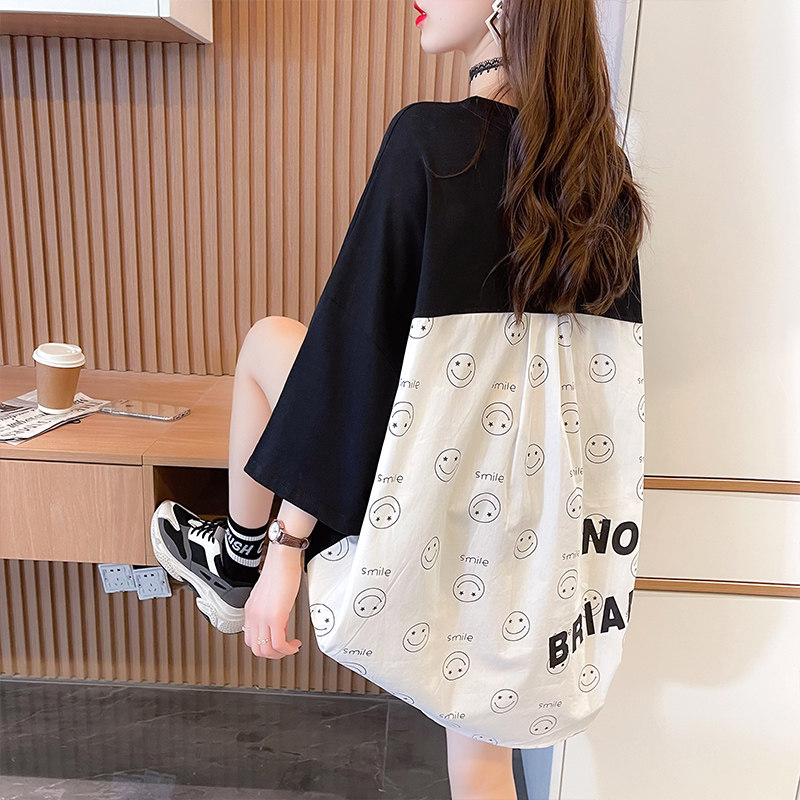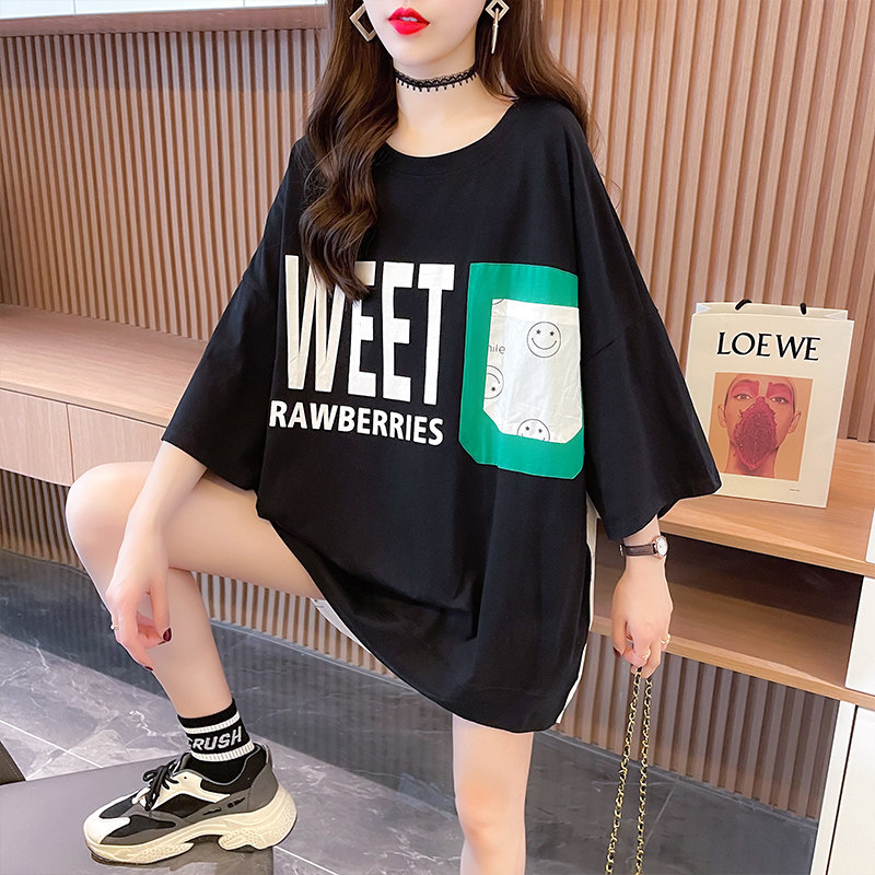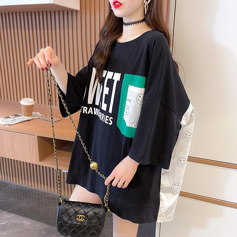实拍 6535棉新款口袋撞色中长款拼接短袖t恤女大码女装上衣服