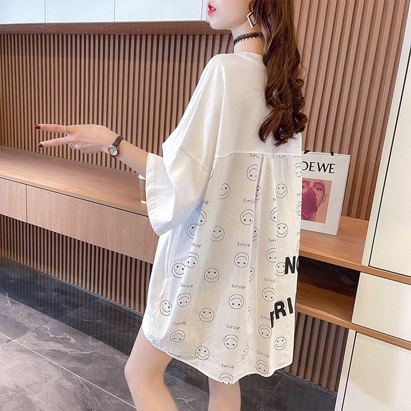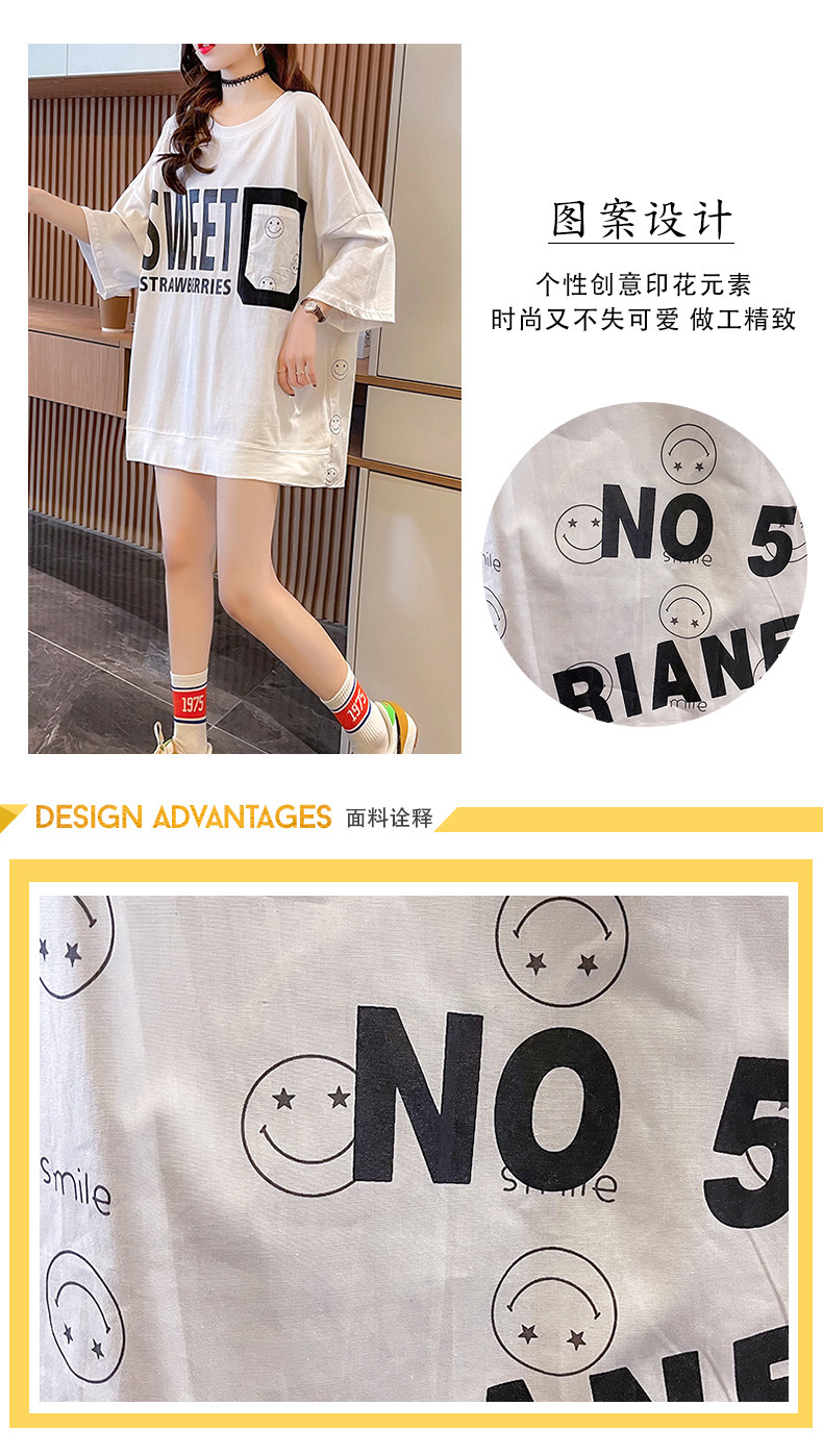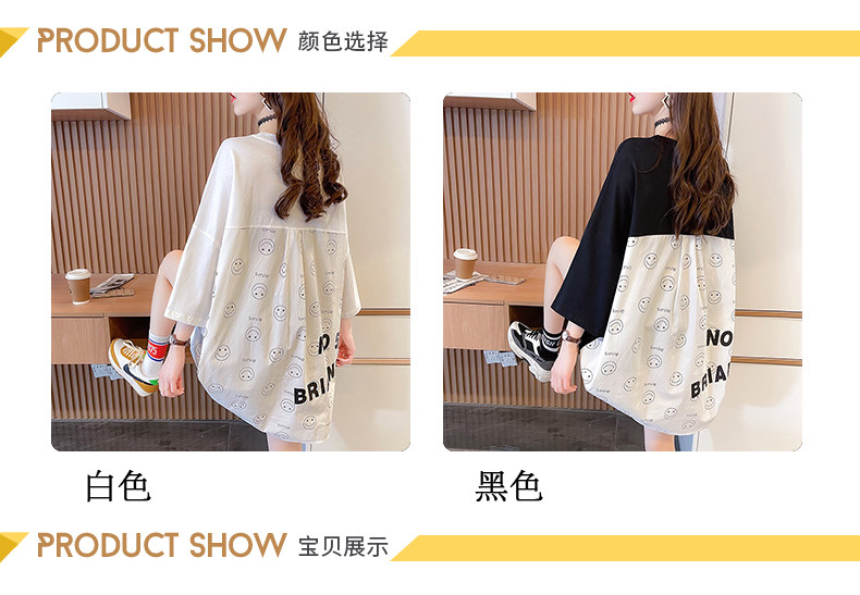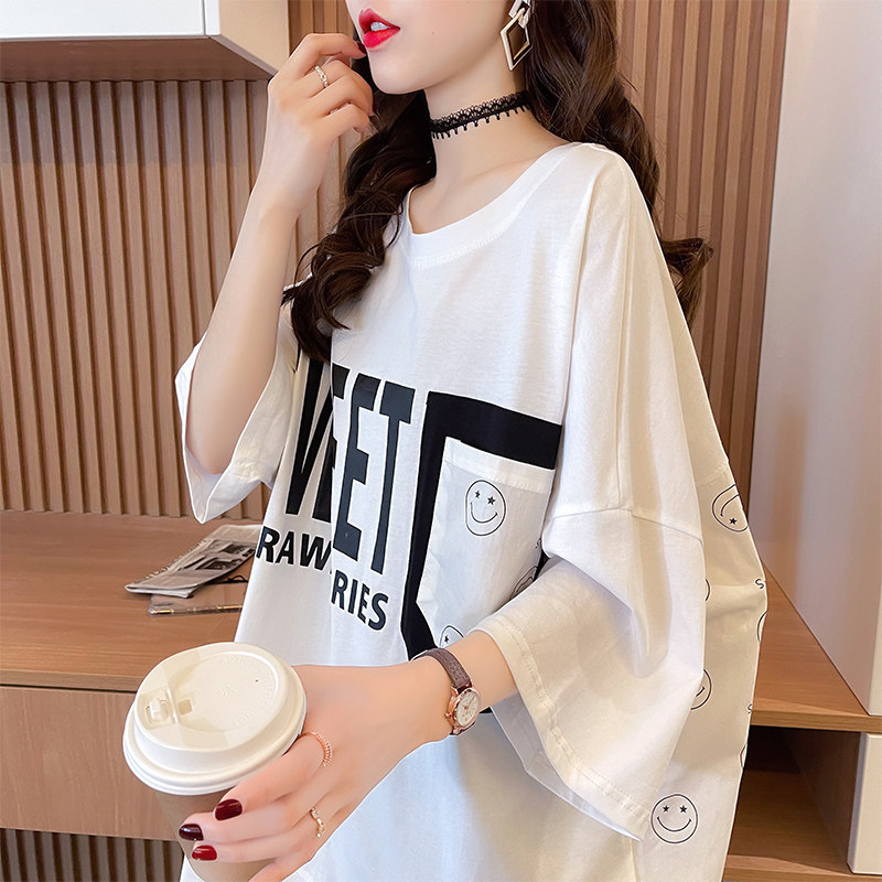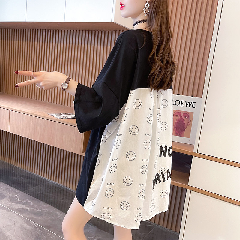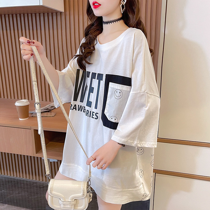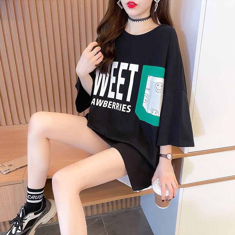 实拍 6535棉新款口袋撞色中长款拼接短袖t恤女大码女装上衣服