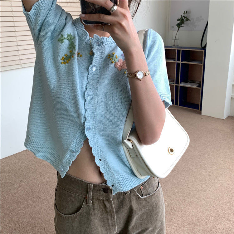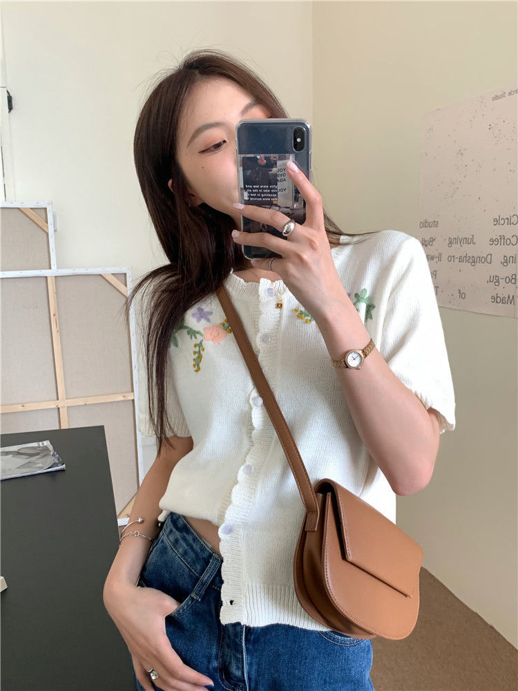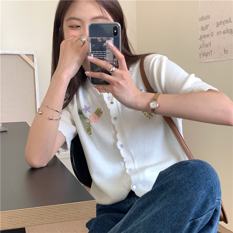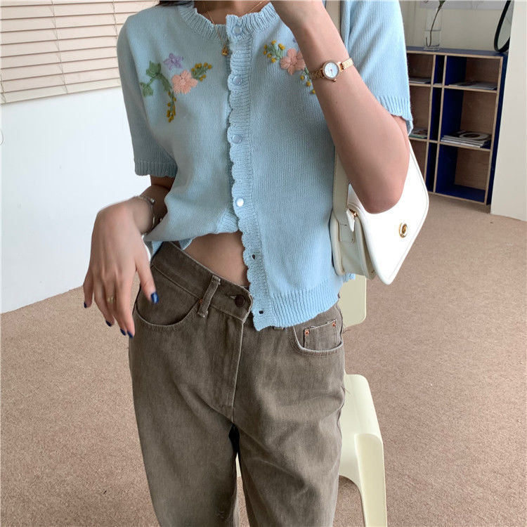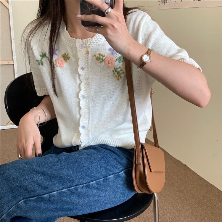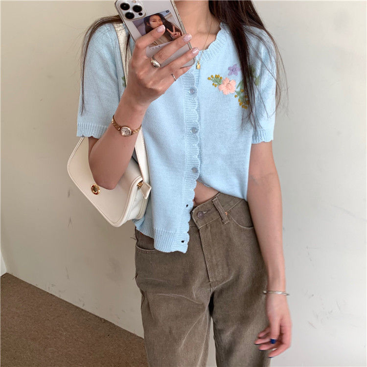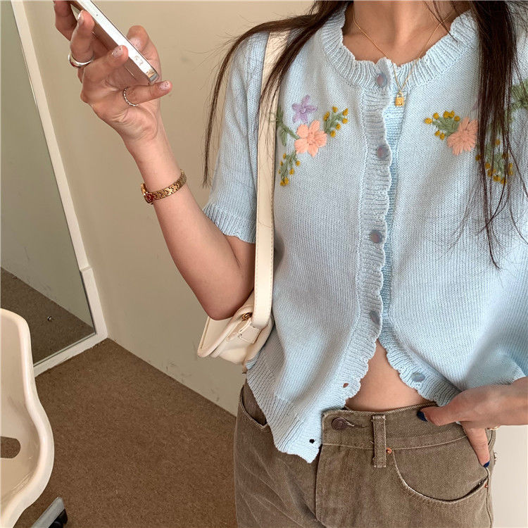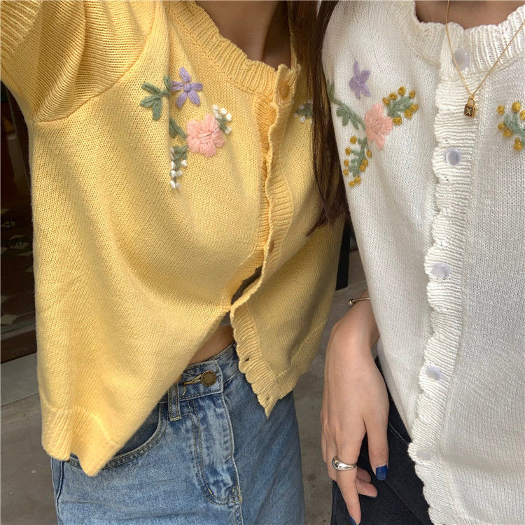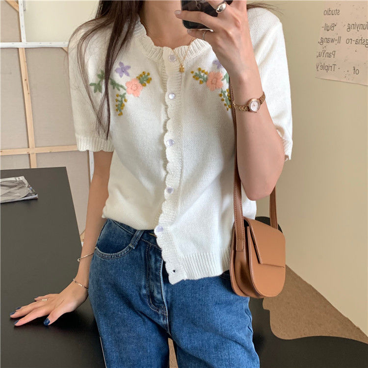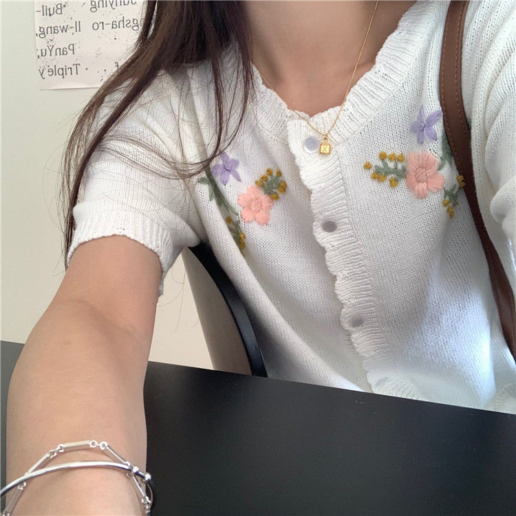 官方图甜美气质百搭针织开衫女薄款新款温柔风花朵刺绣圆领上衣
