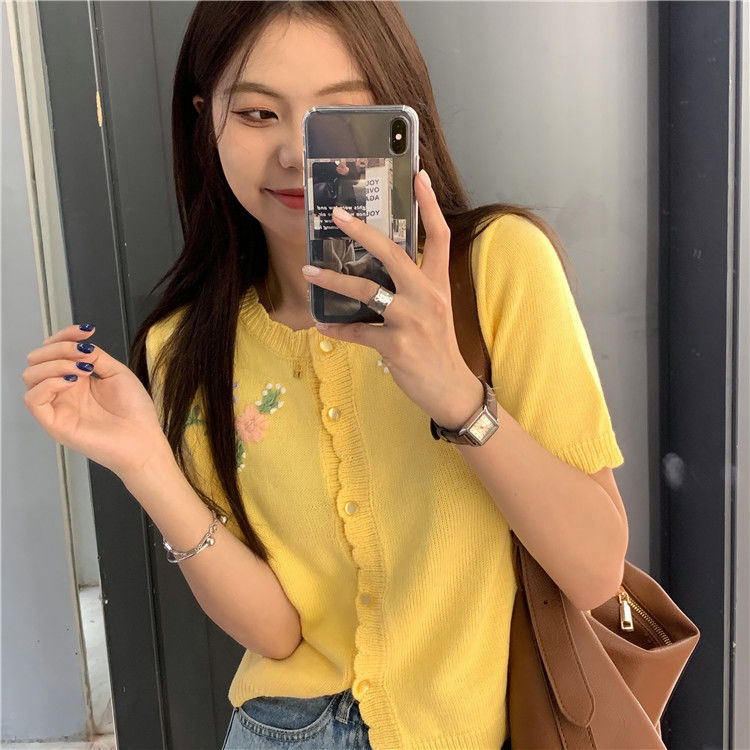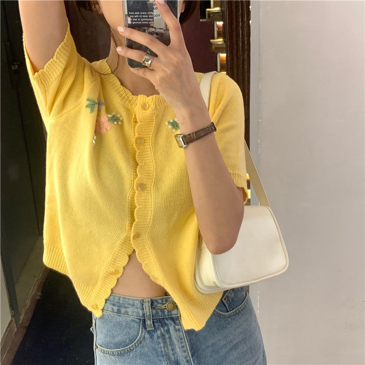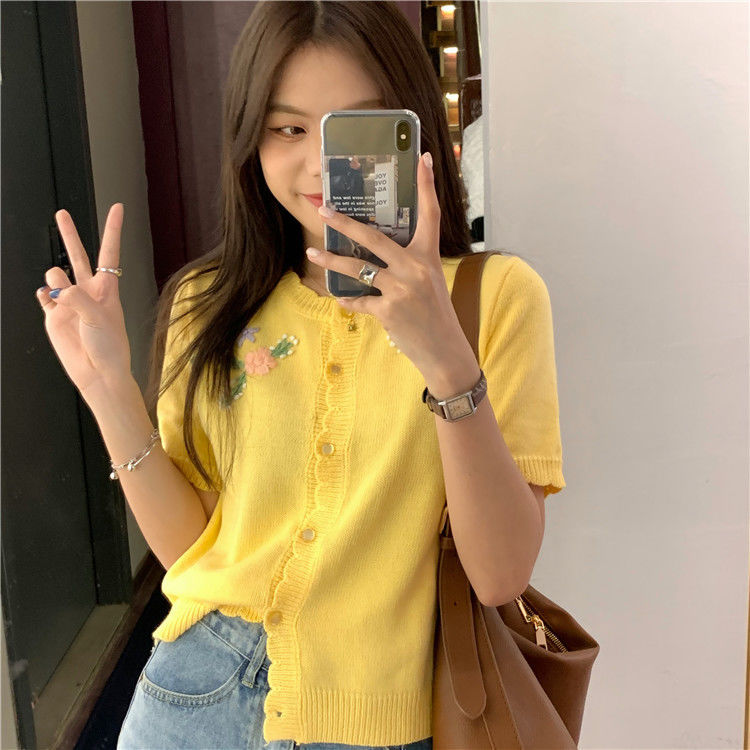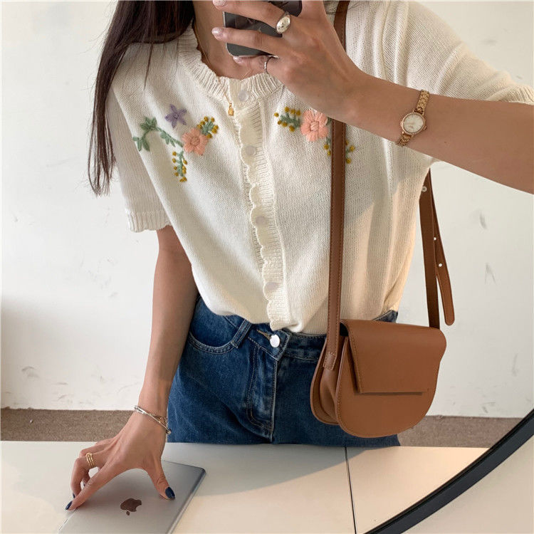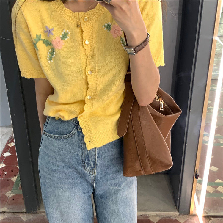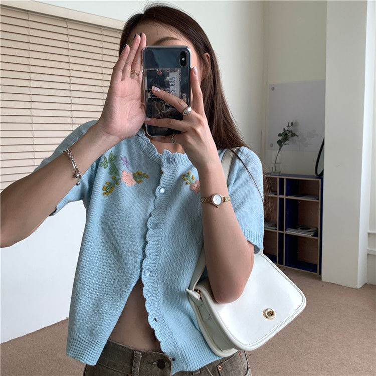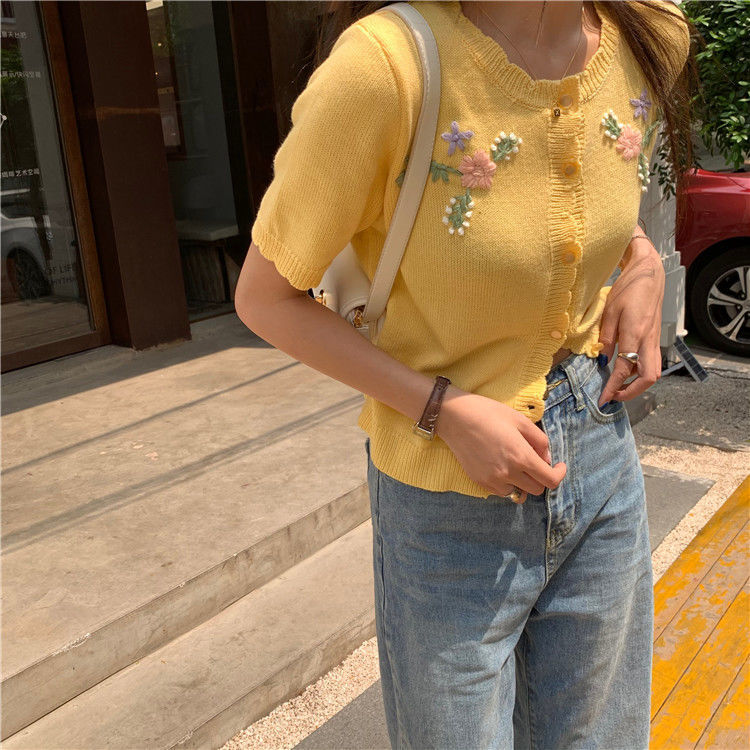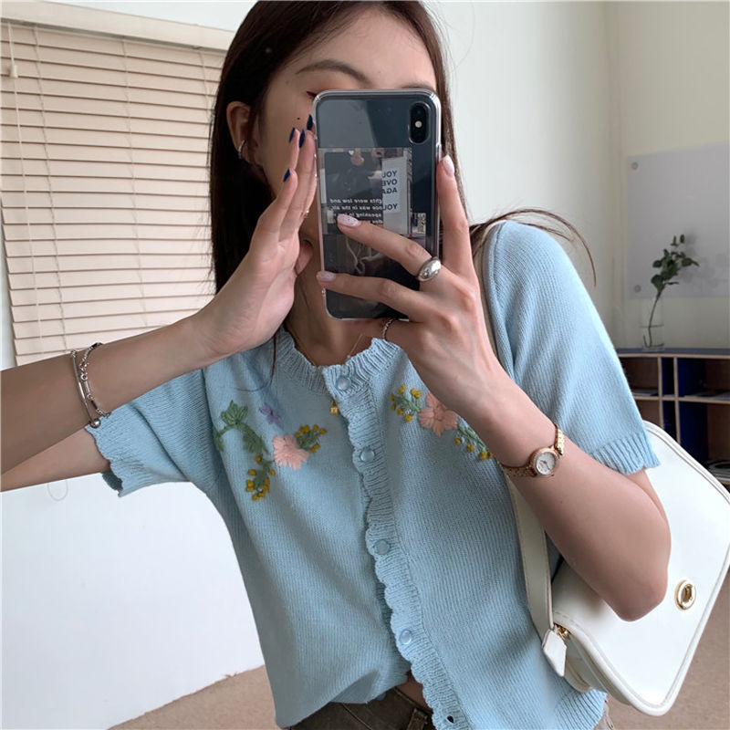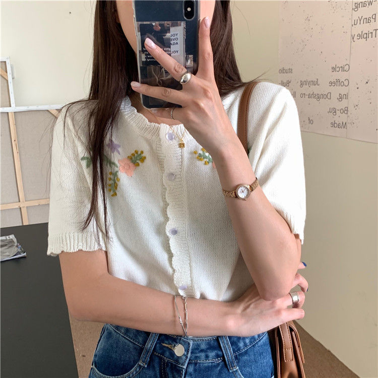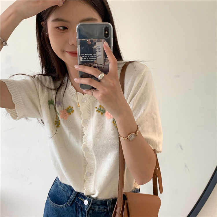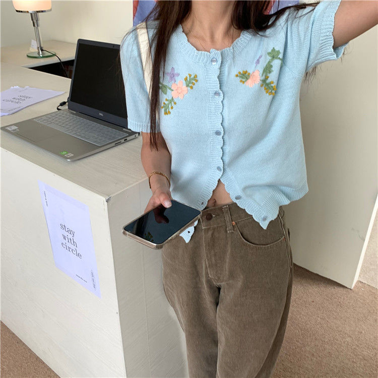 官方图甜美气质百搭针织开衫女薄款新款温柔风花朵刺绣圆领上衣