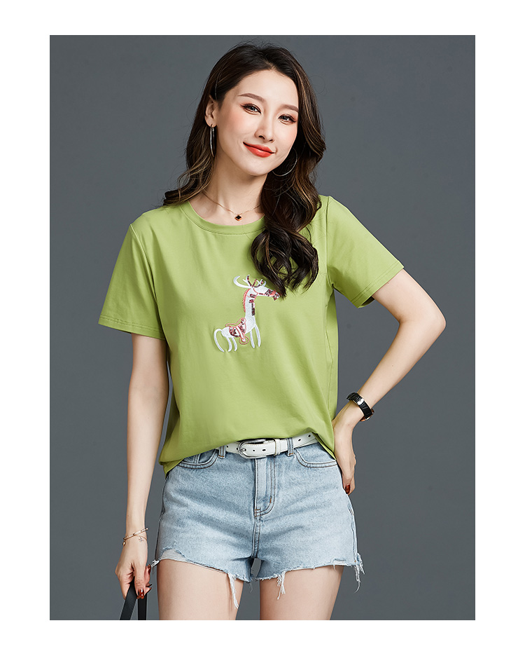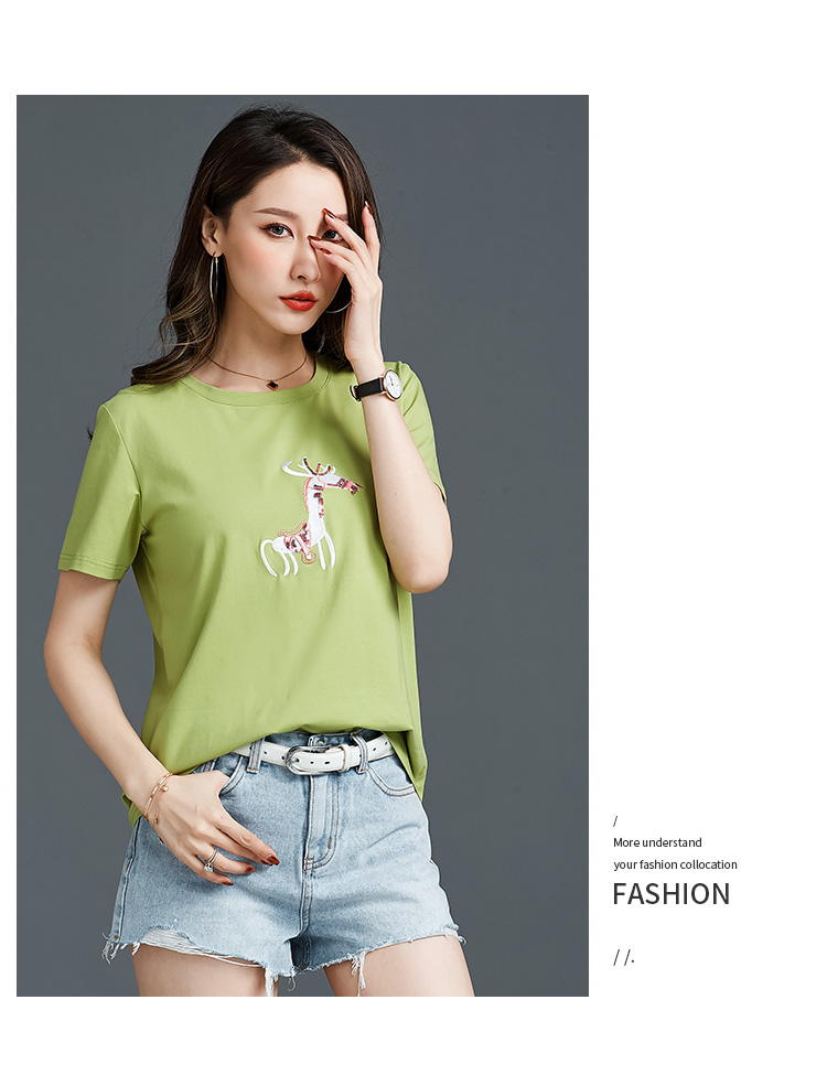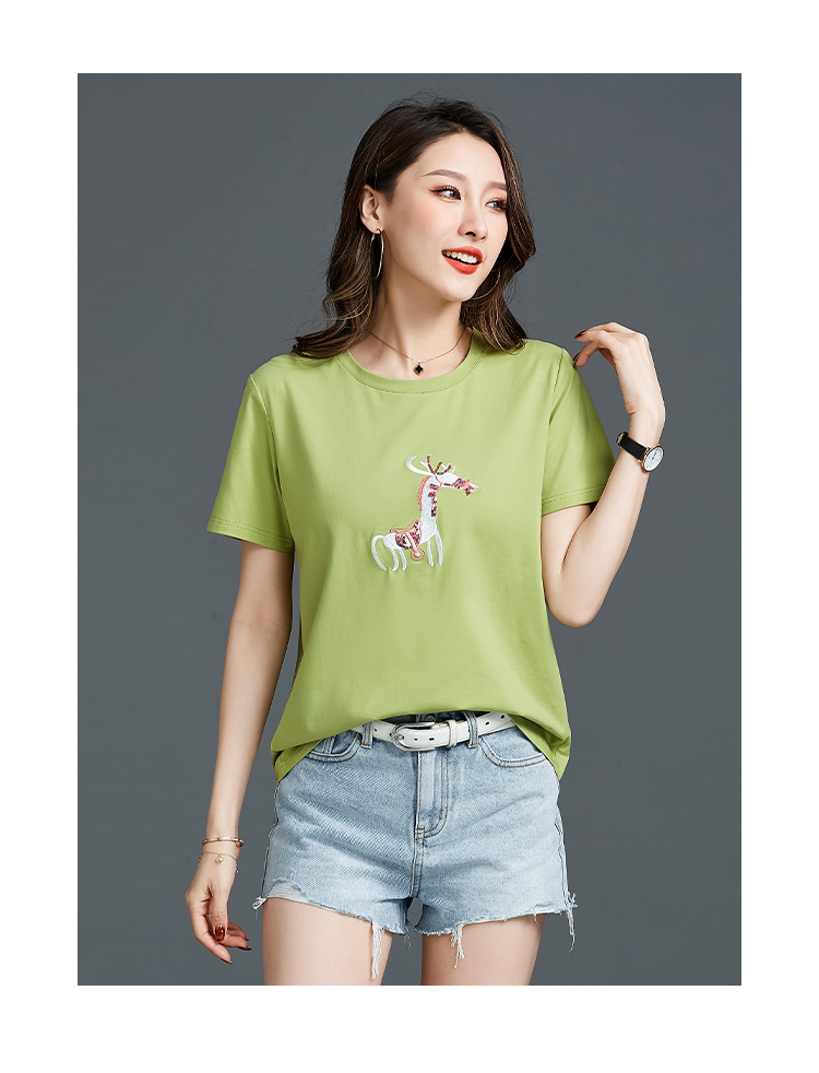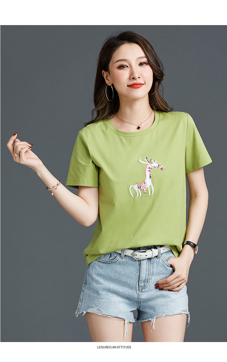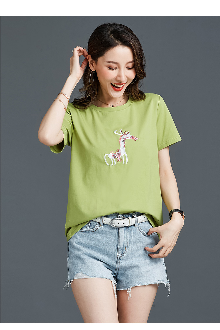 常规短袖 实拍2021夏新款绣花小鹿简约时尚t恤女装100%棉韩版宽松