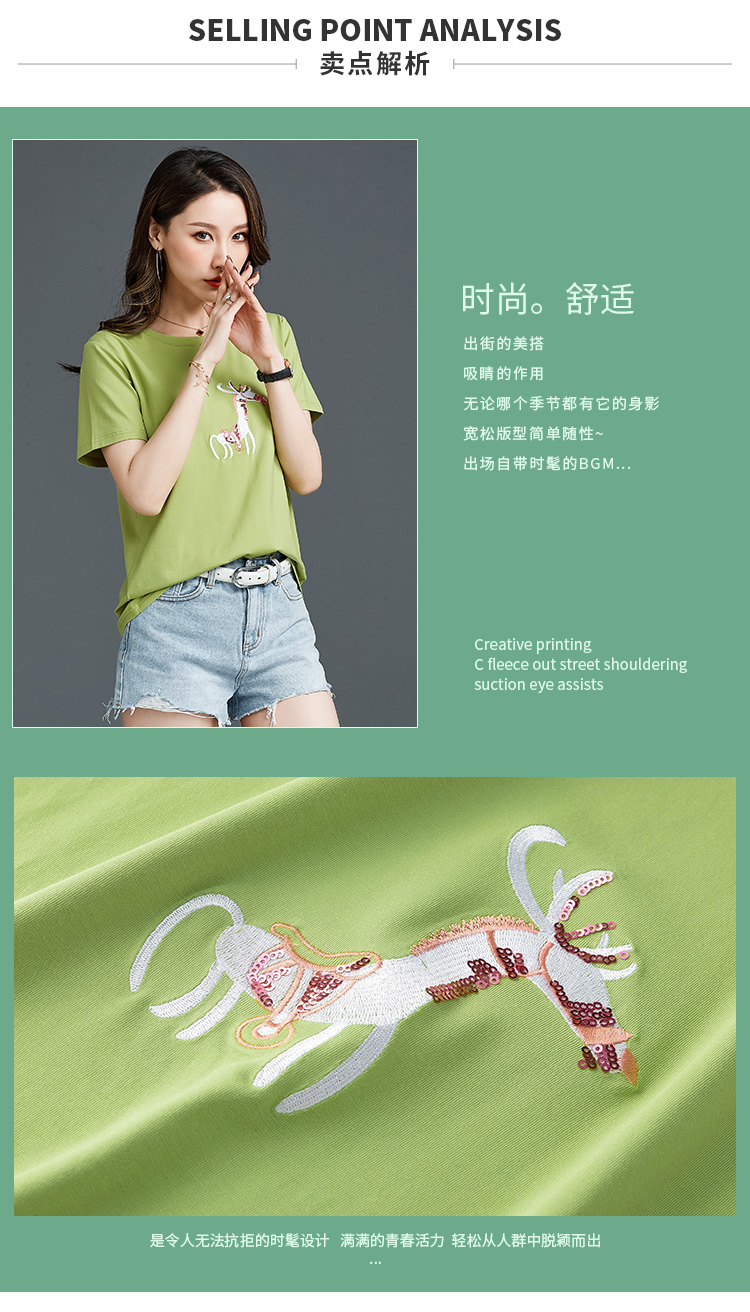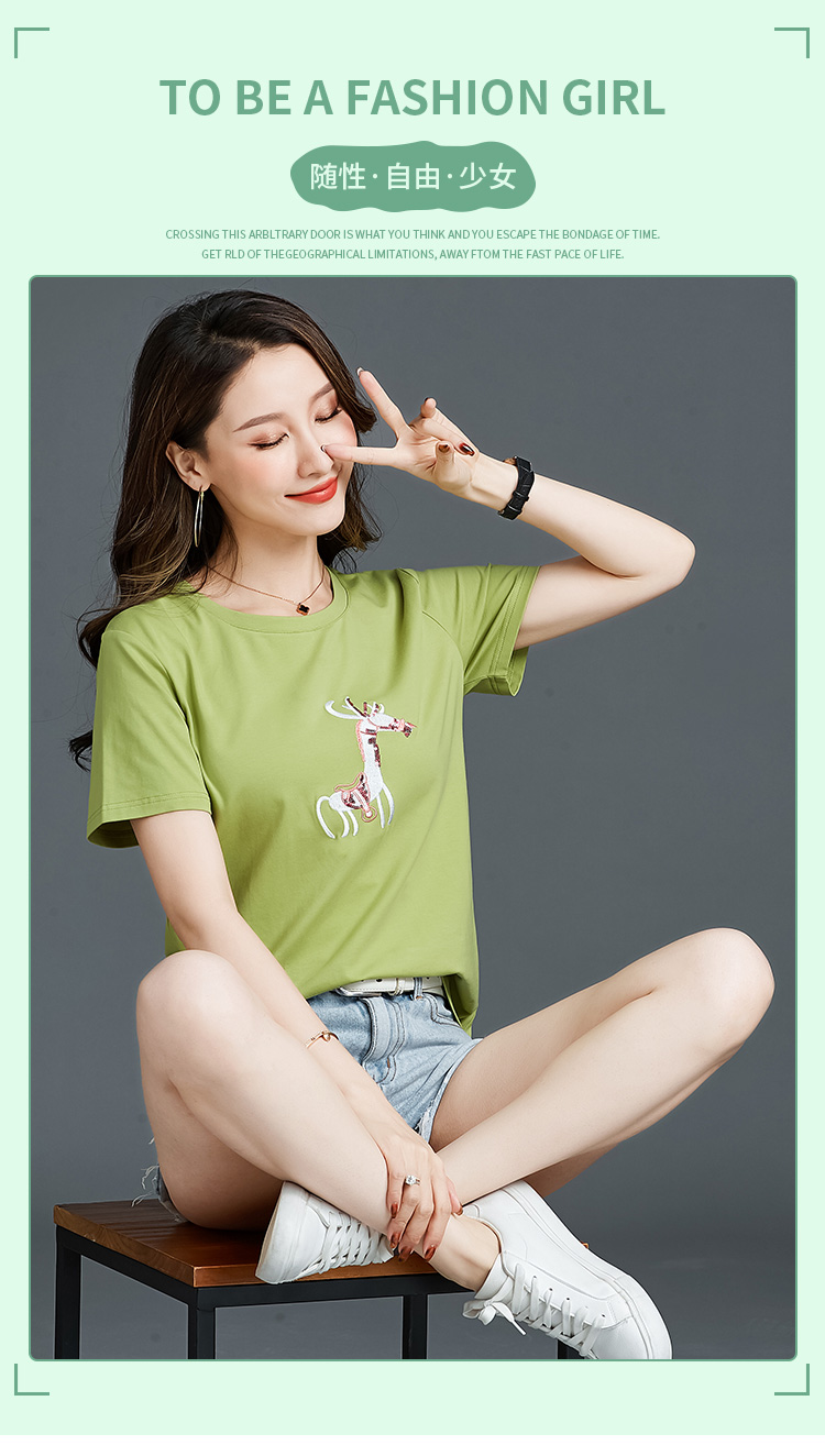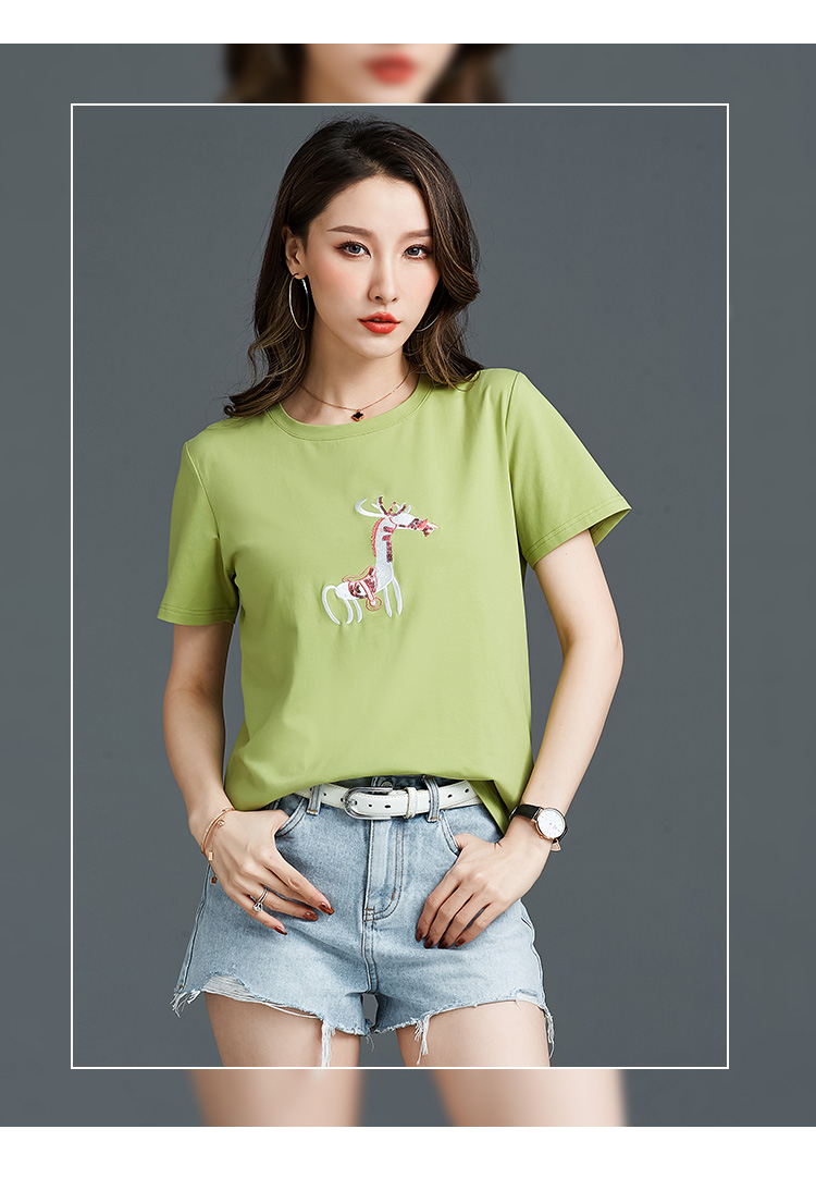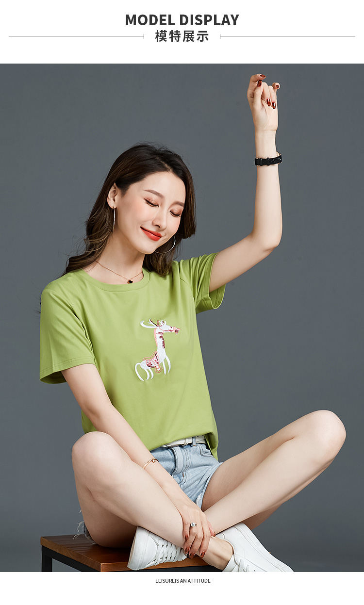 常规短袖 实拍2021夏新款绣花小鹿简约时尚t恤女装100%棉韩版宽松