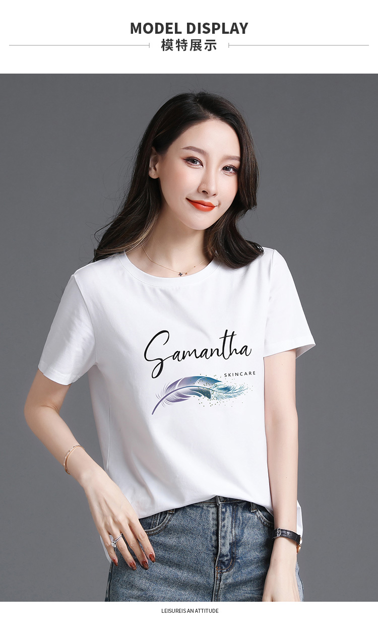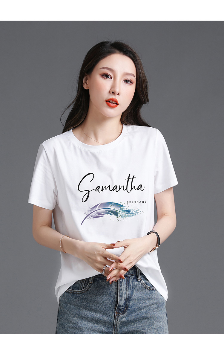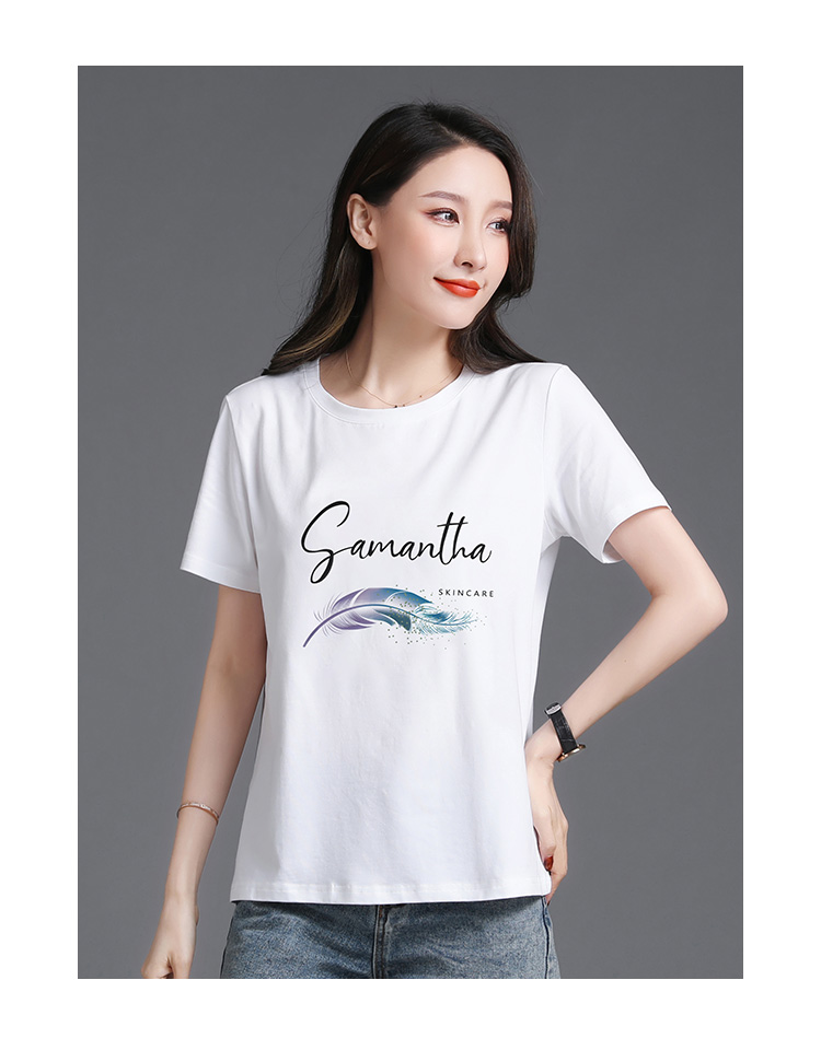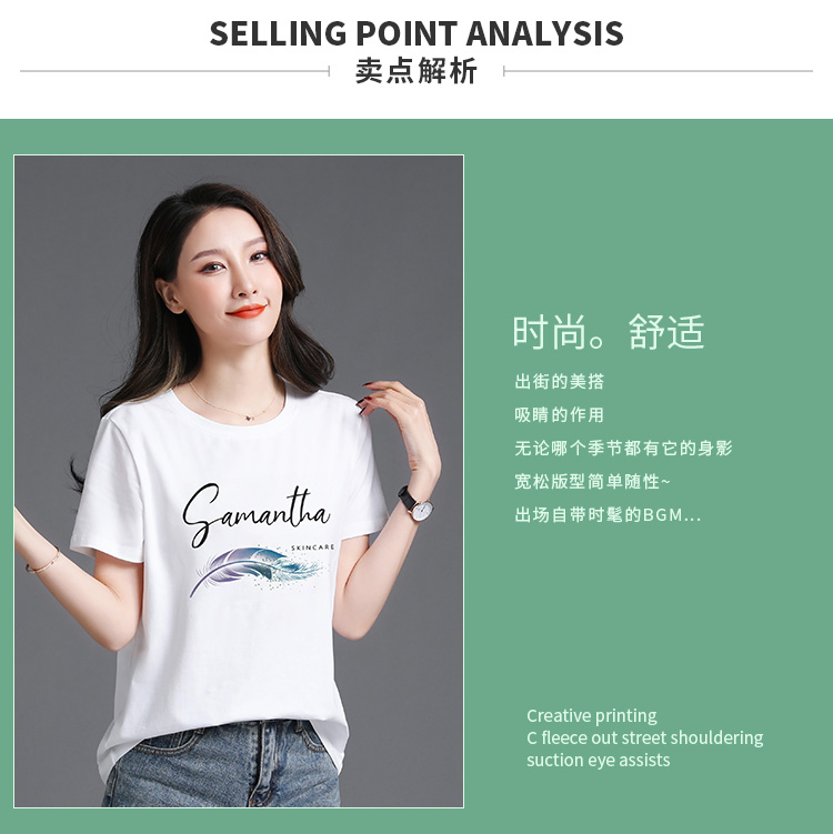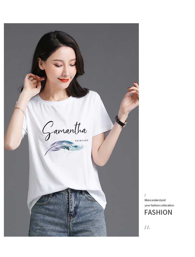 常规短袖实拍2021夏新款印花羽毛简约时尚t恤女100%棉韩版宽松