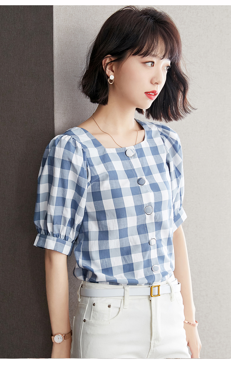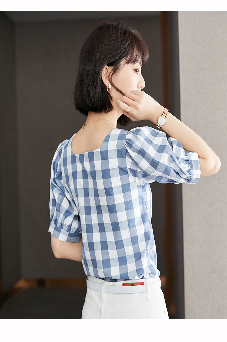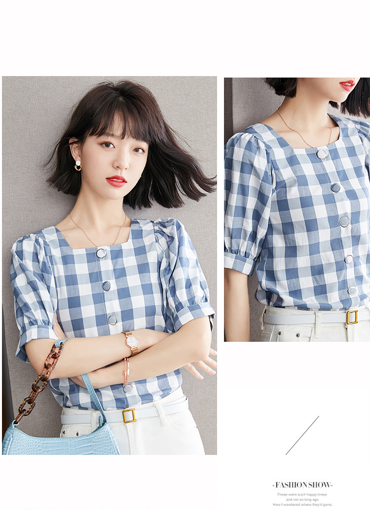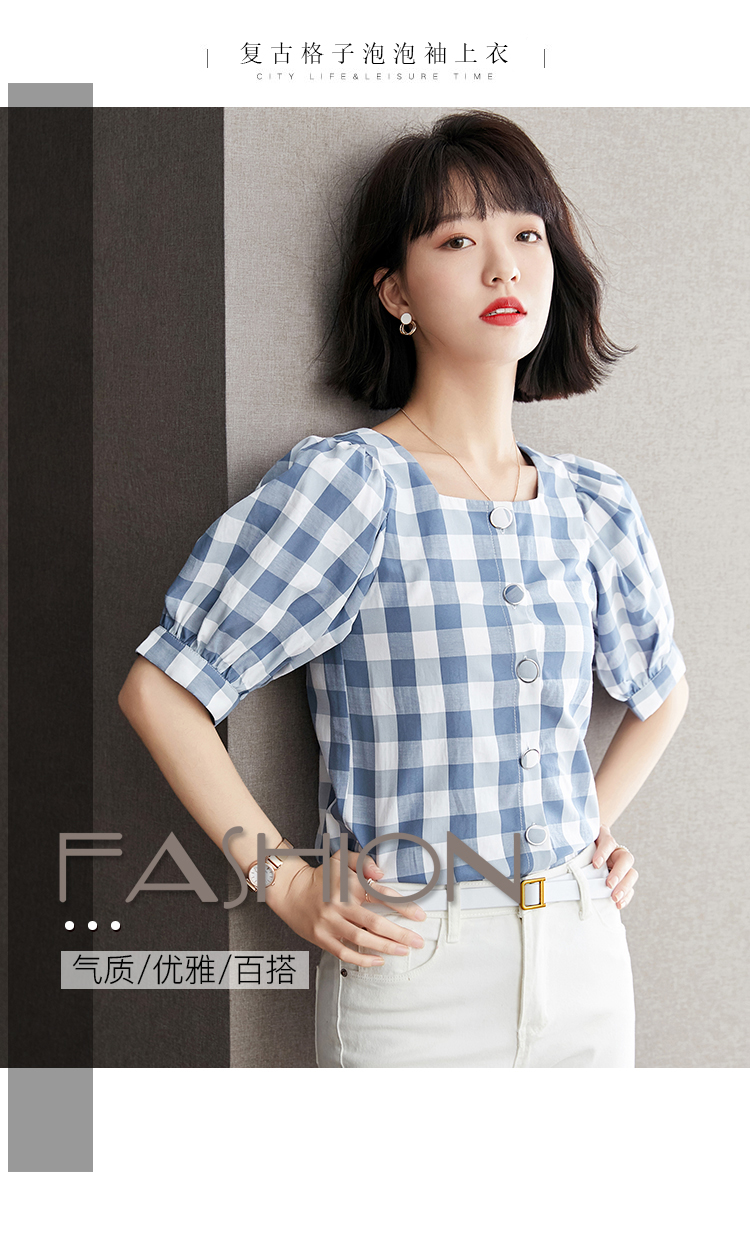 已出货 实拍格子短袖雪纺衫夏装2021新款上衣显瘦泡泡袖
