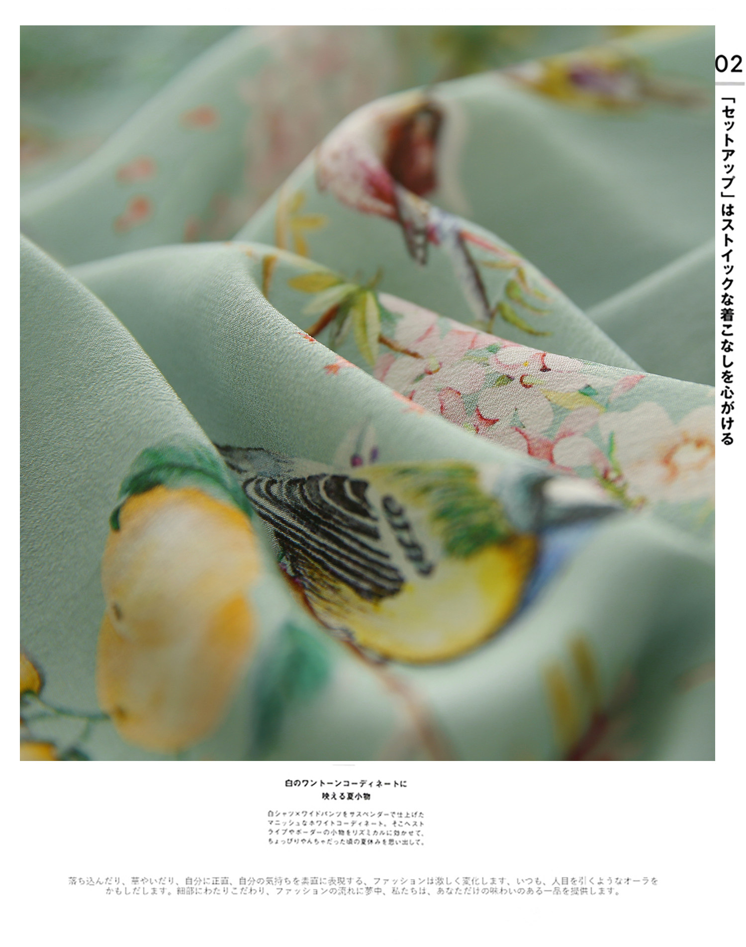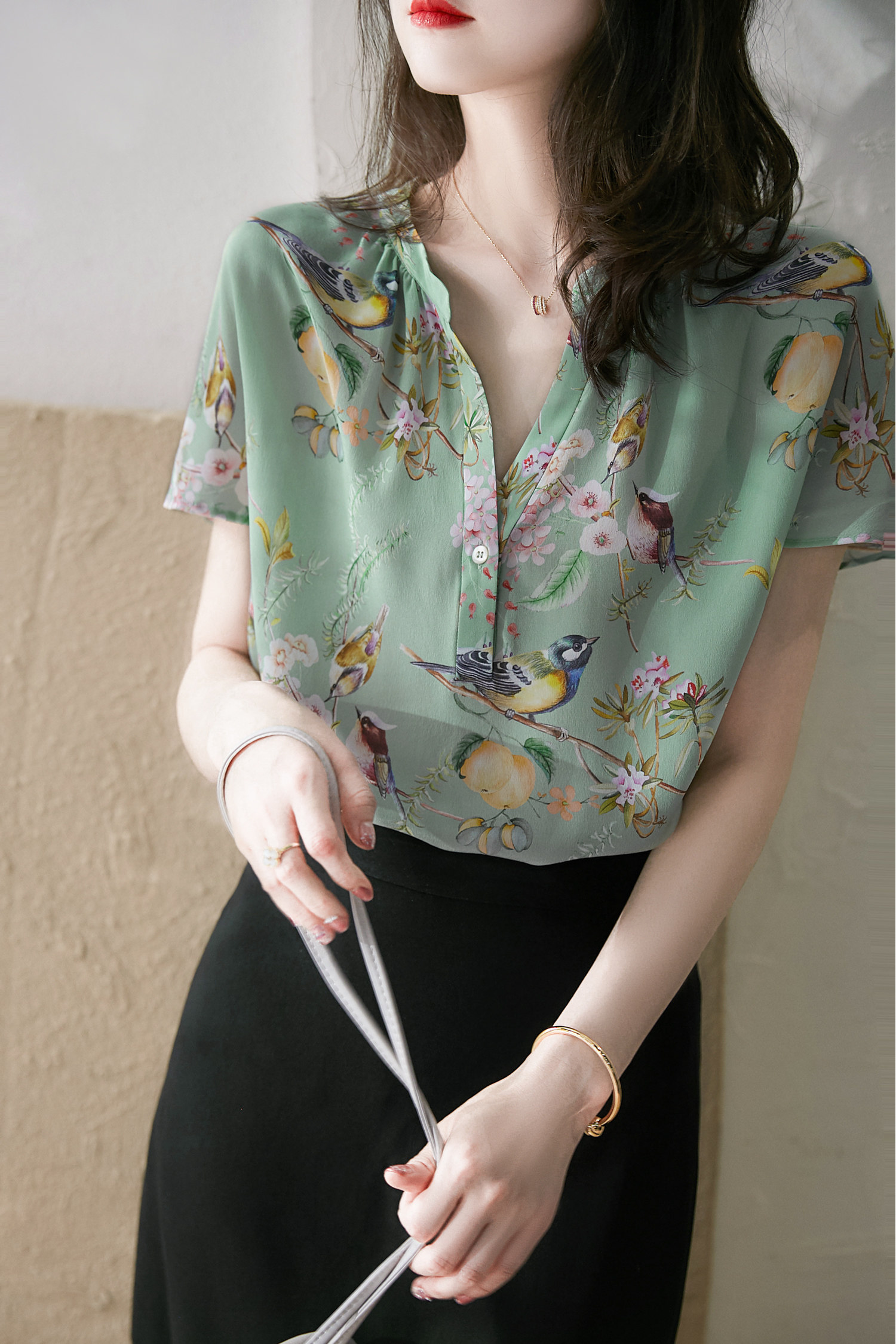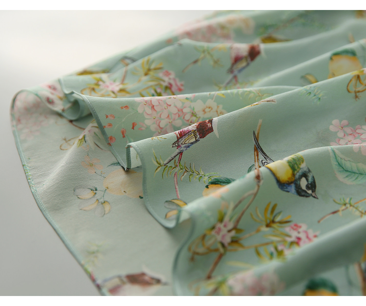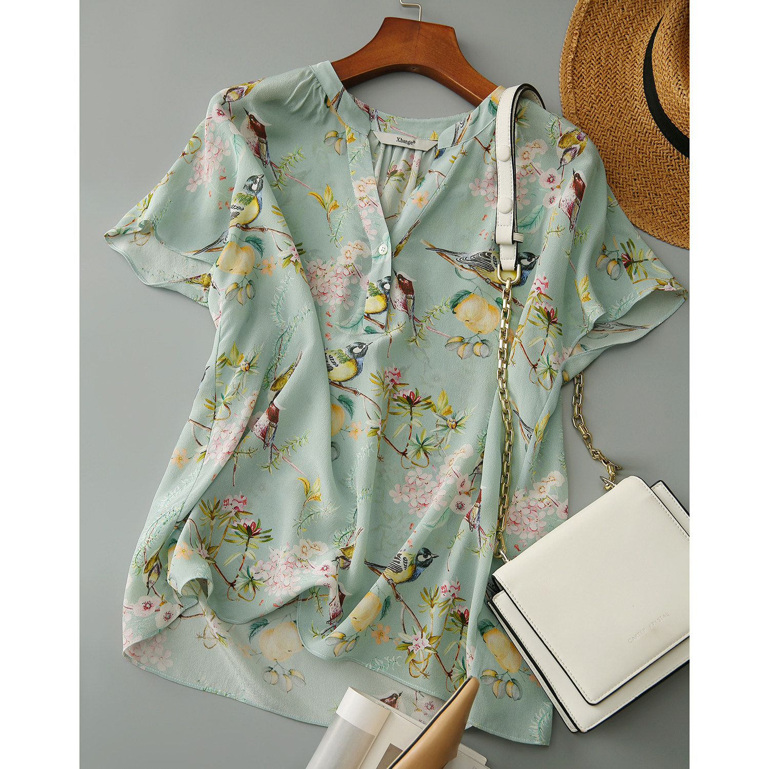 商品名称:[SY316427ML] 笑涵阁 自带清凉感 小清新花鸟印桑蚕丝上衣 面料成分:100%桑蚕丝 洗涤保养:常温手洗/不可漂白/阴凉处悬挂晾干/不可翻转干燥