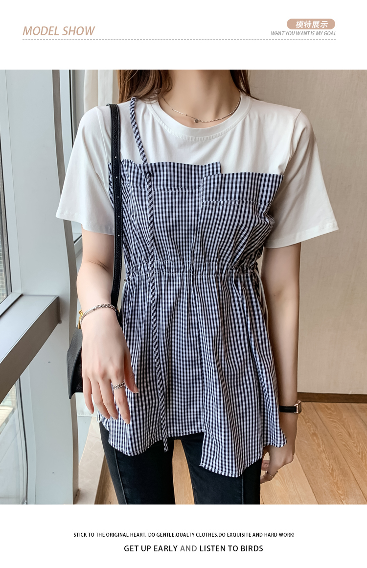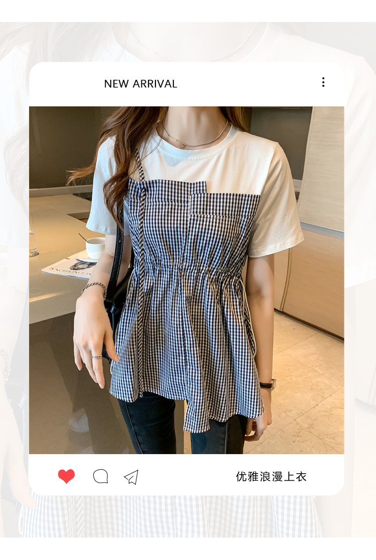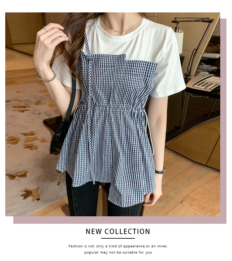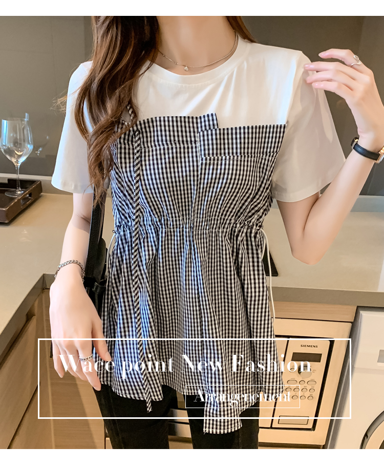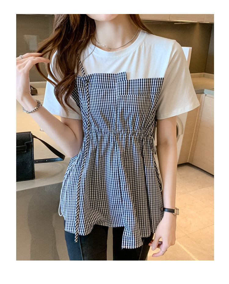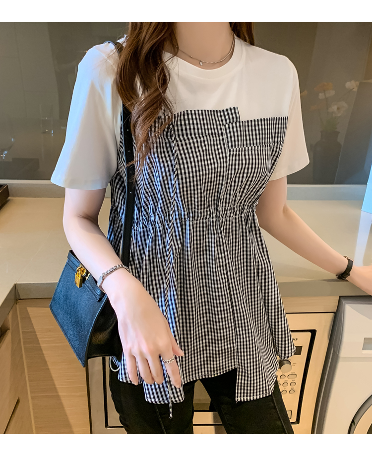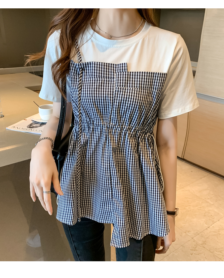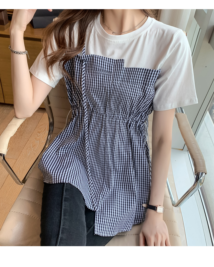 2021夏季拼接格纹短袖T恤女个性不规则小众圆领收腰雪纺衫上衣