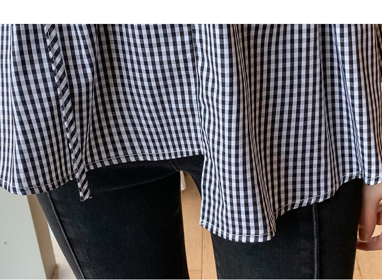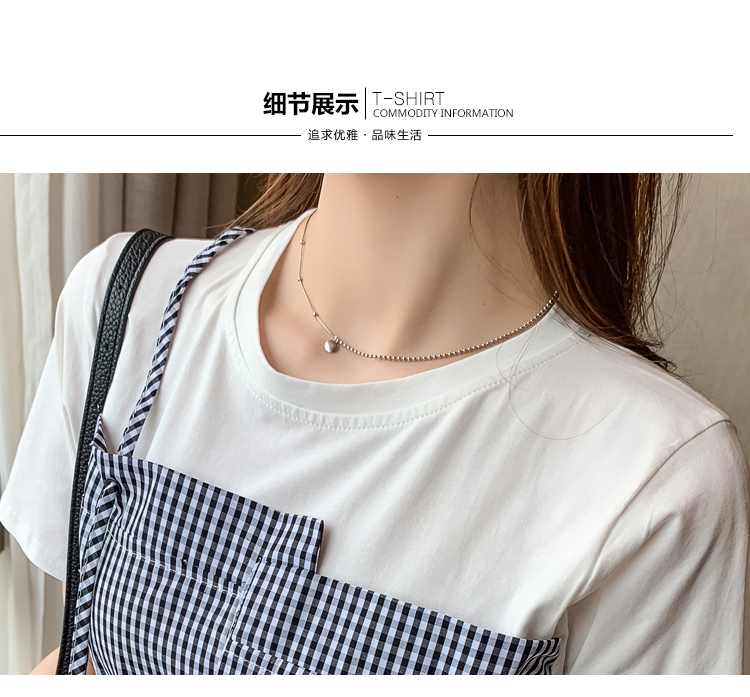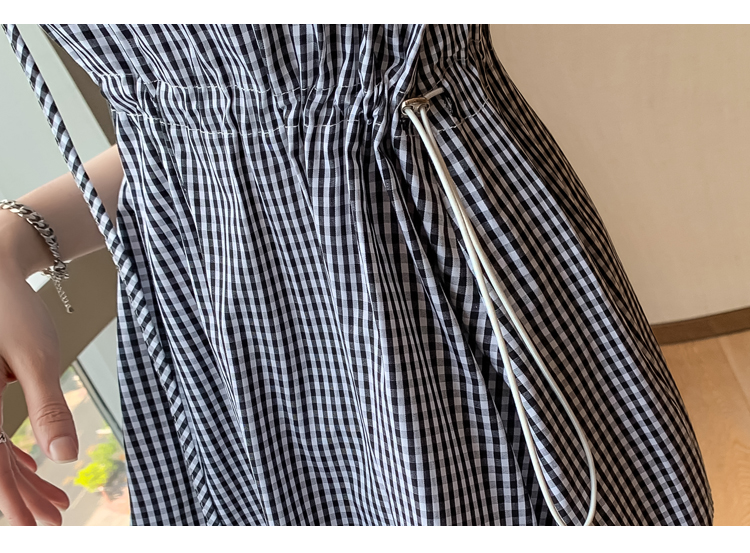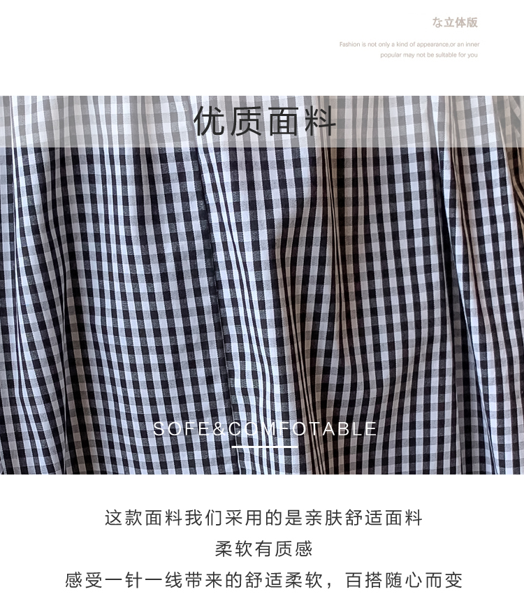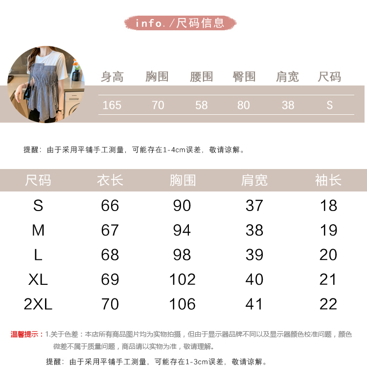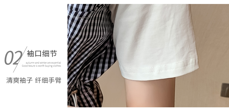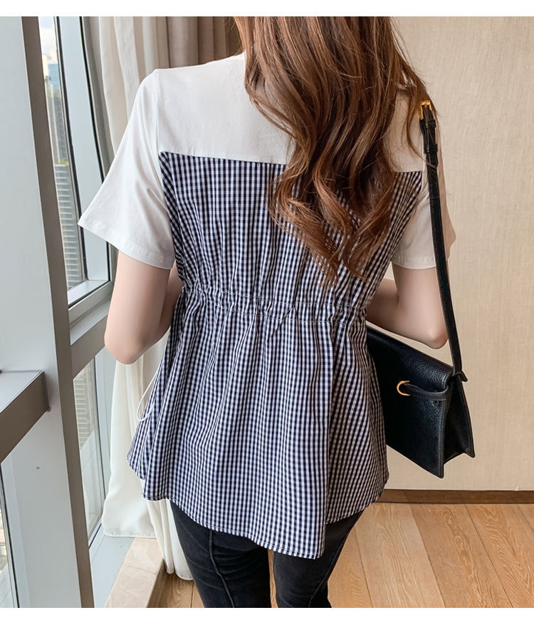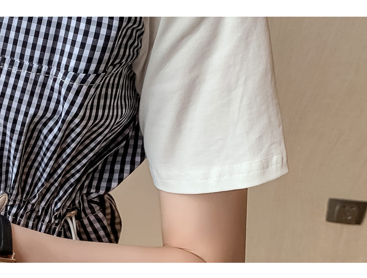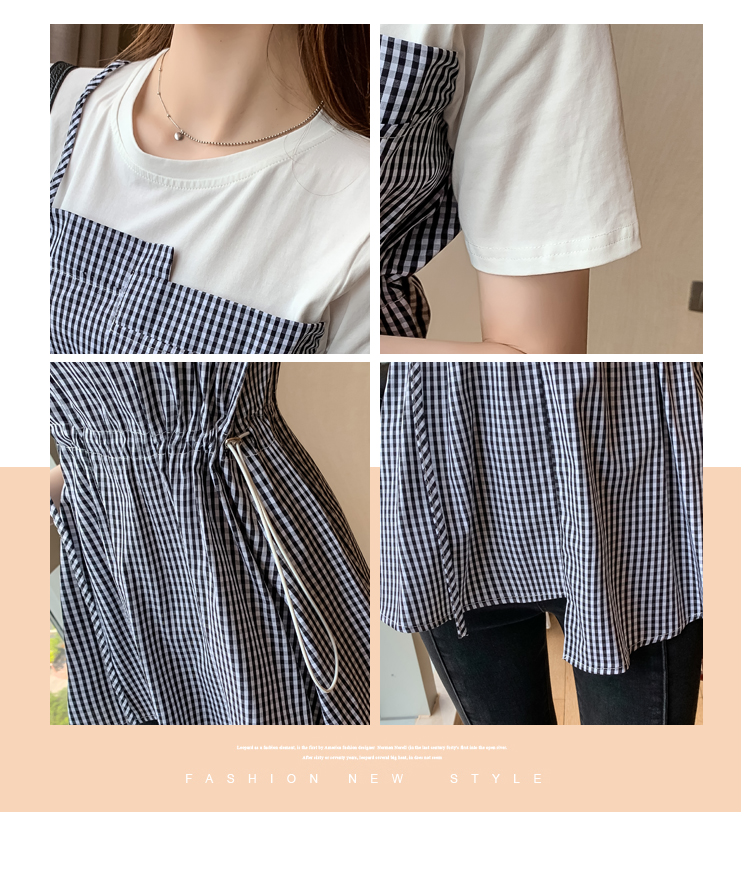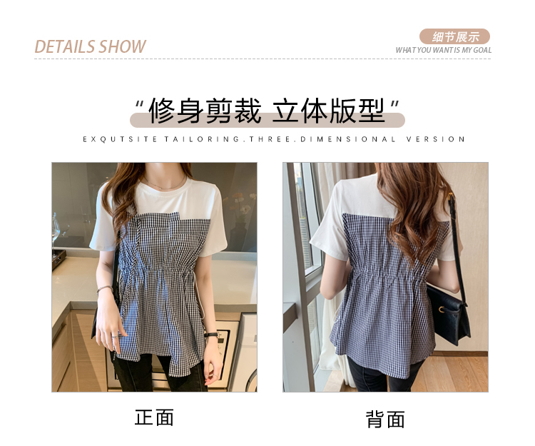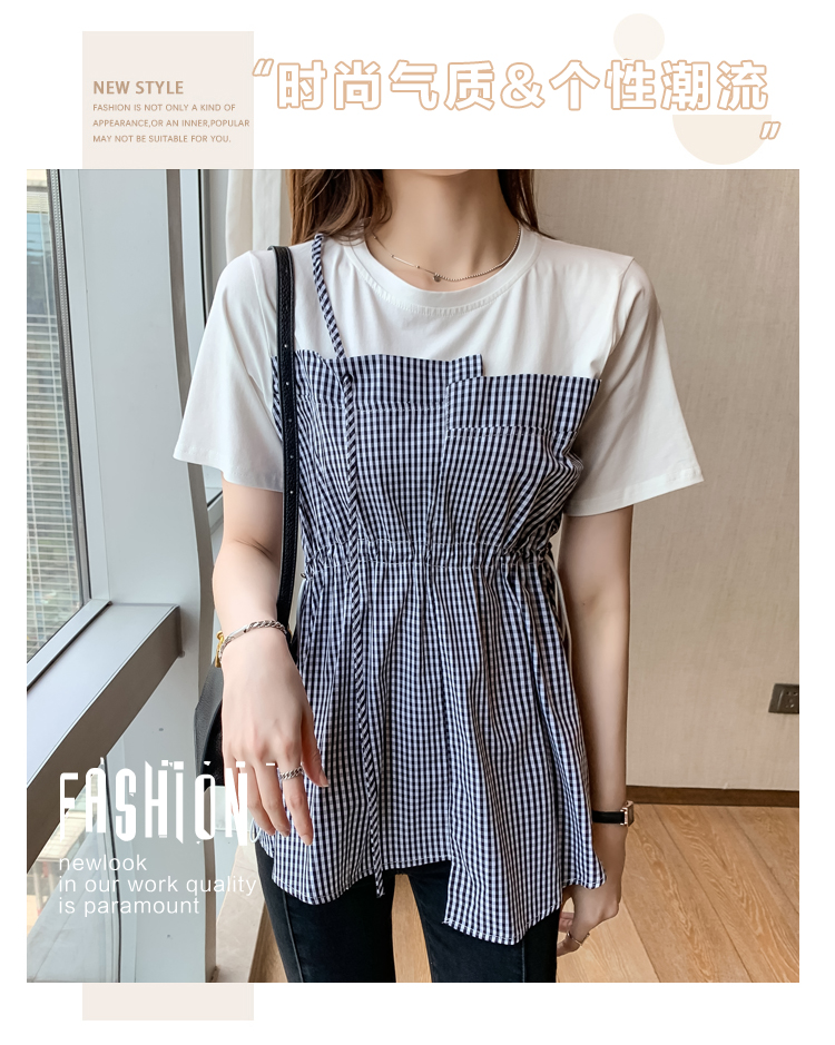 2021夏季拼接格纹短袖T恤女个性不规则小众圆领收腰雪纺衫上衣