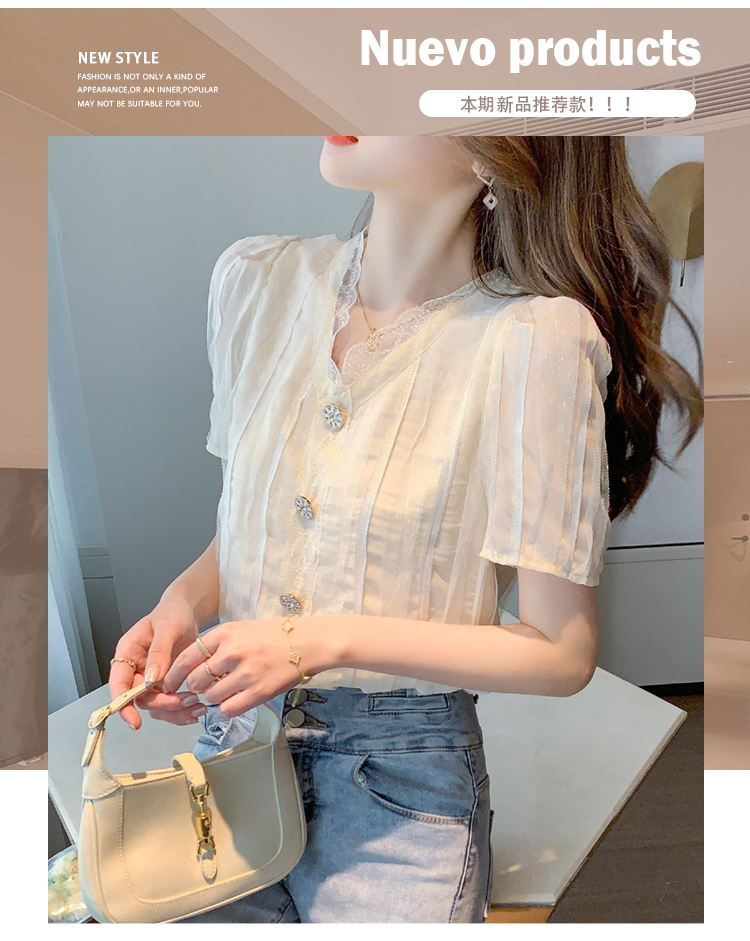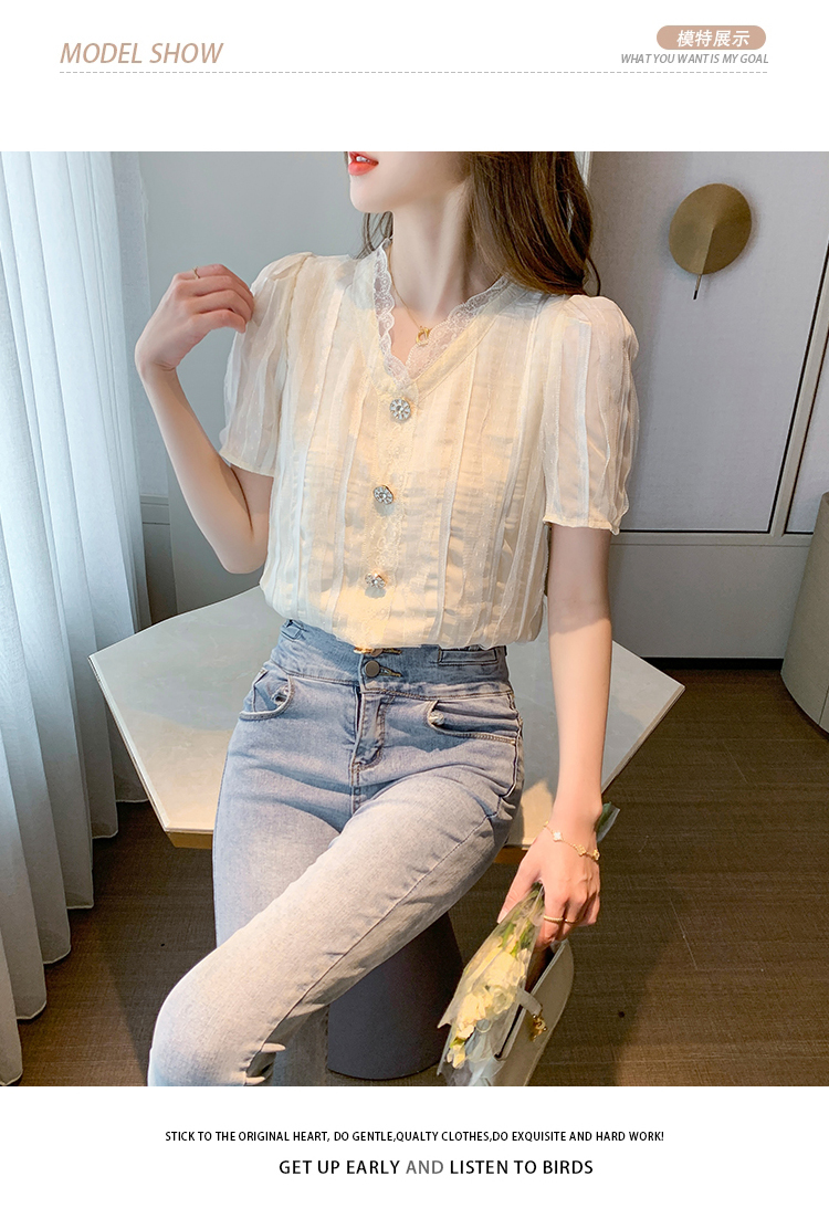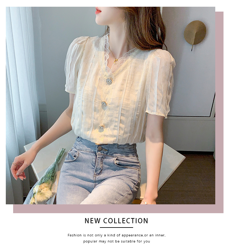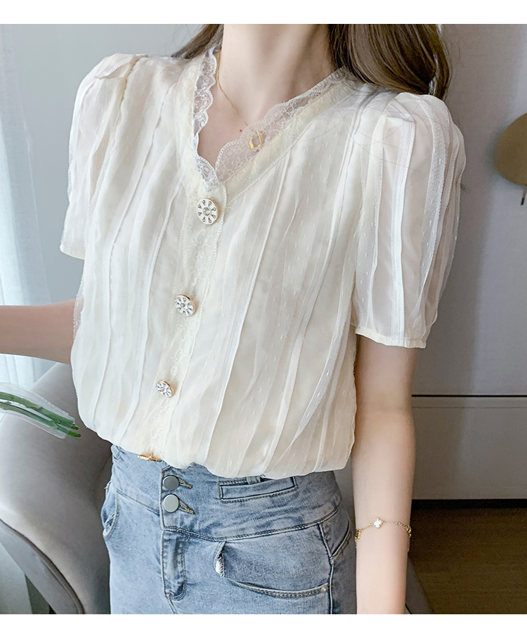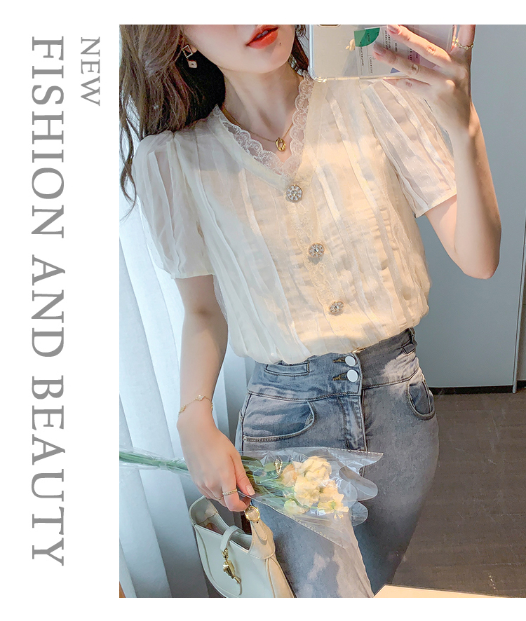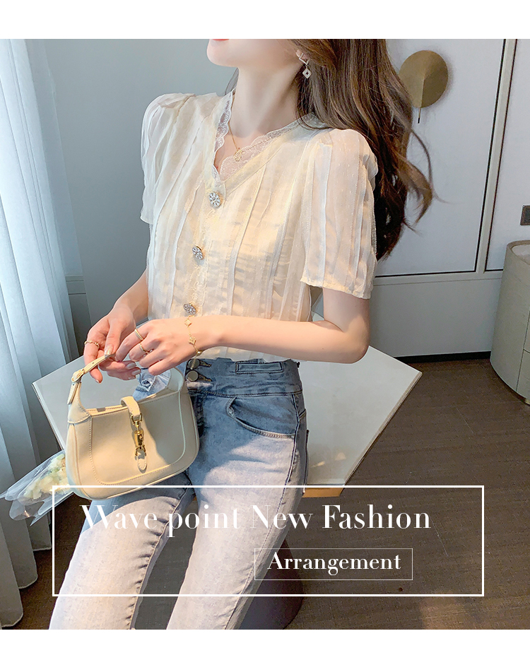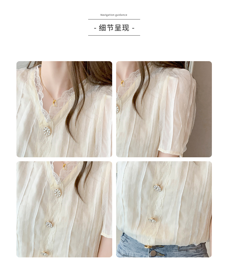 实拍2021夏季新款韩版百搭V领拼接短袖雪纺衫女衬衫时髦上衣潮