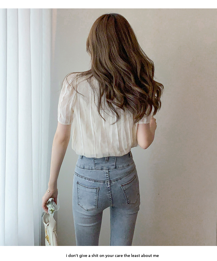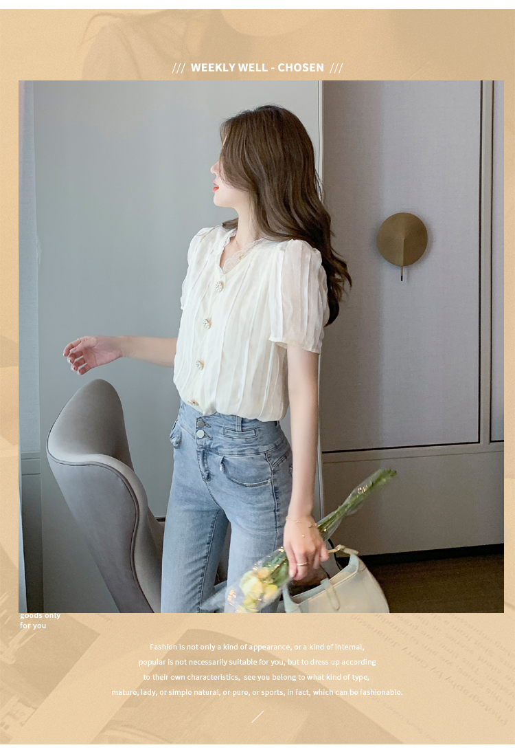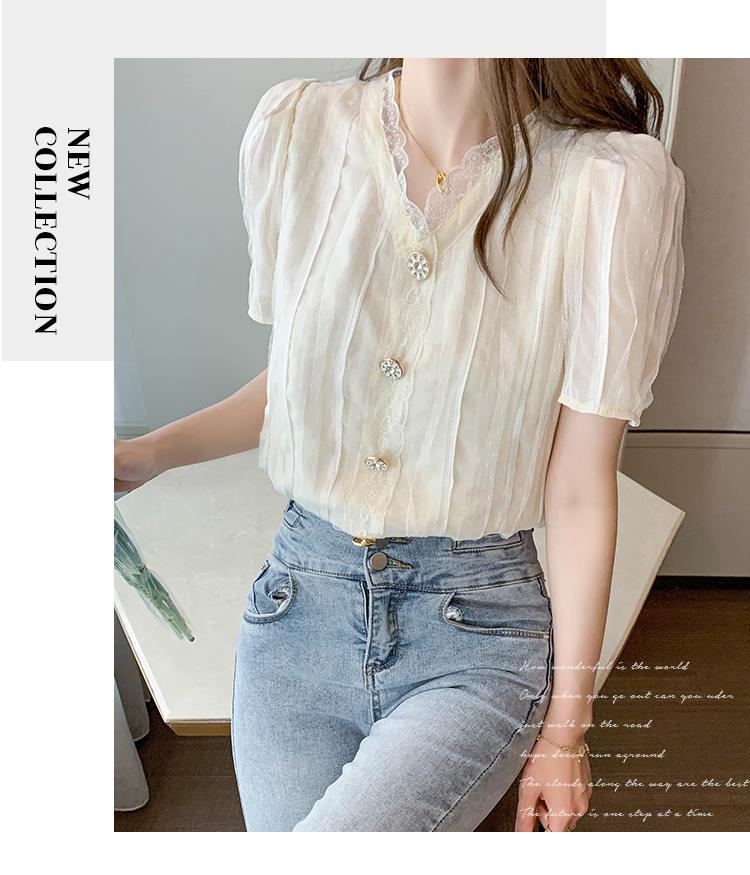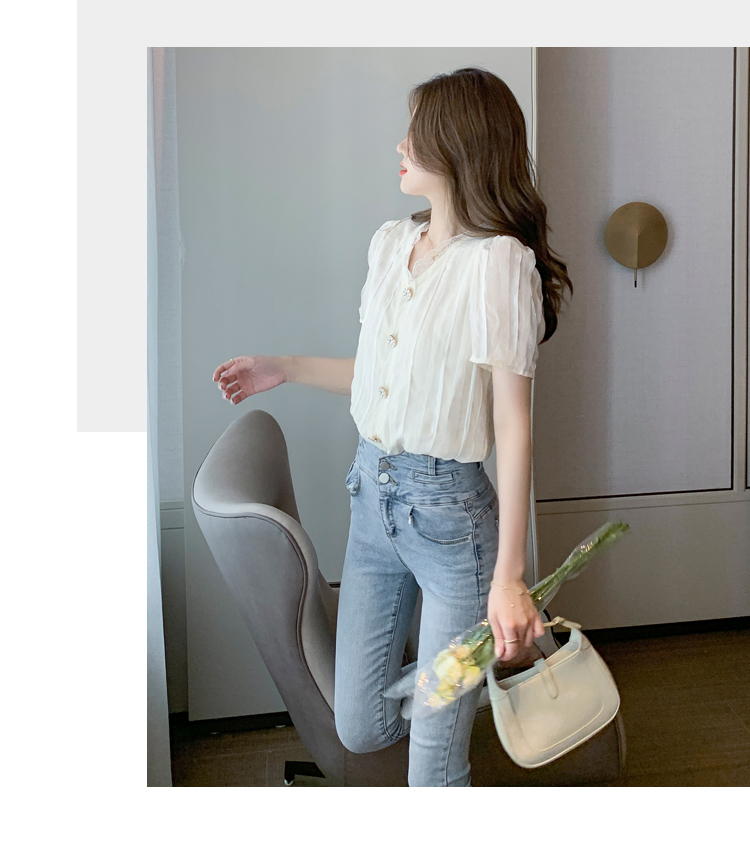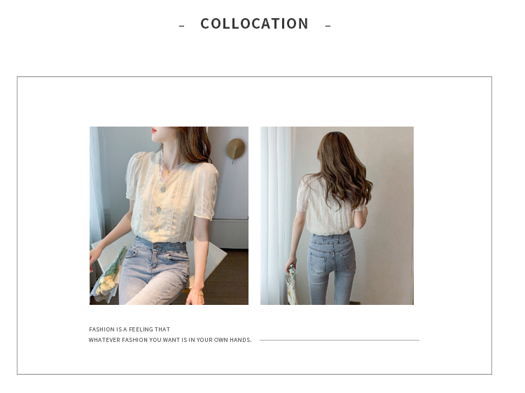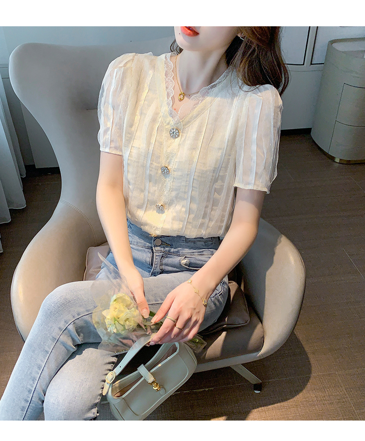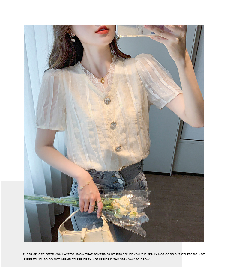实拍2021夏季新款韩版百搭V领拼接短袖雪纺衫女衬衫时髦上衣潮