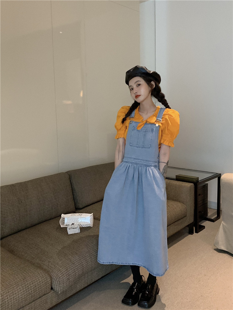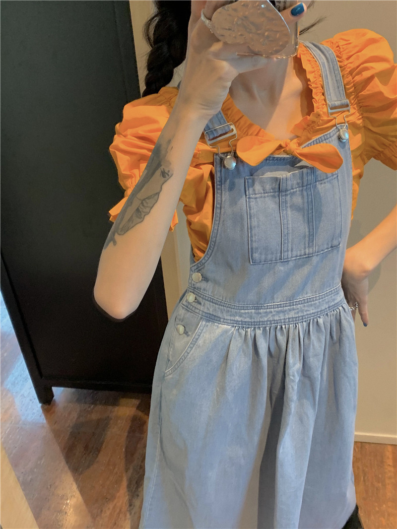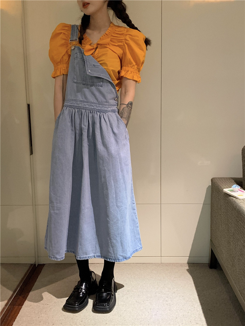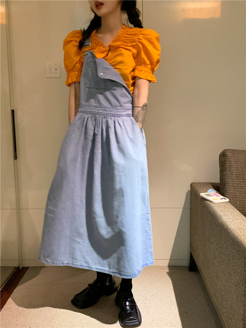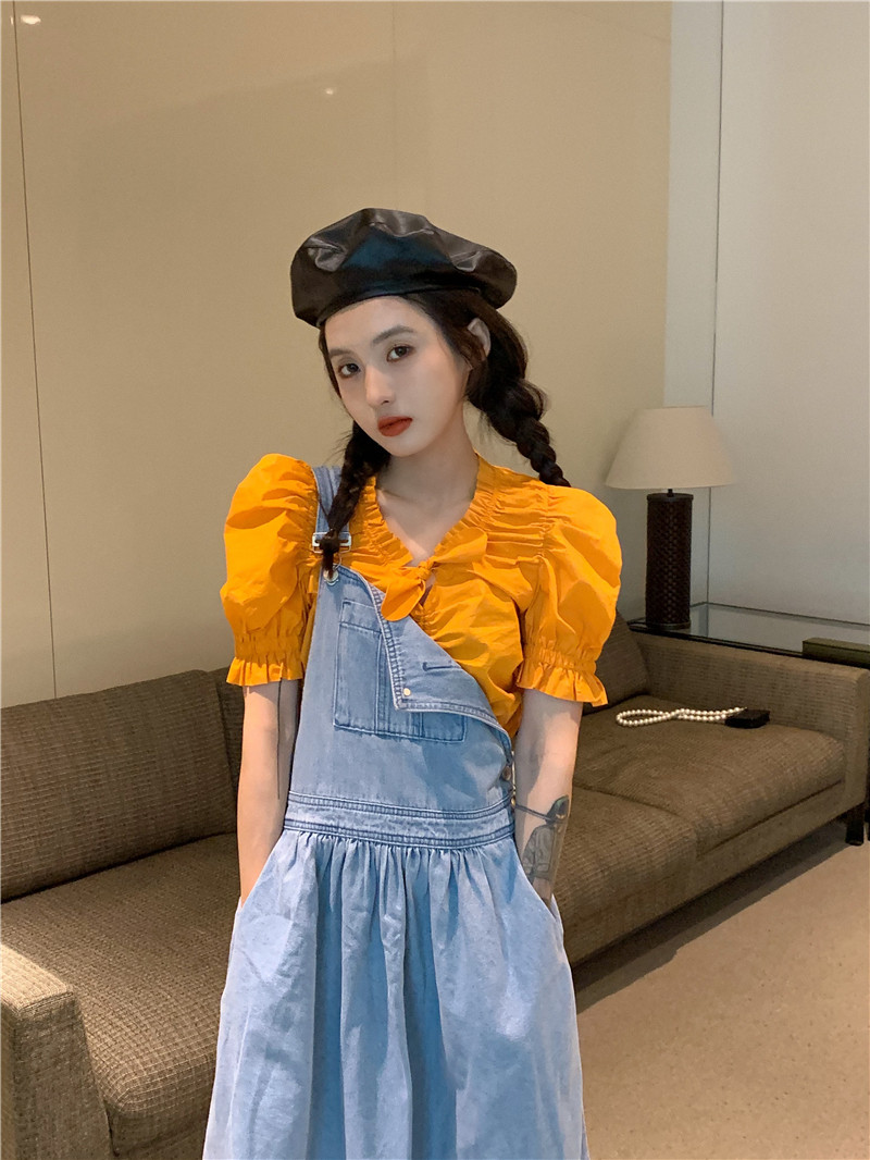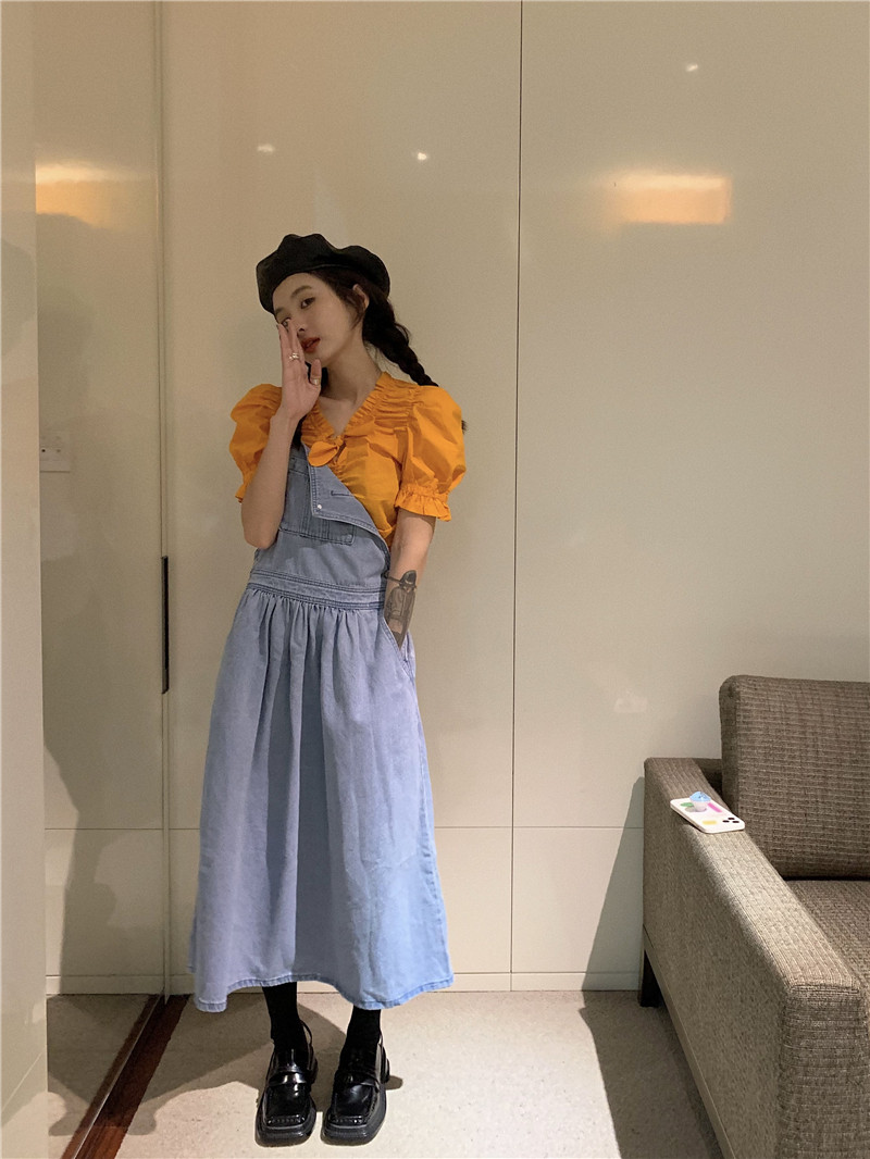 实拍实价 v领皱褶泡泡袖衬衫+慵懒牛仔背带连衣裙