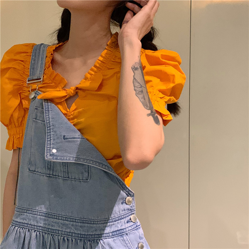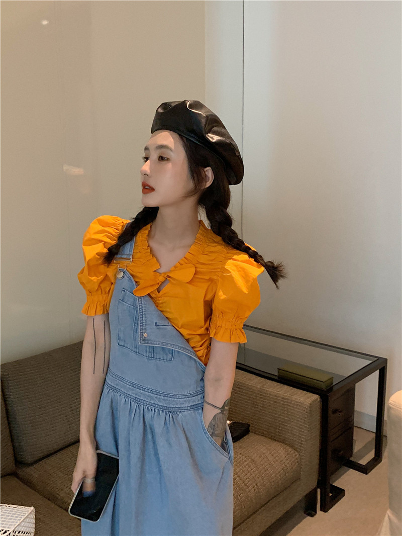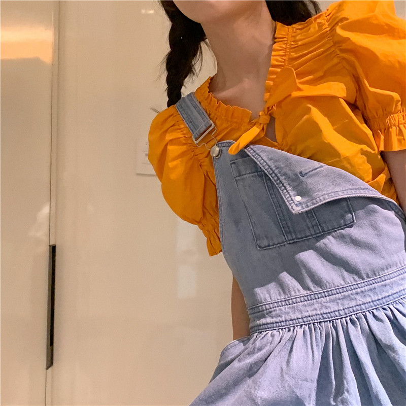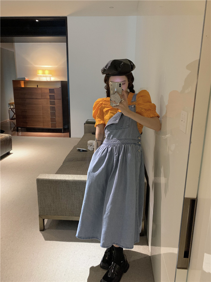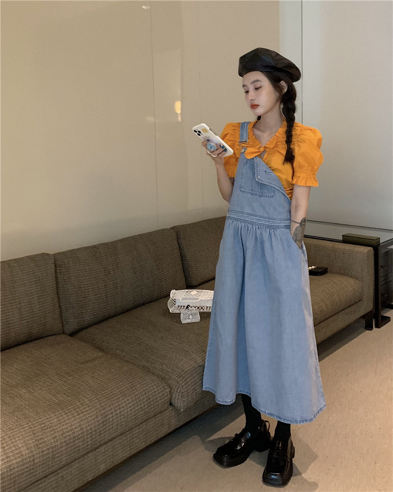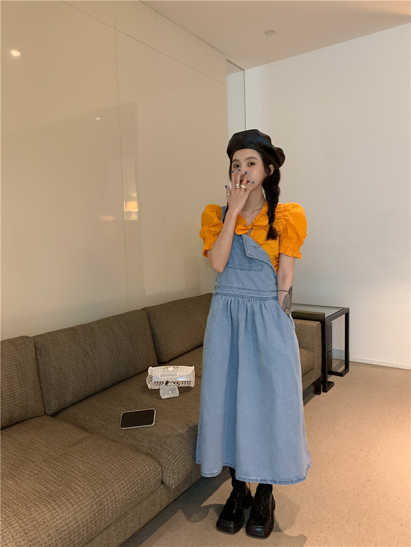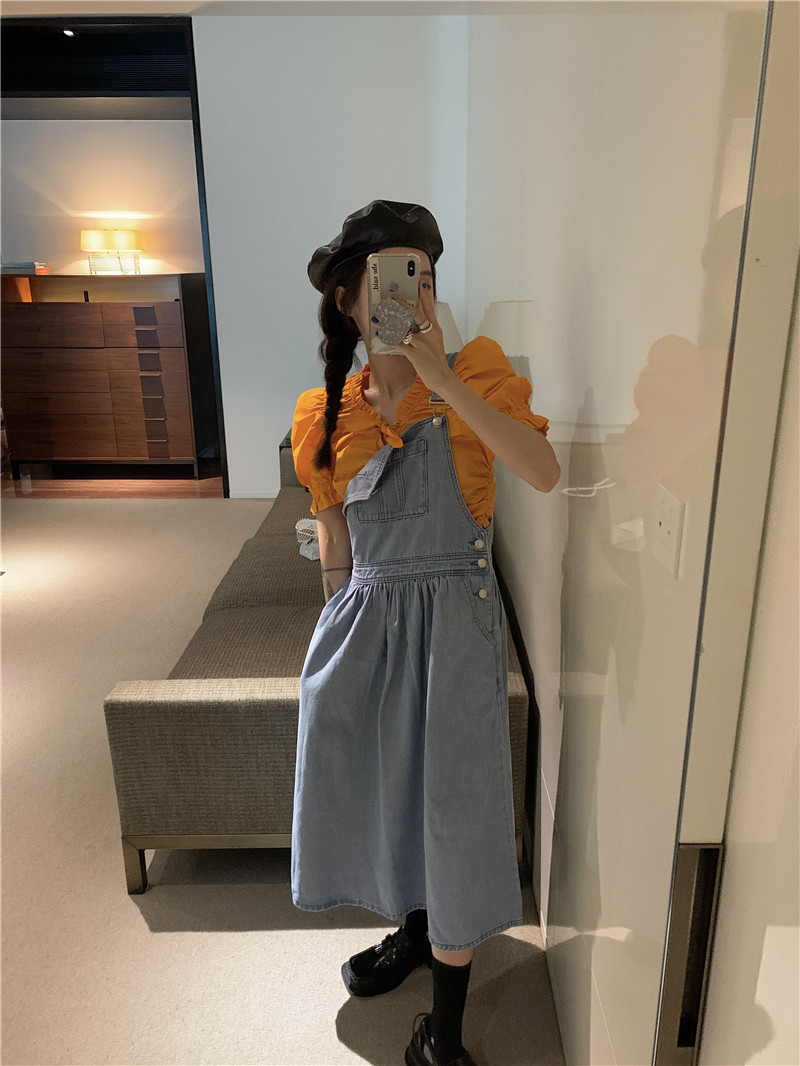 实拍实价 v领皱褶泡泡袖衬衫+慵懒牛仔背带连衣裙