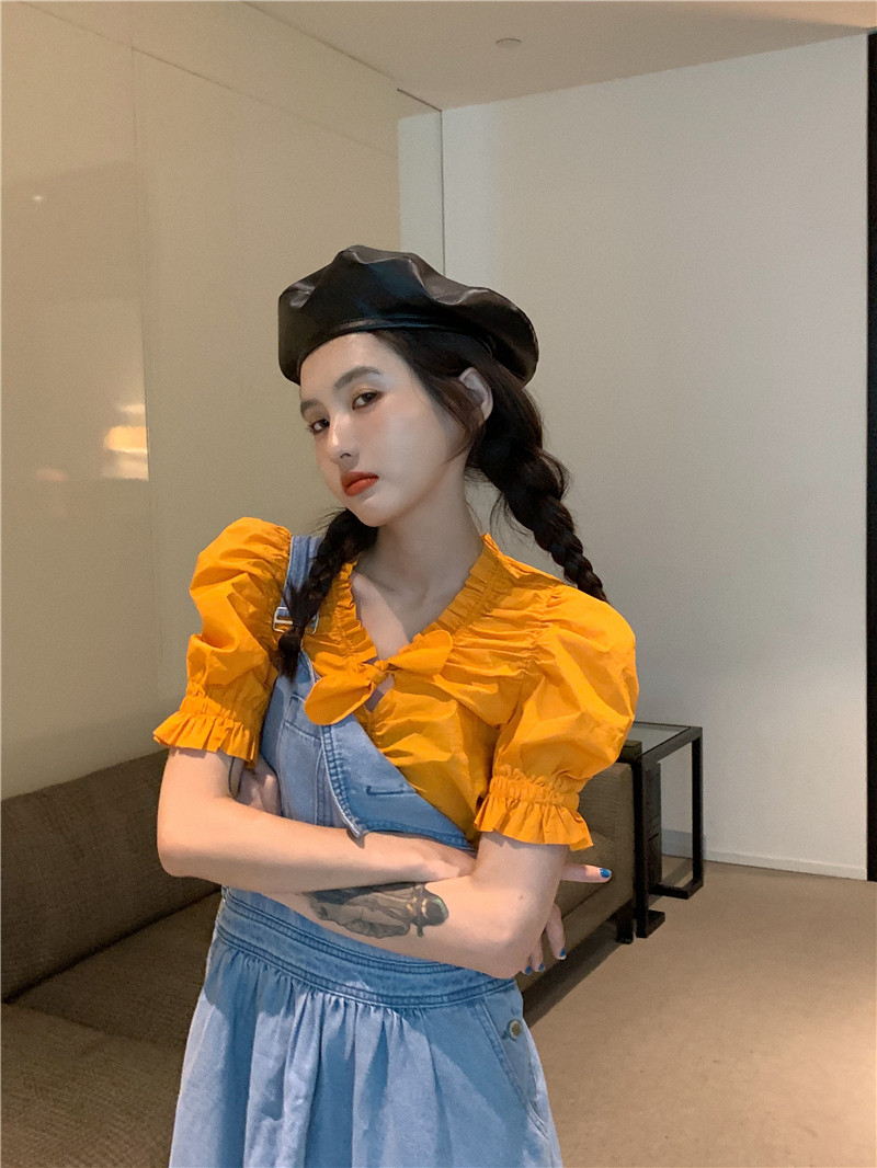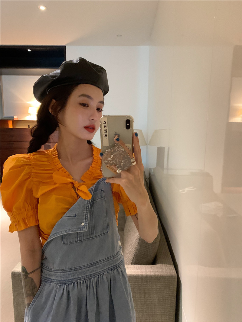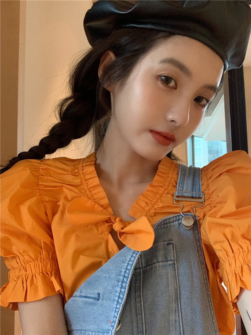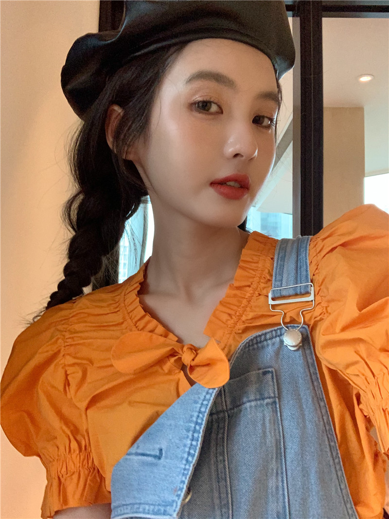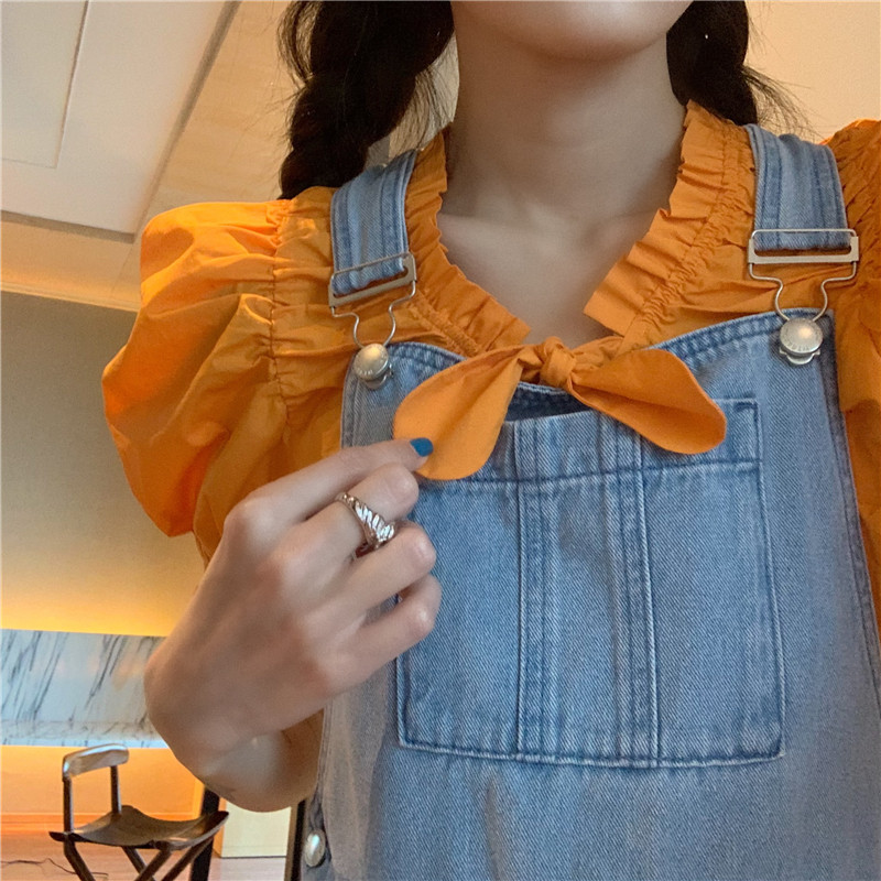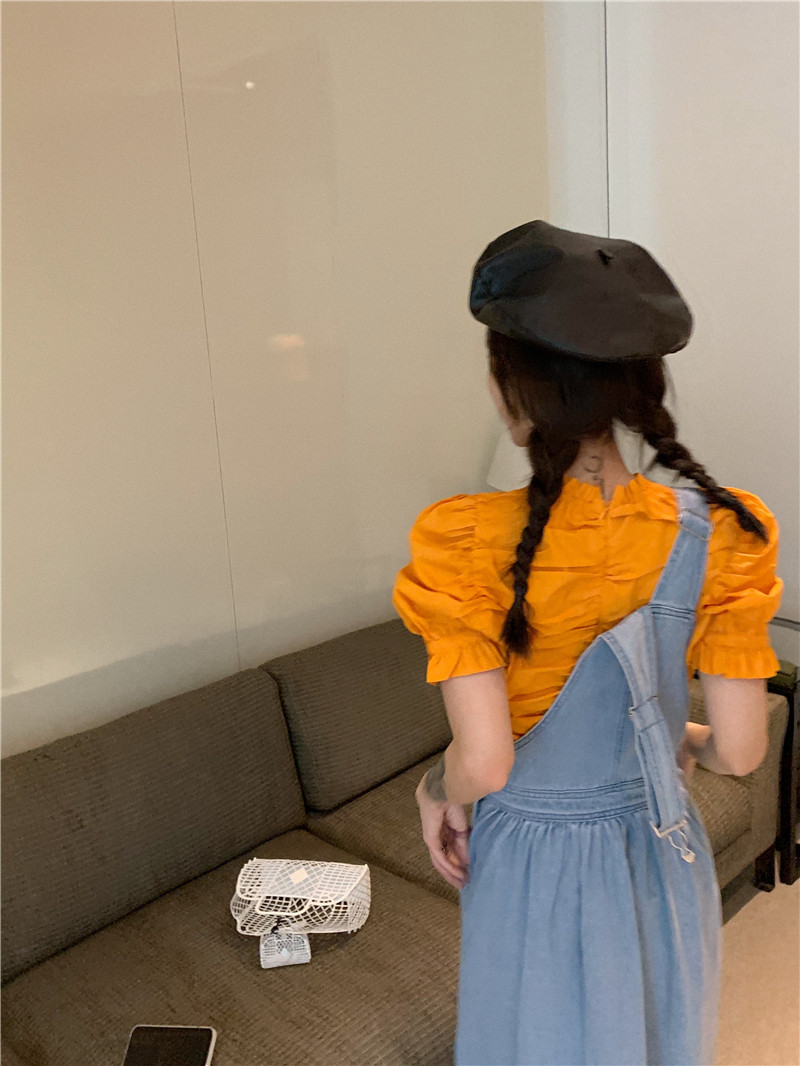 实拍实价 v领皱褶泡泡袖衬衫+慵懒牛仔背带连衣裙