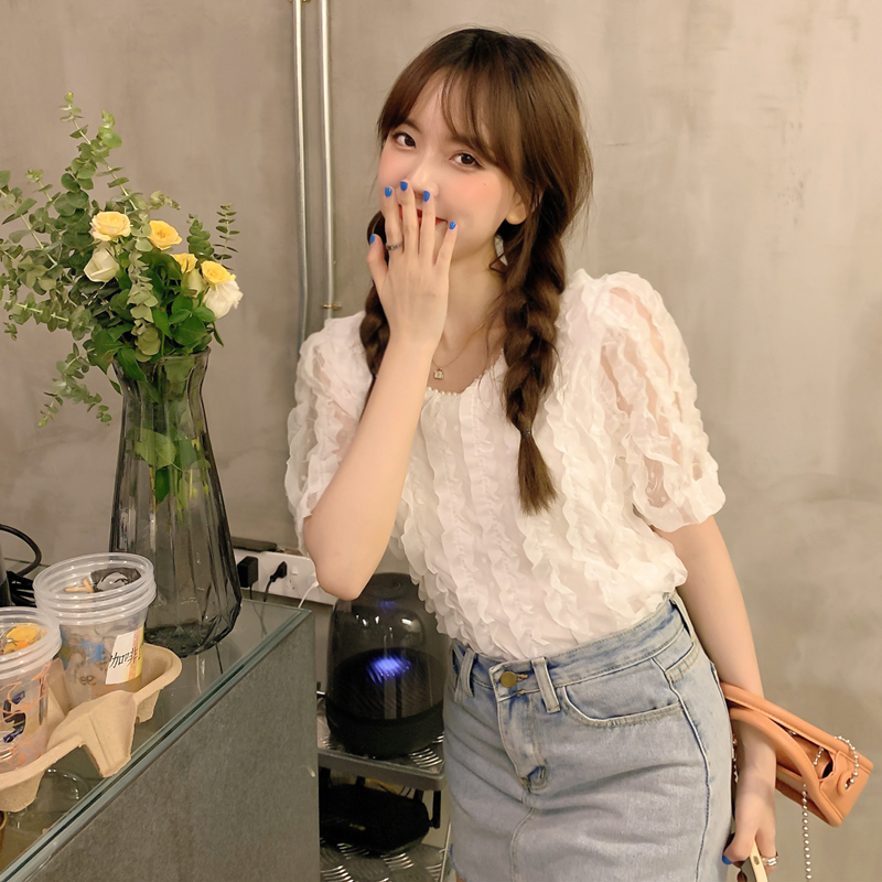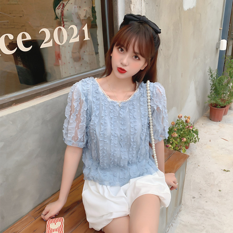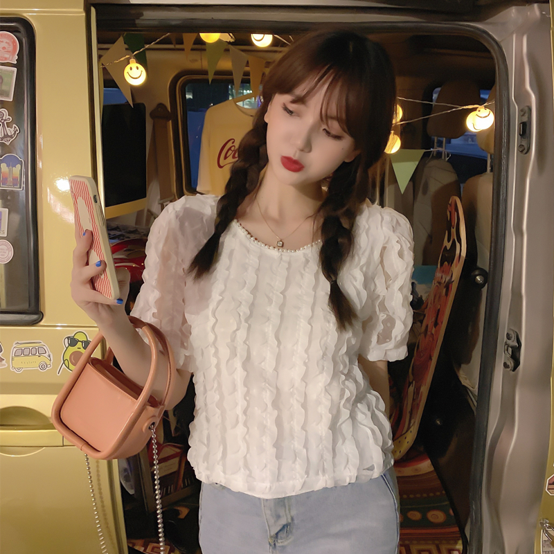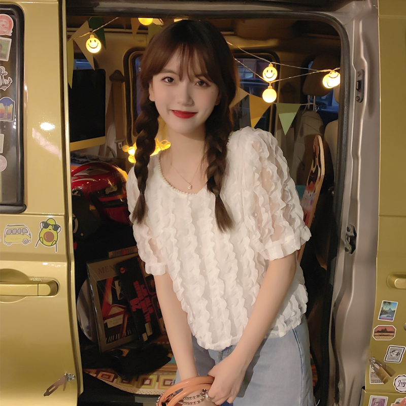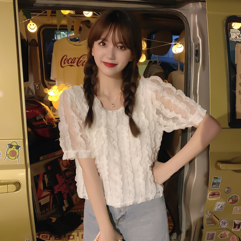 实价实拍 短袖衬衫女夏薄款设计感小众2021年新款镂空泡泡袖上衣