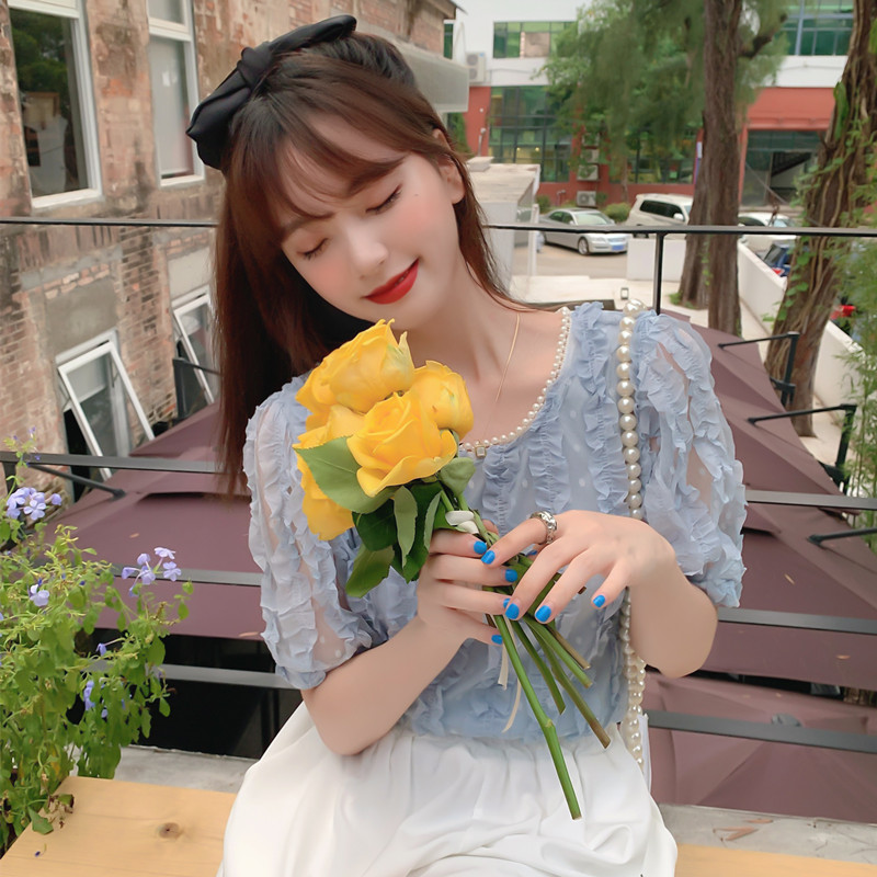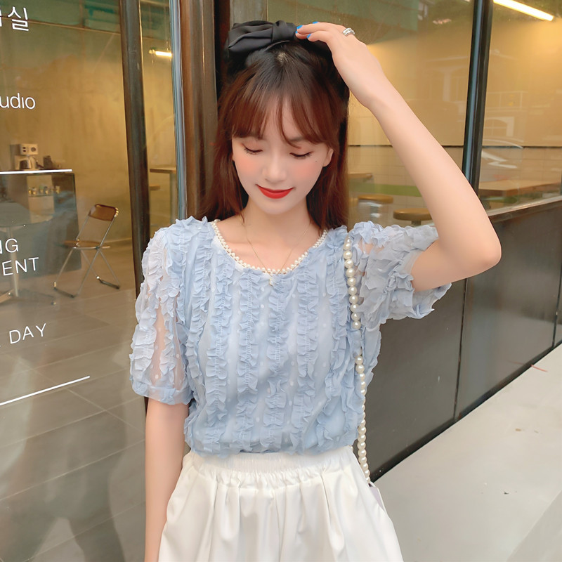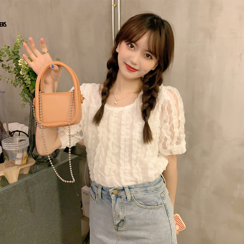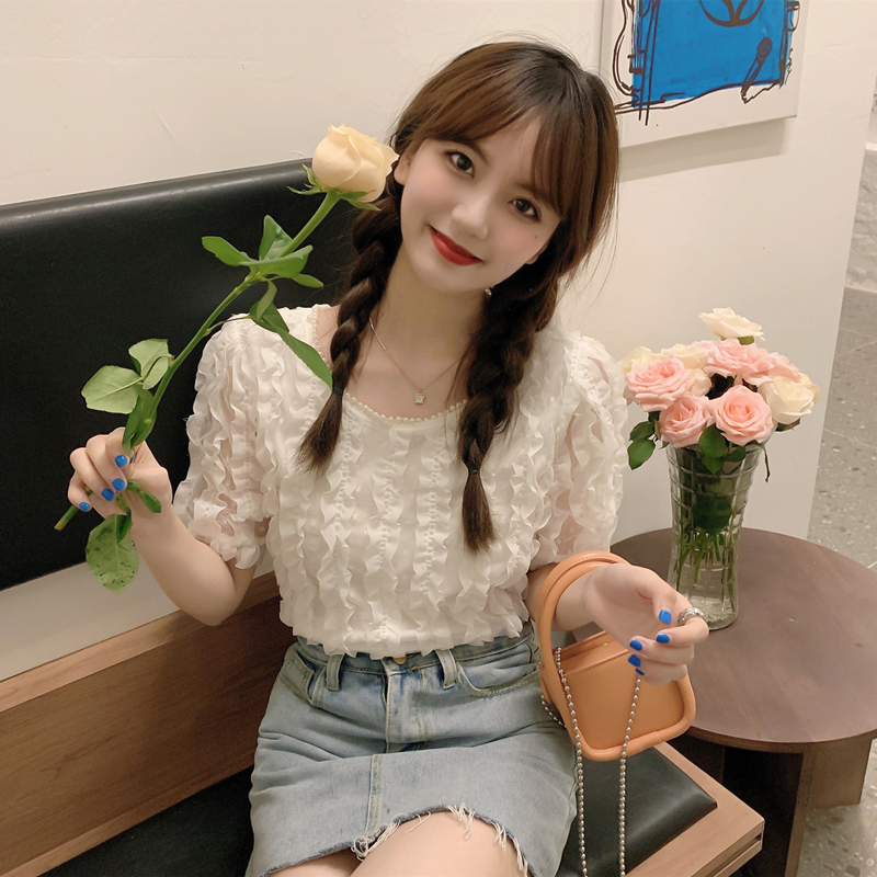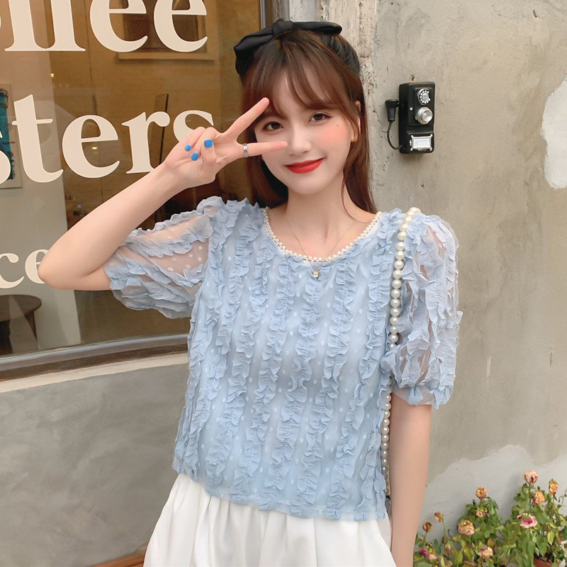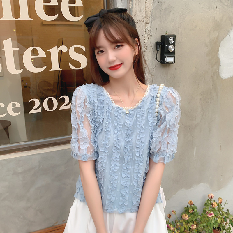 实价实拍 短袖衬衫女夏薄款设计感小众2021年新款镂空泡泡袖上衣