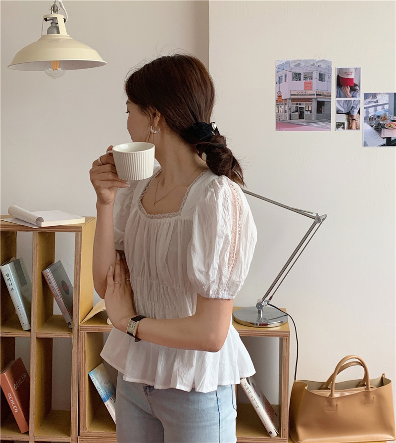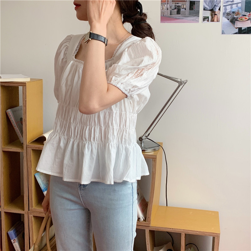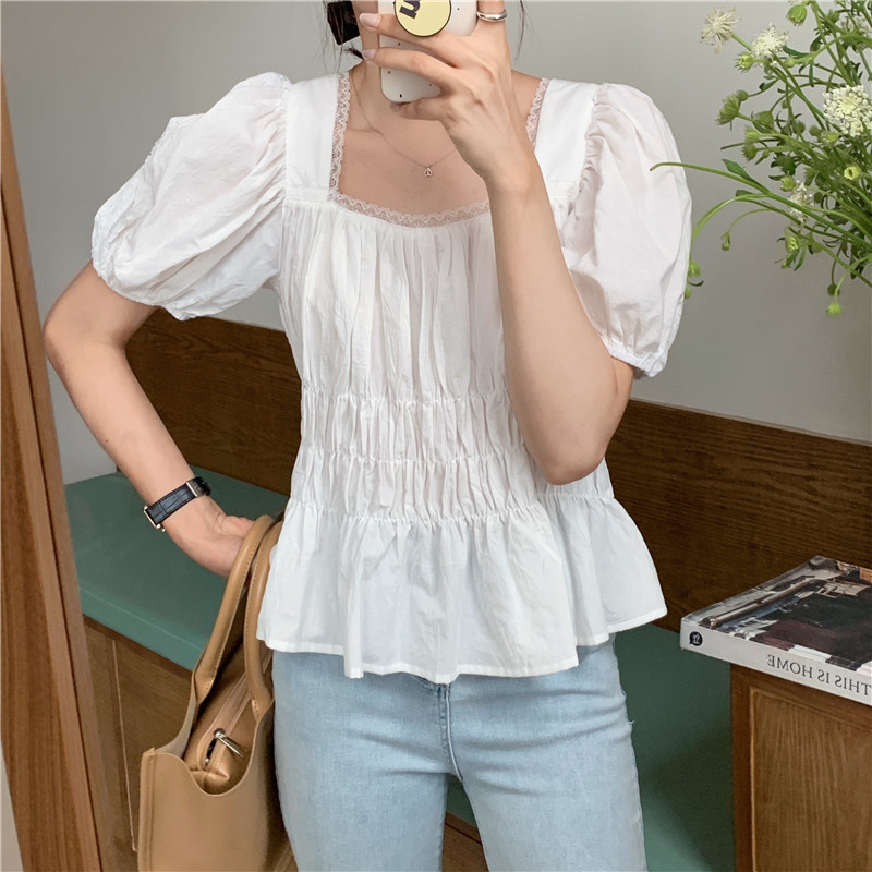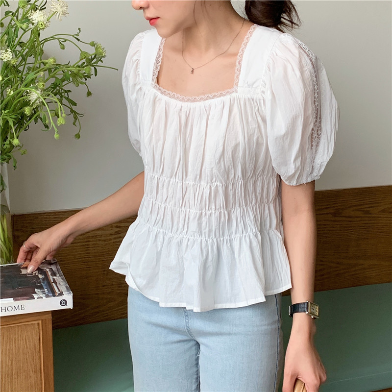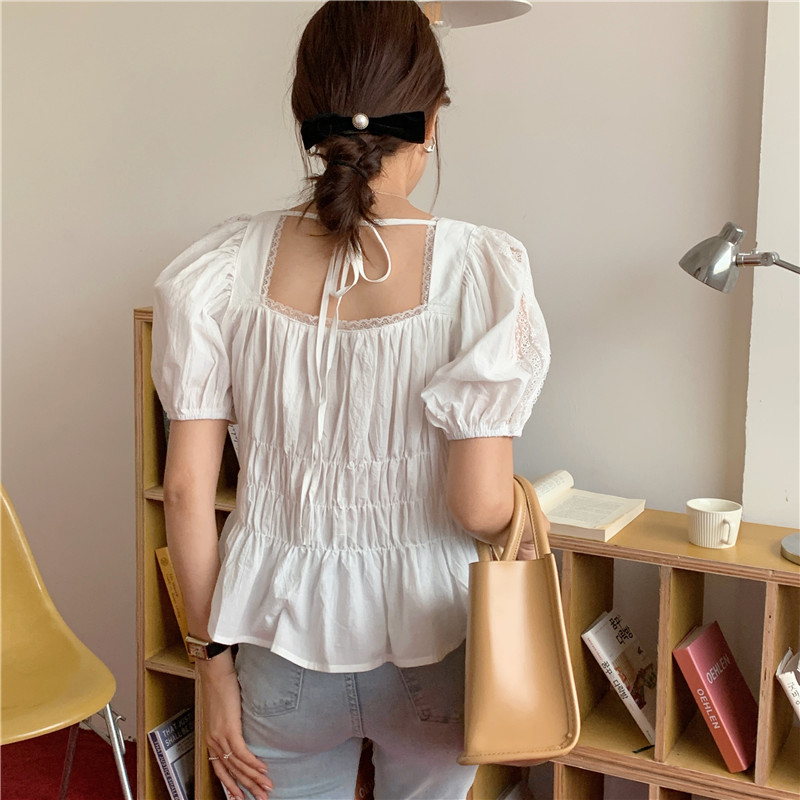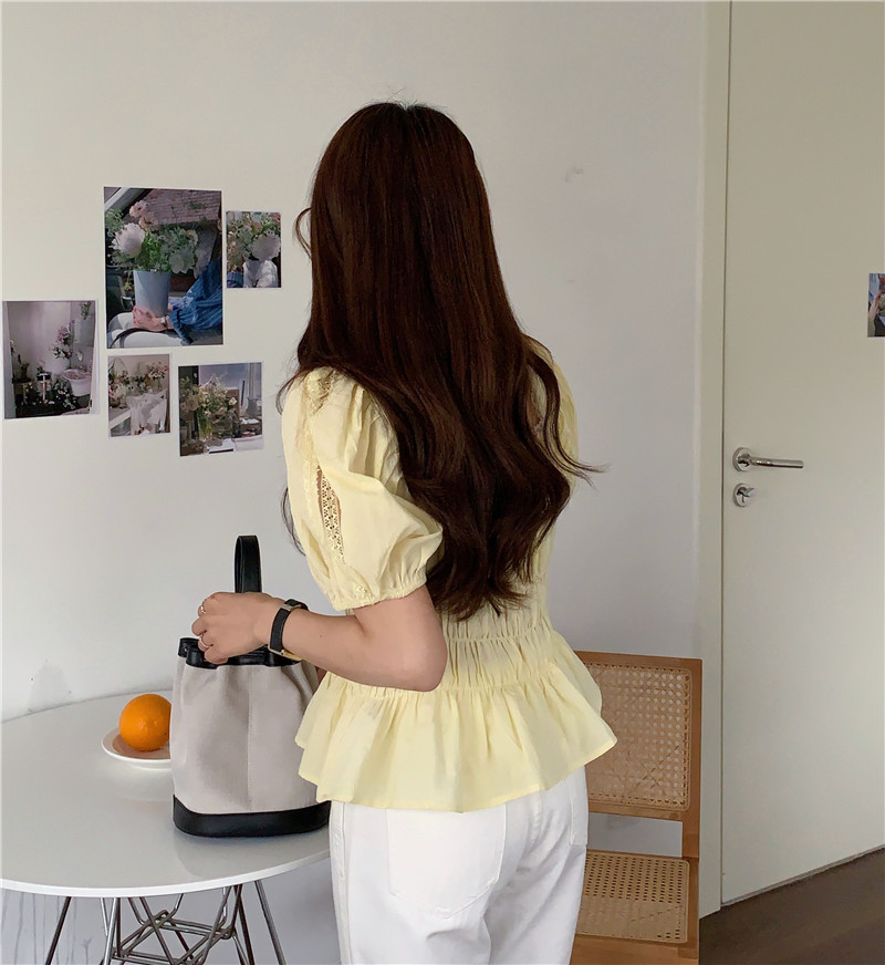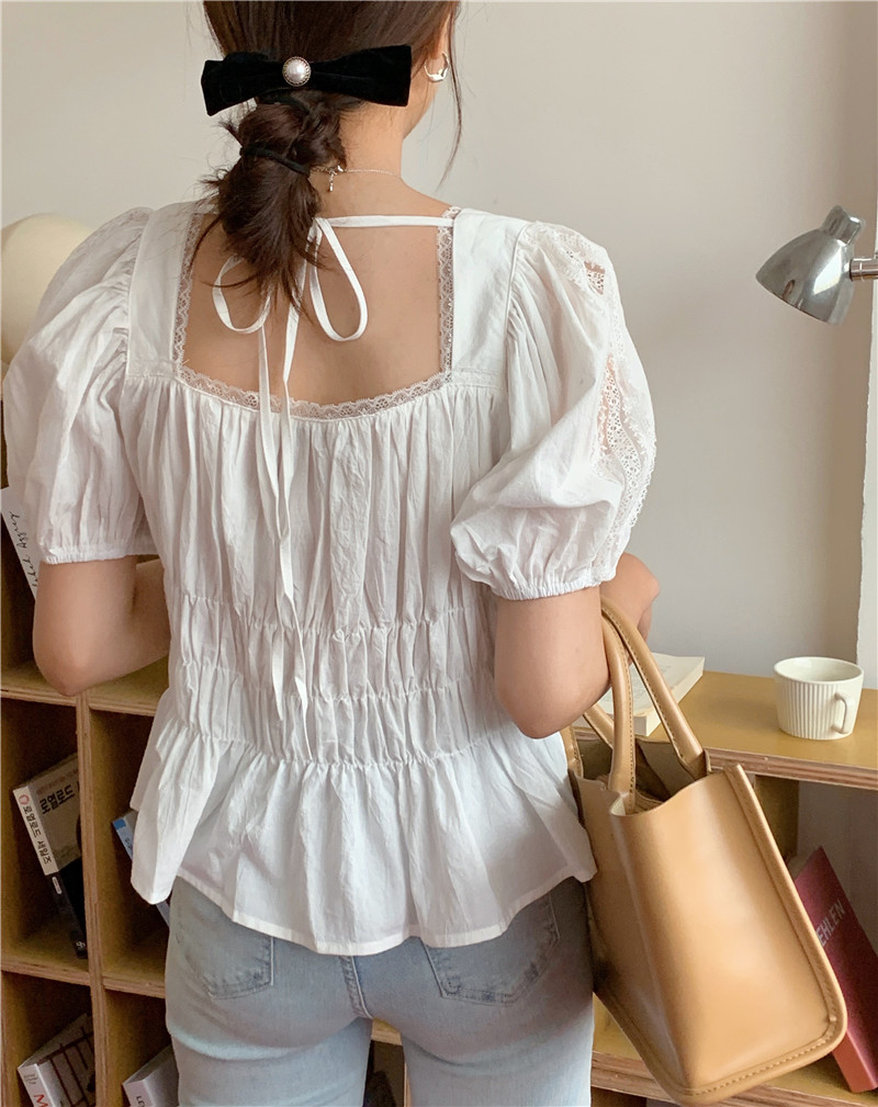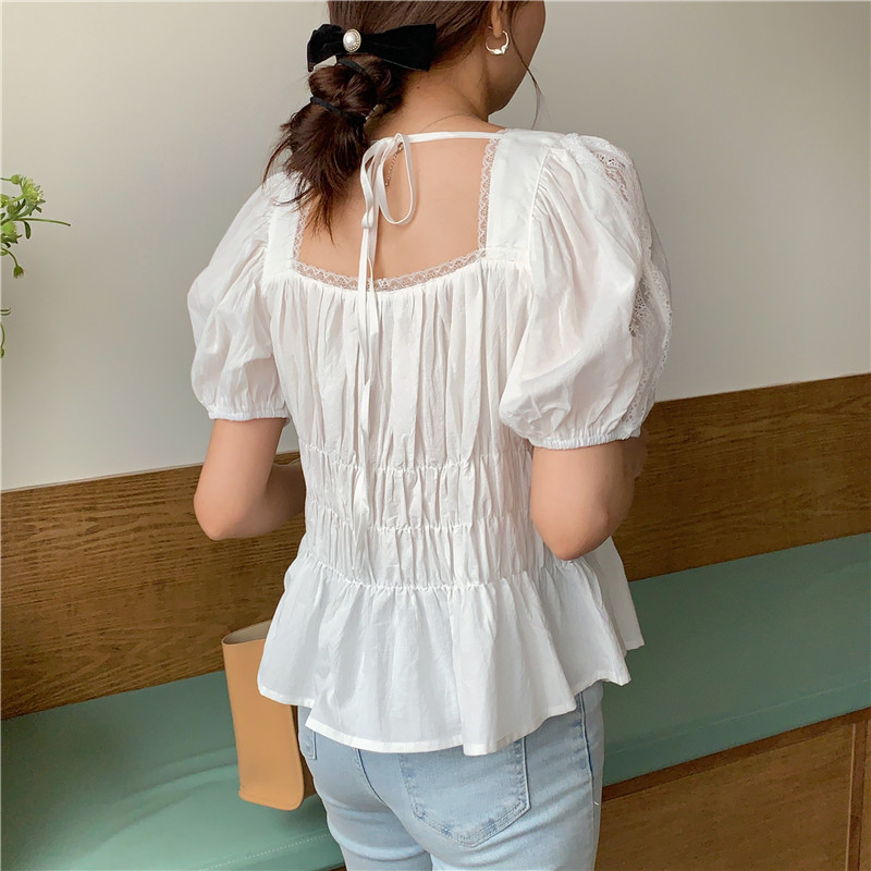 实拍实价 韩版法式浪漫花边拼接镂空短袖衬衫 2色现货