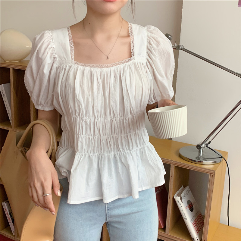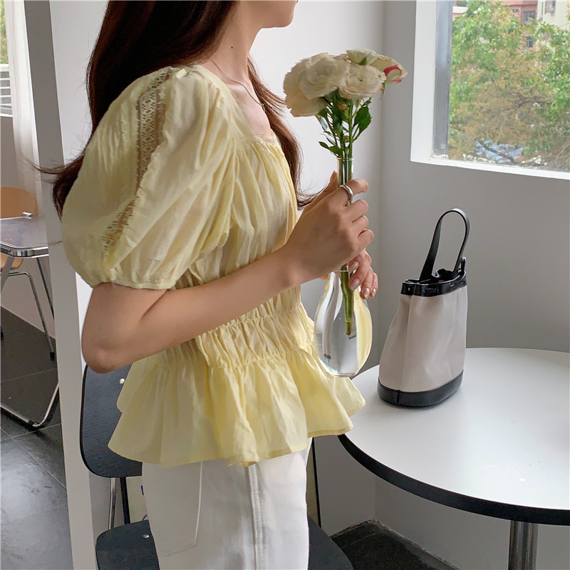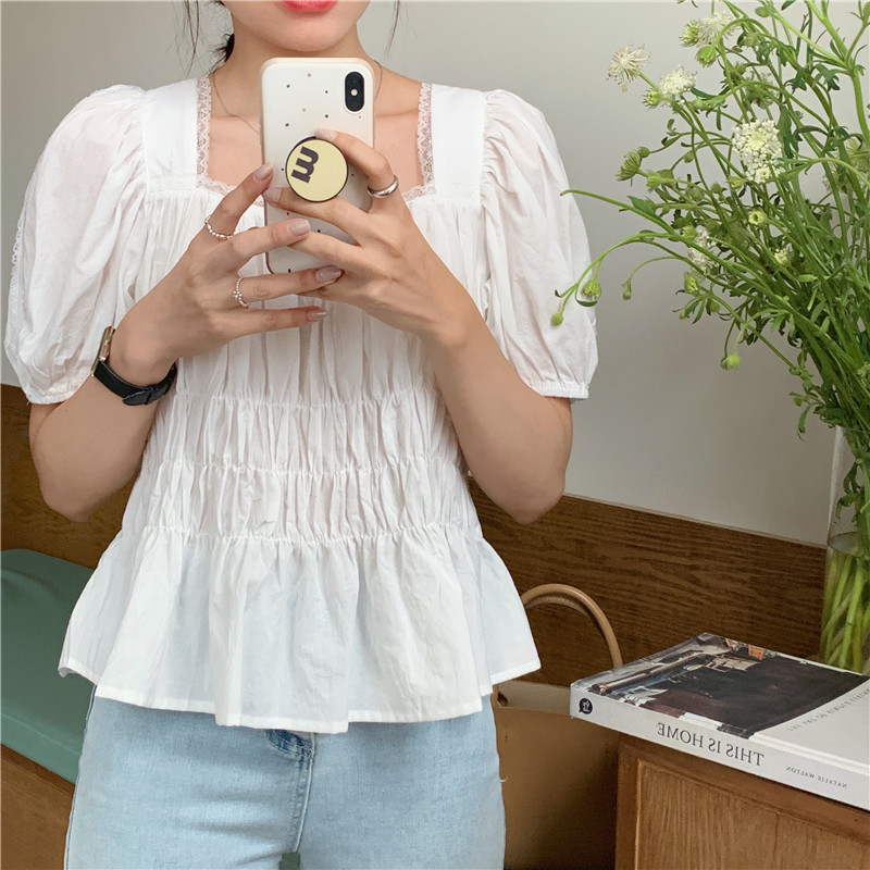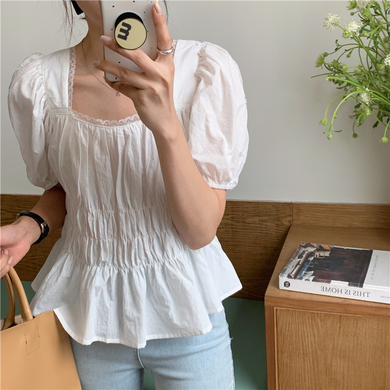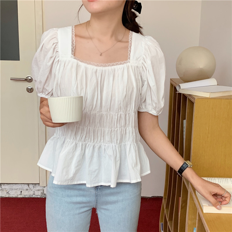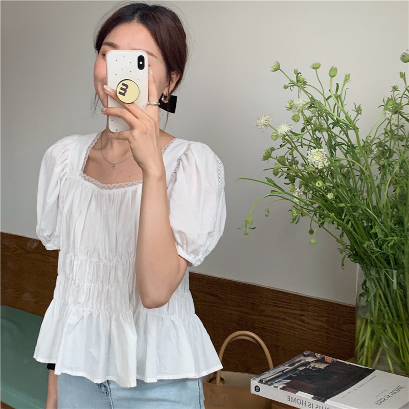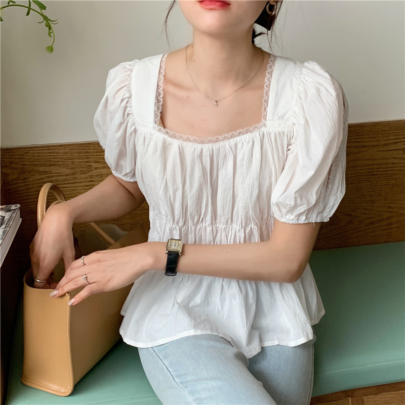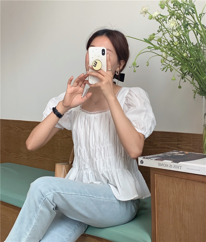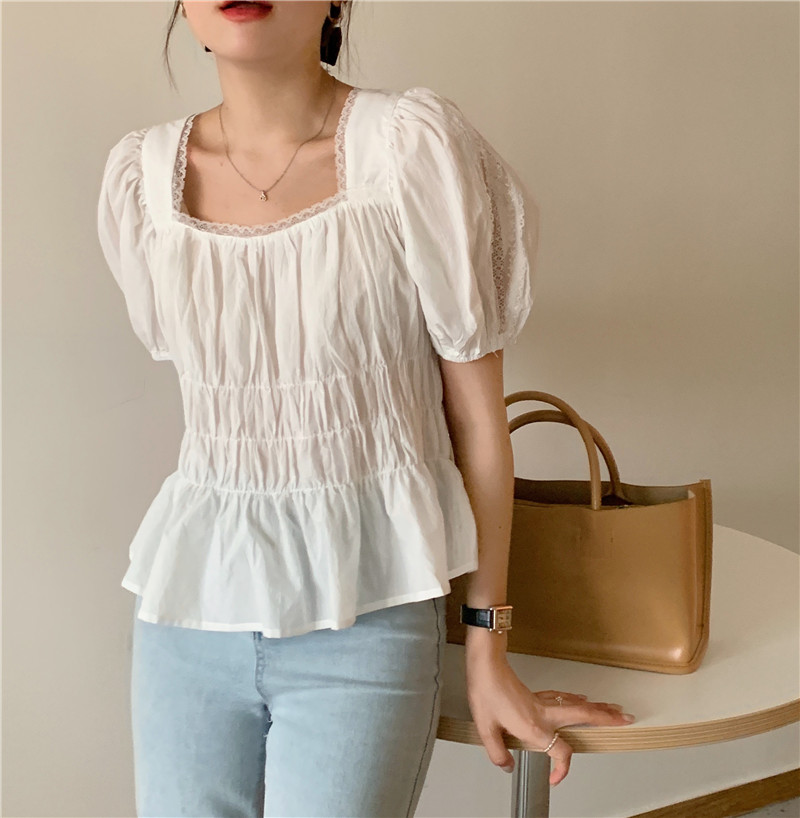 实拍实价 韩版法式浪漫花边拼接镂空短袖衬衫 2色现货