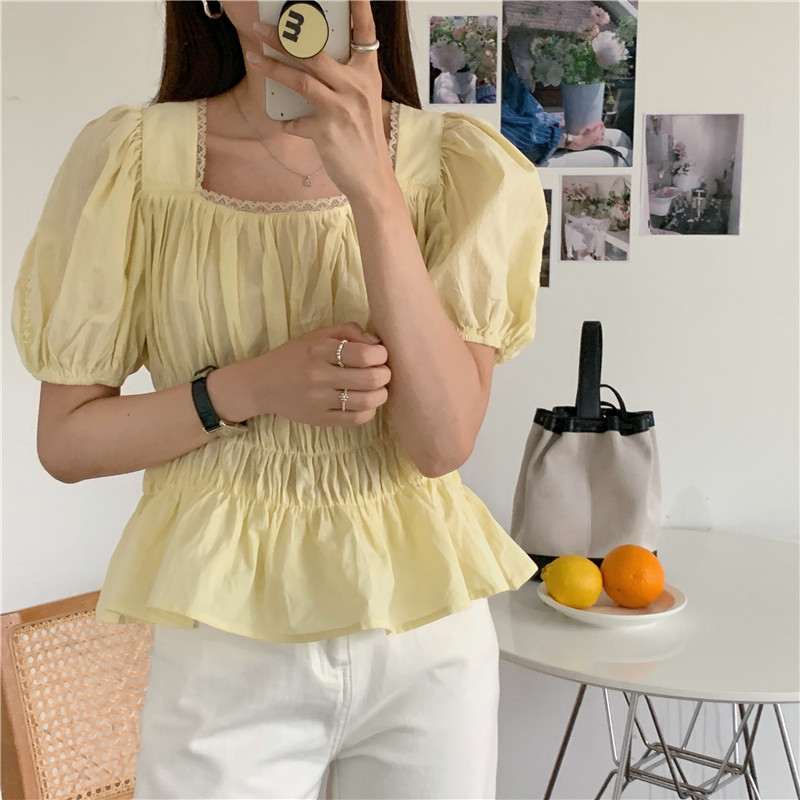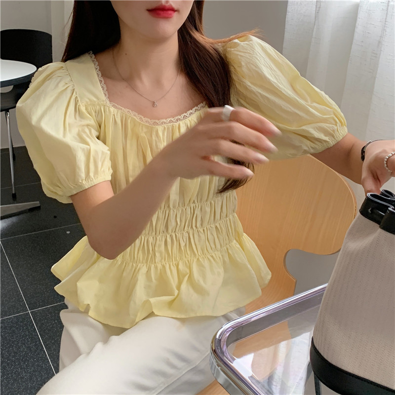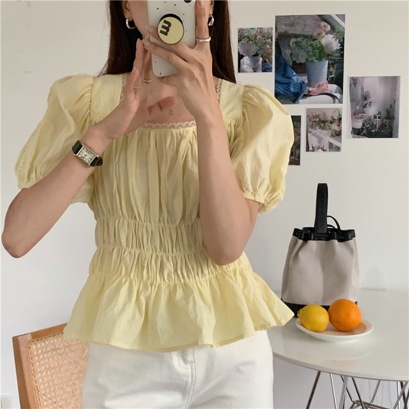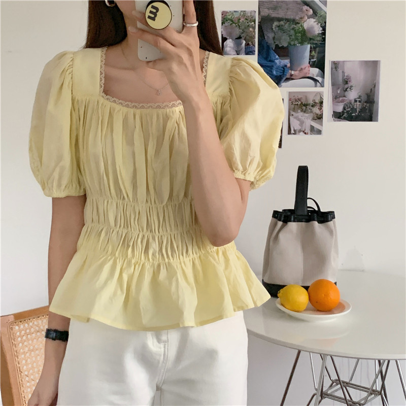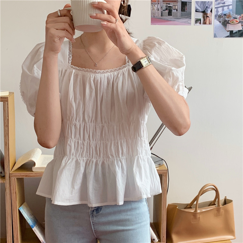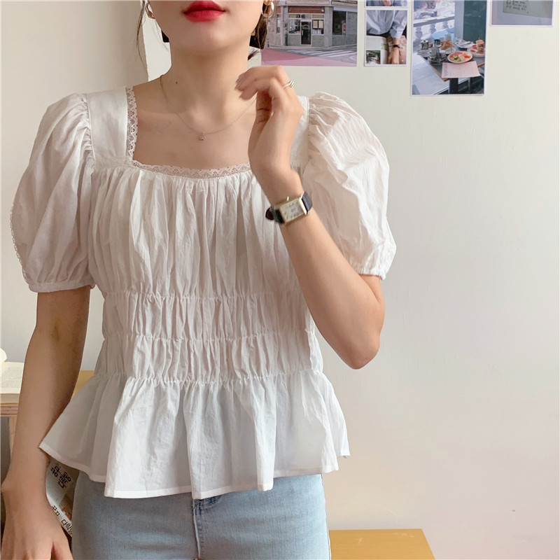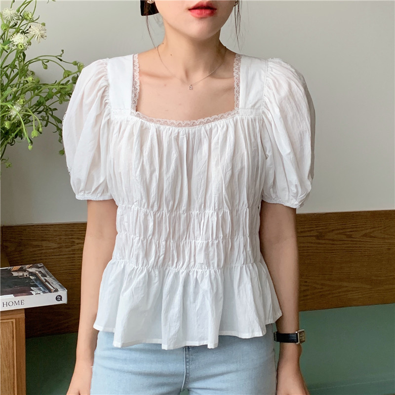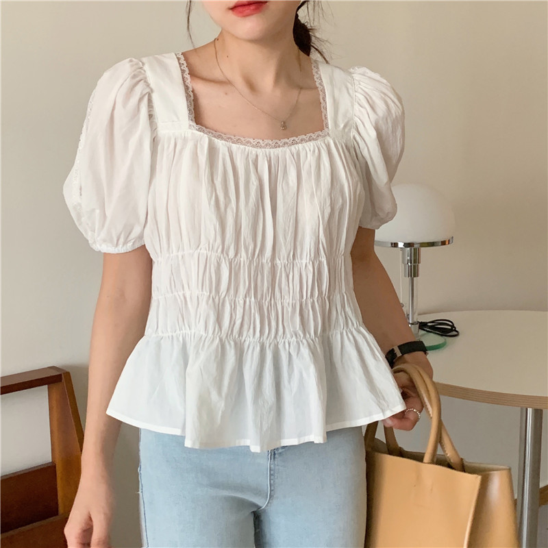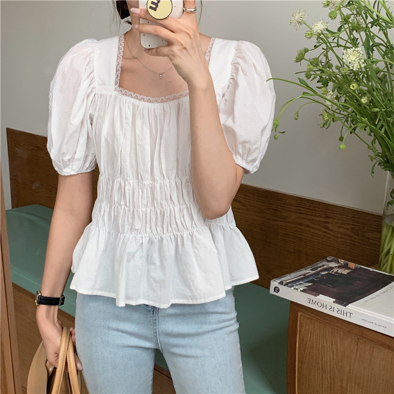 实拍实价 韩版法式浪漫花边拼接镂空短袖衬衫 2色现货