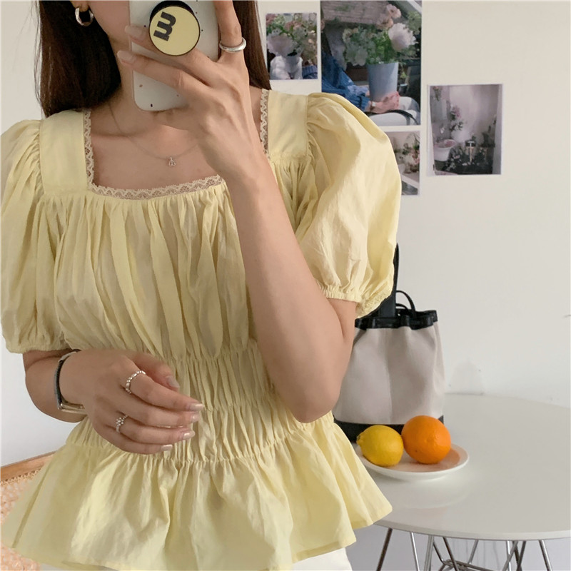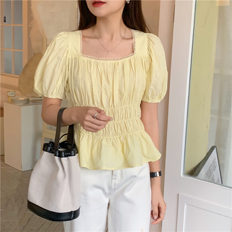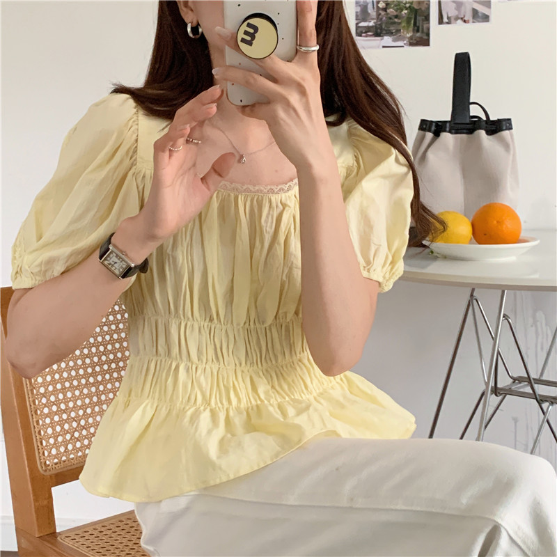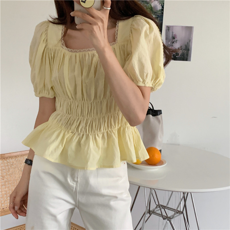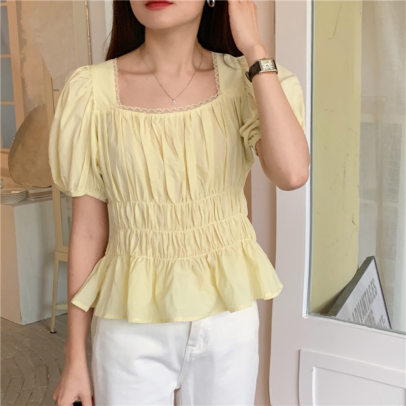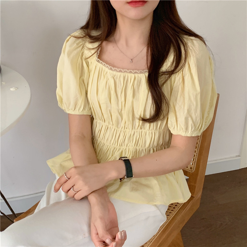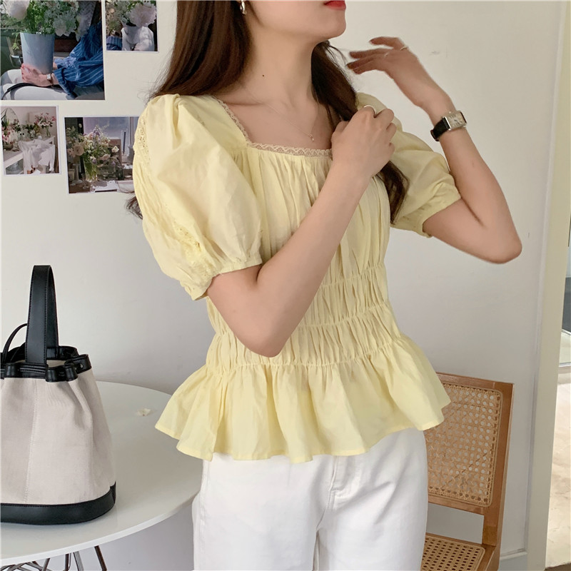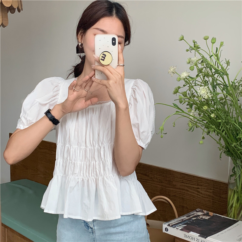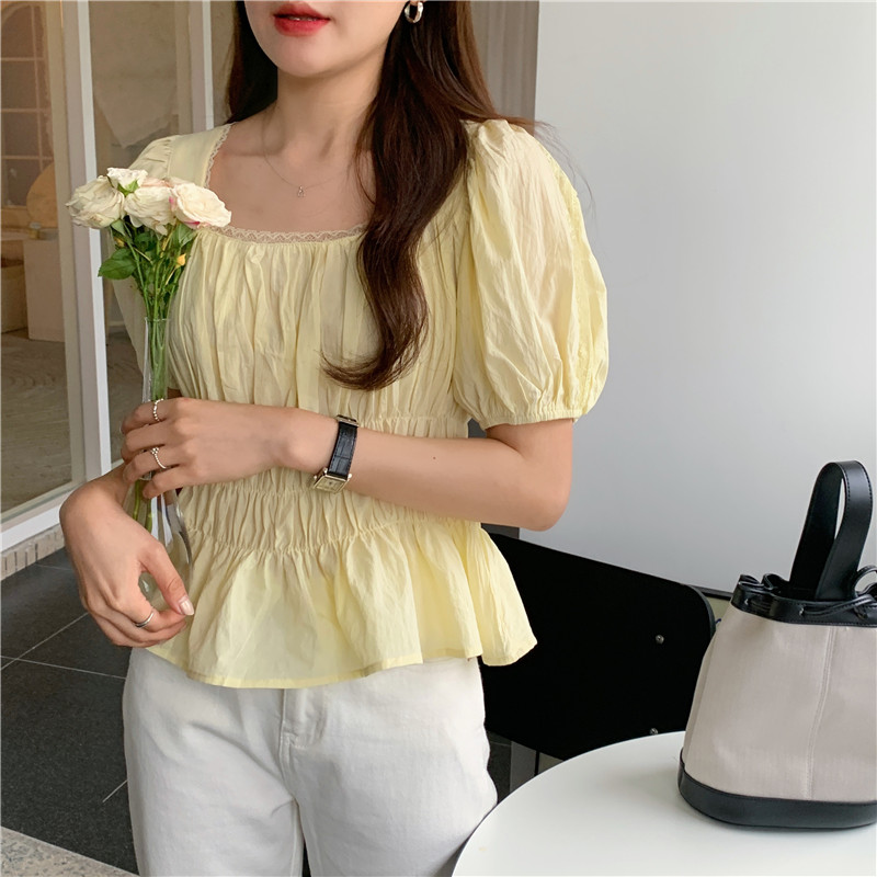 实拍实价 韩版法式浪漫花边拼接镂空短袖衬衫 2色现货