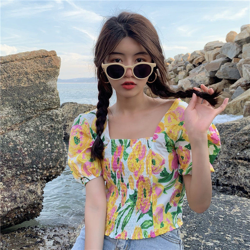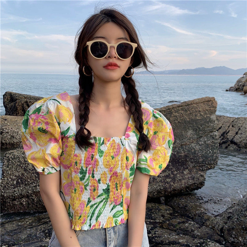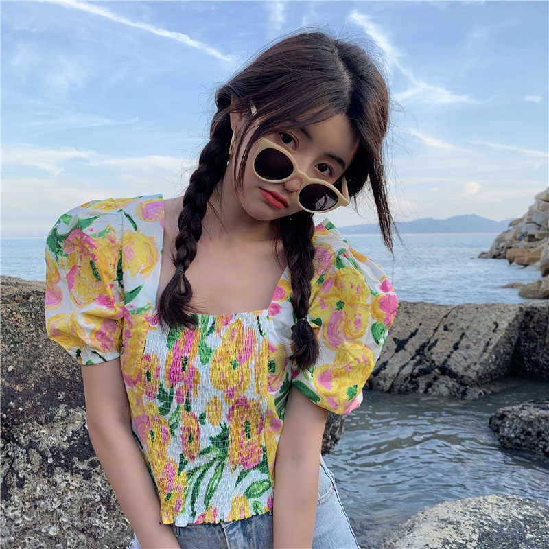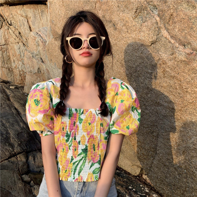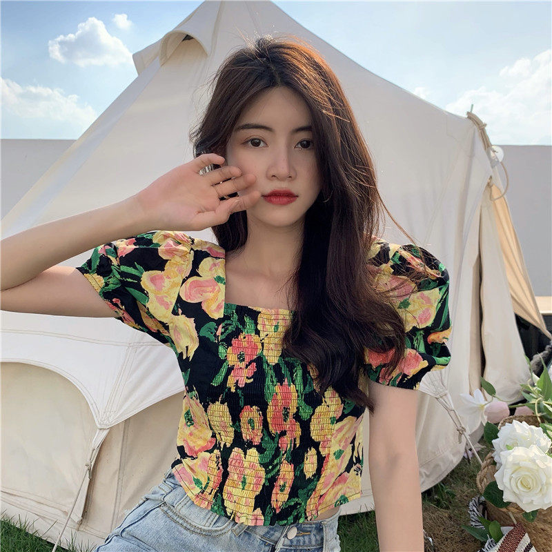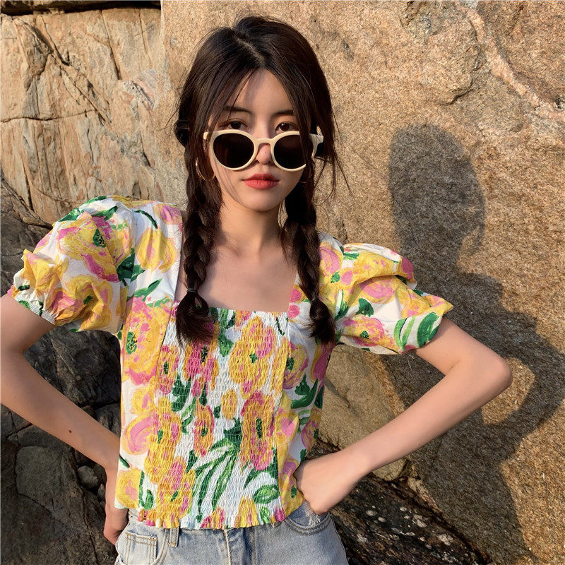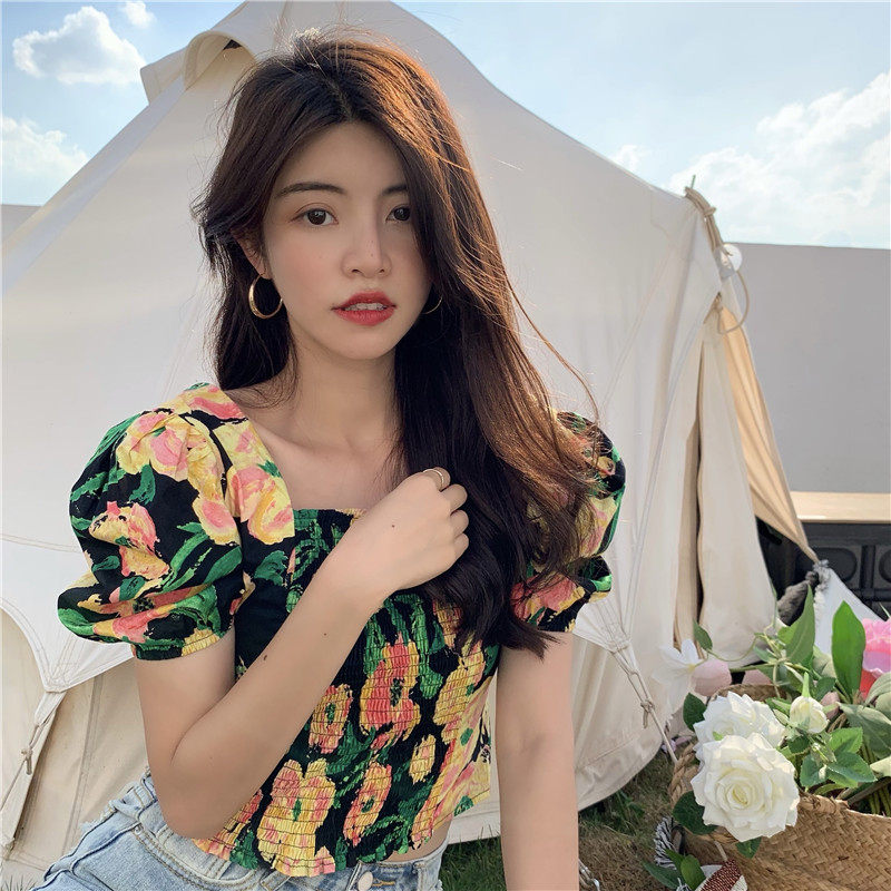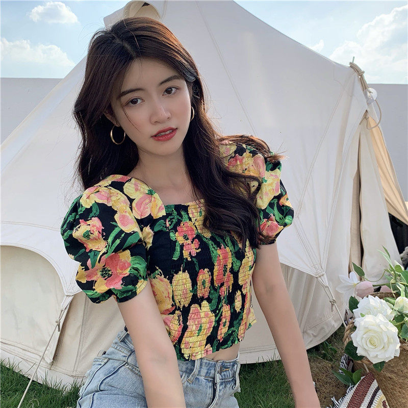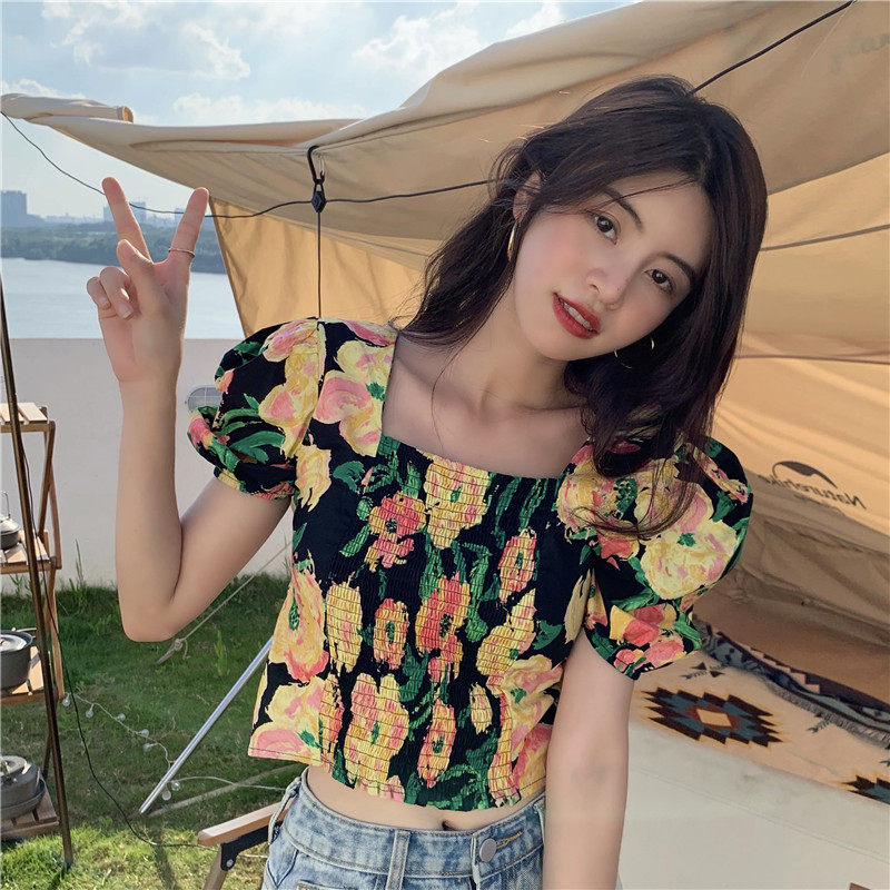 实拍实价法式泡泡袖方领修身显瘦花朵短款上衣弹力套头衬衫