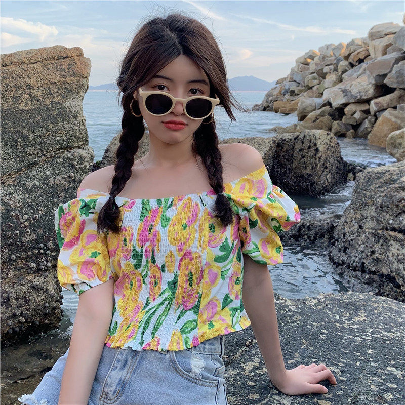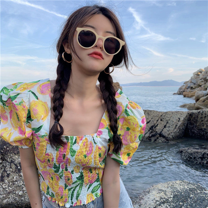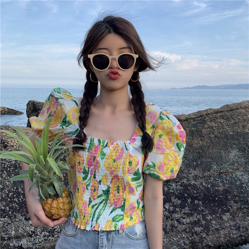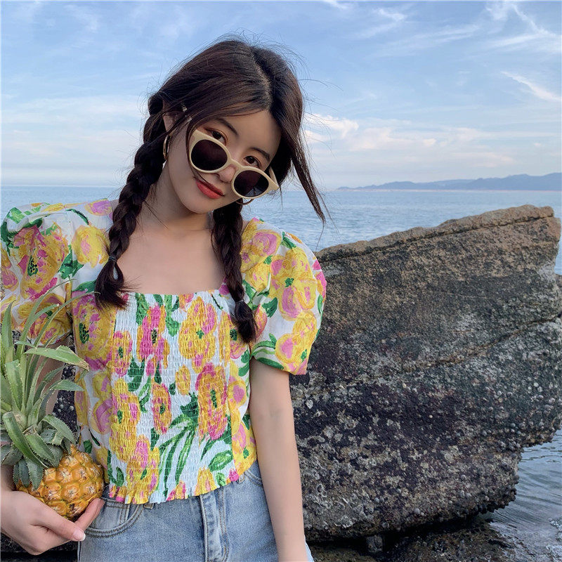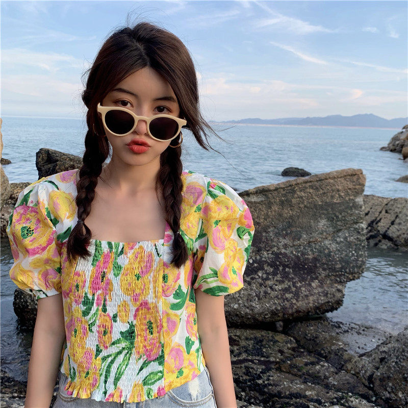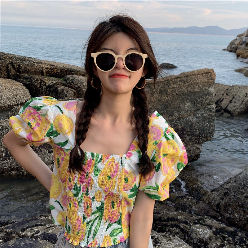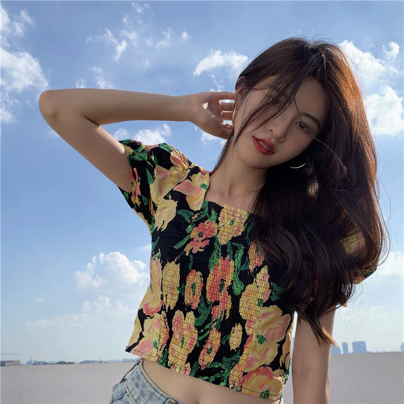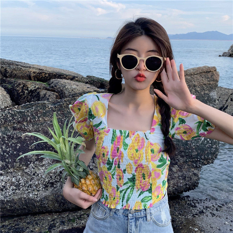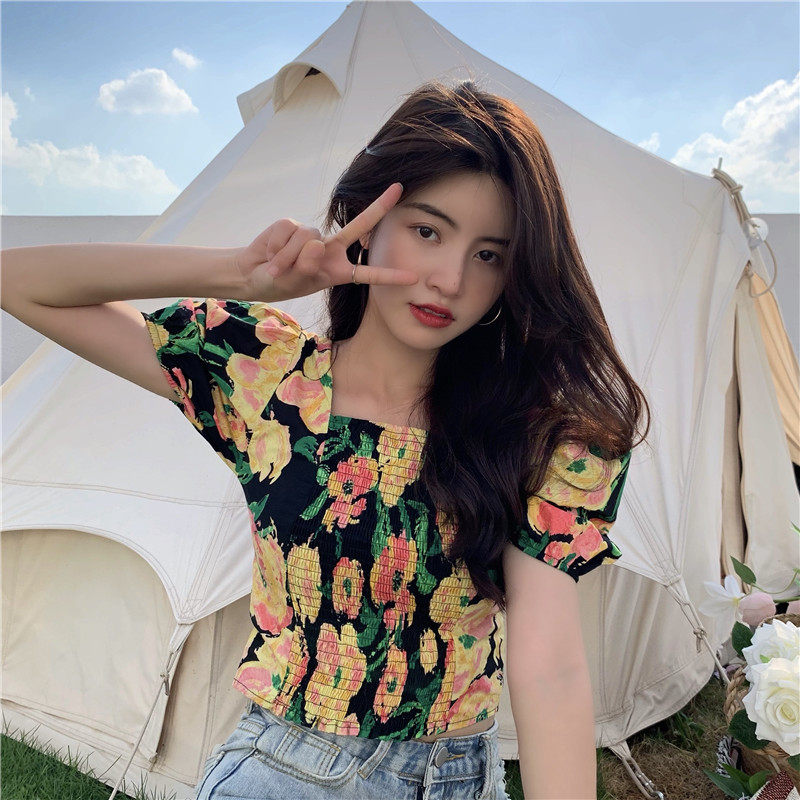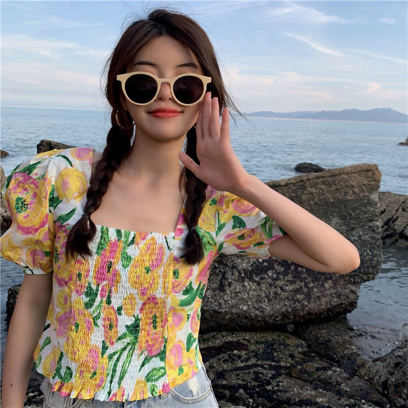 实拍实价法式泡泡袖方领修身显瘦花朵短款上衣弹力套头衬衫