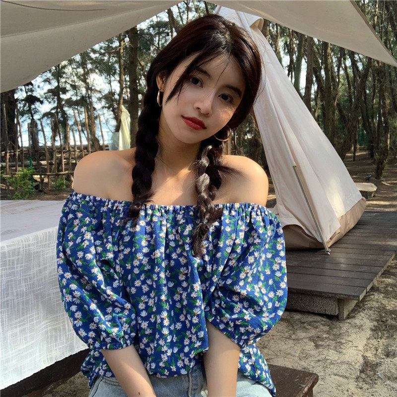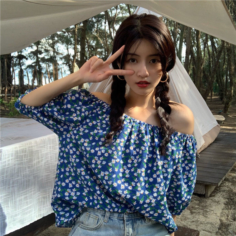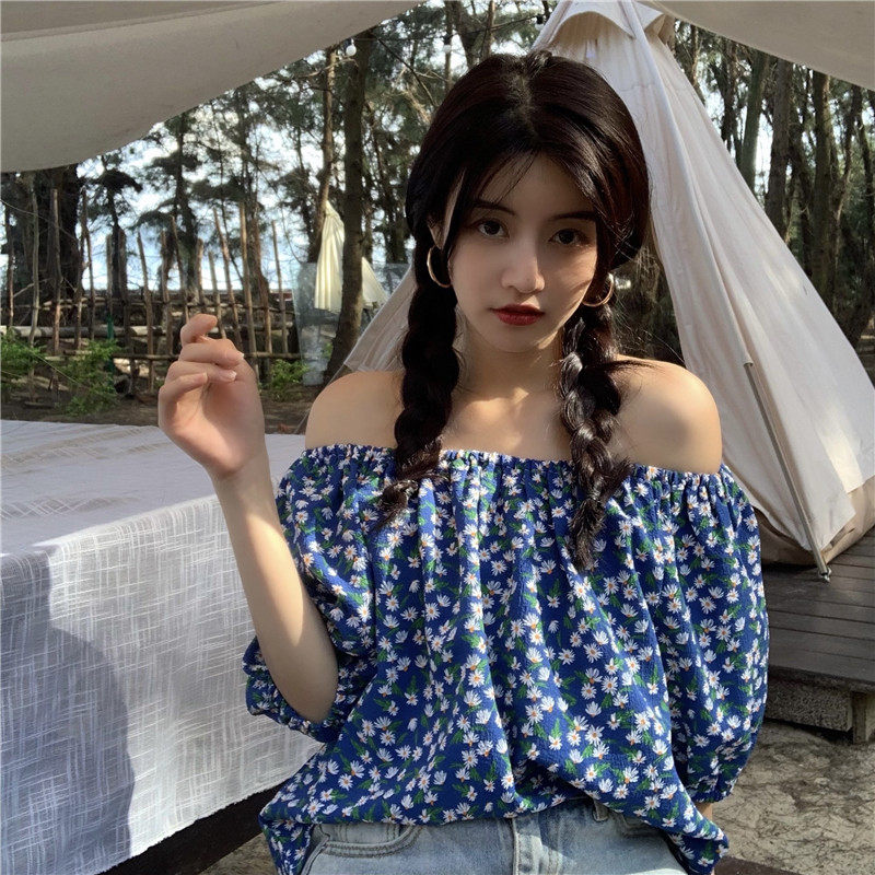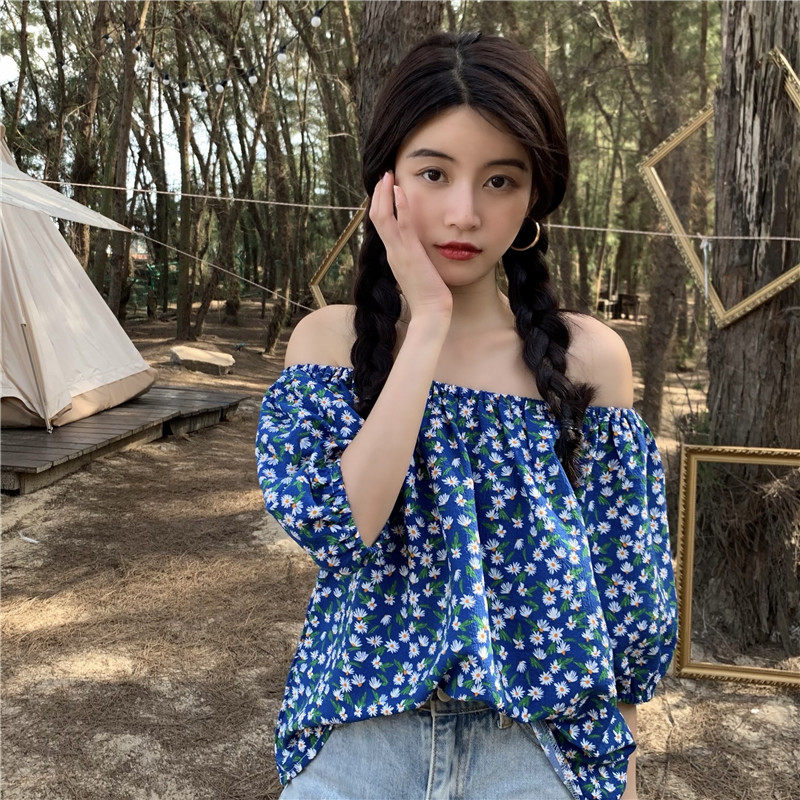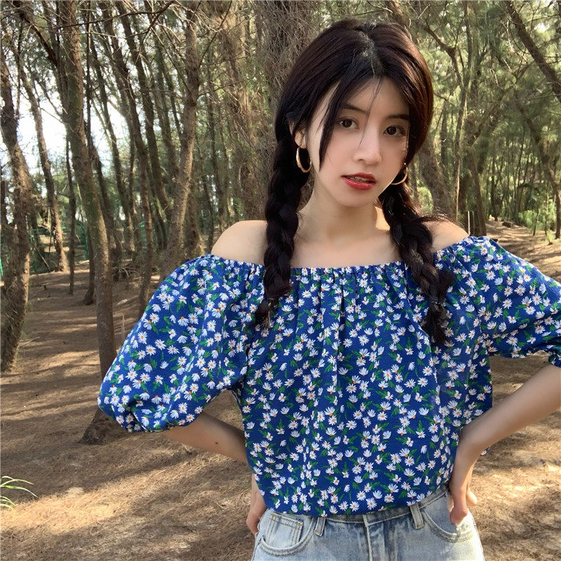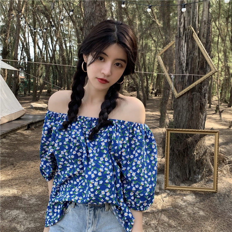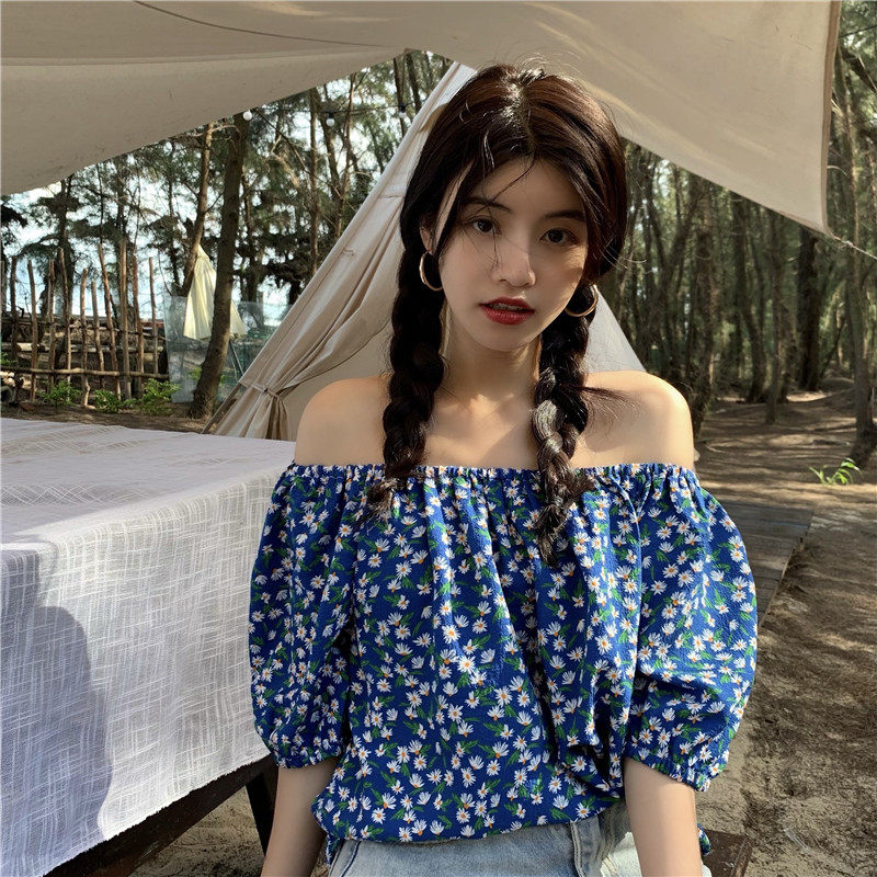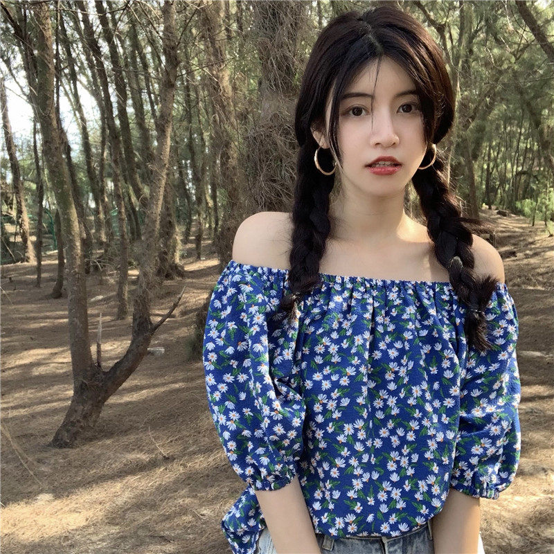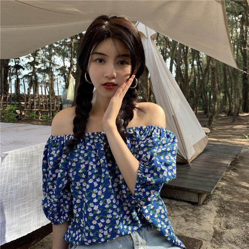 实拍实价法式复古小碎花衬衫设计感气质短袖一字肩两穿上衣
