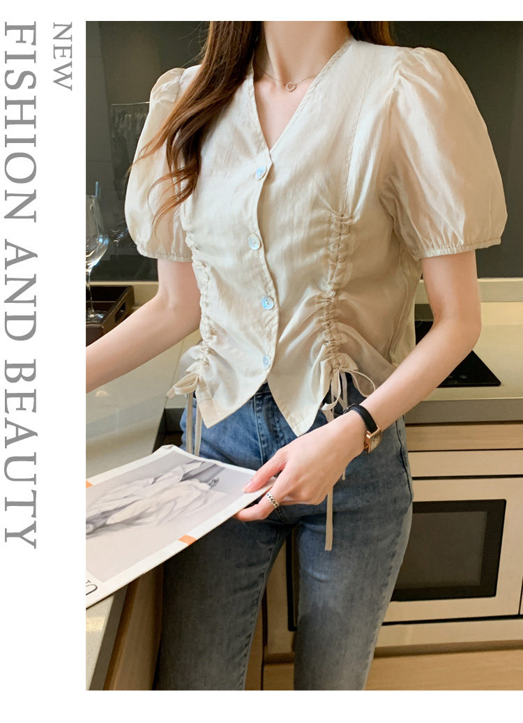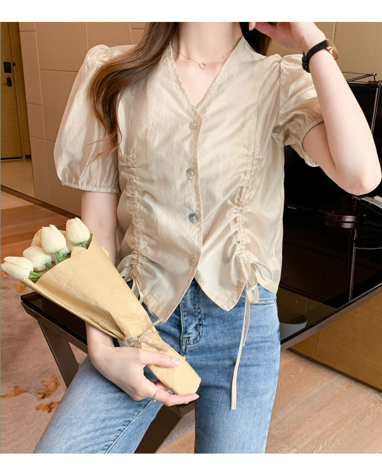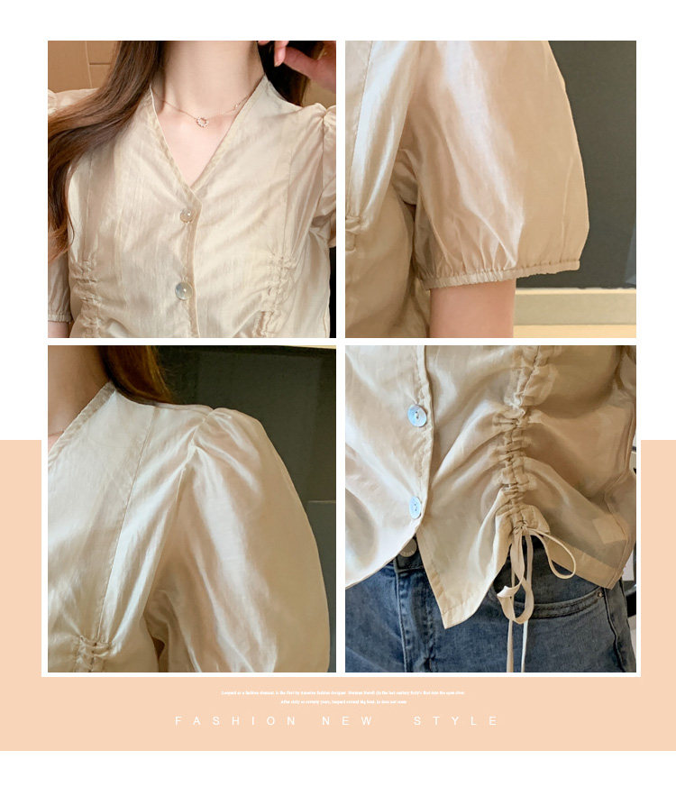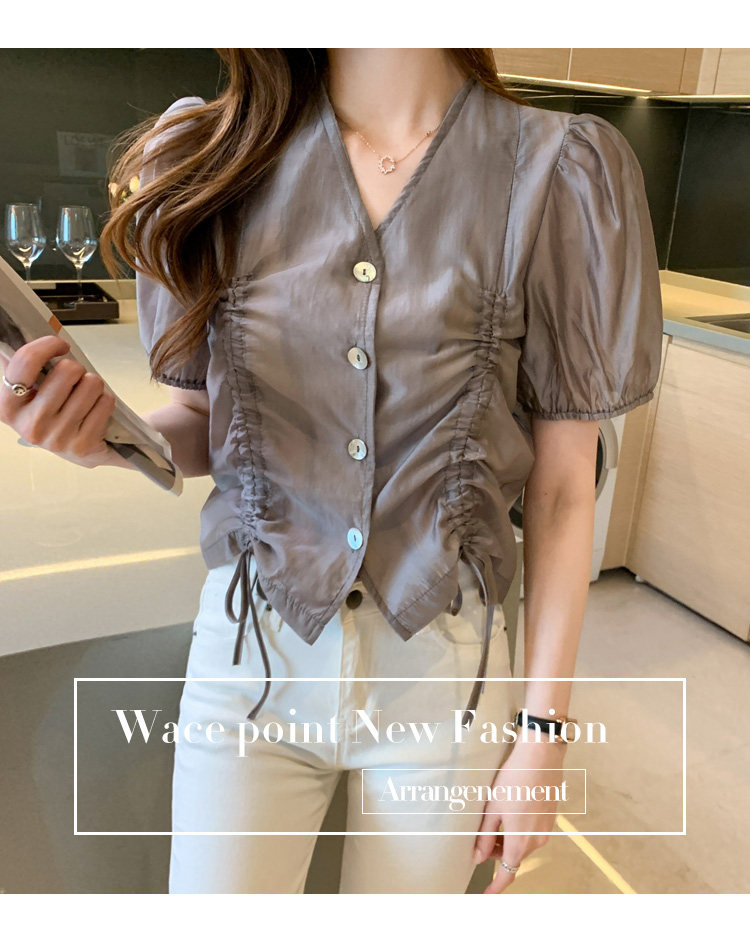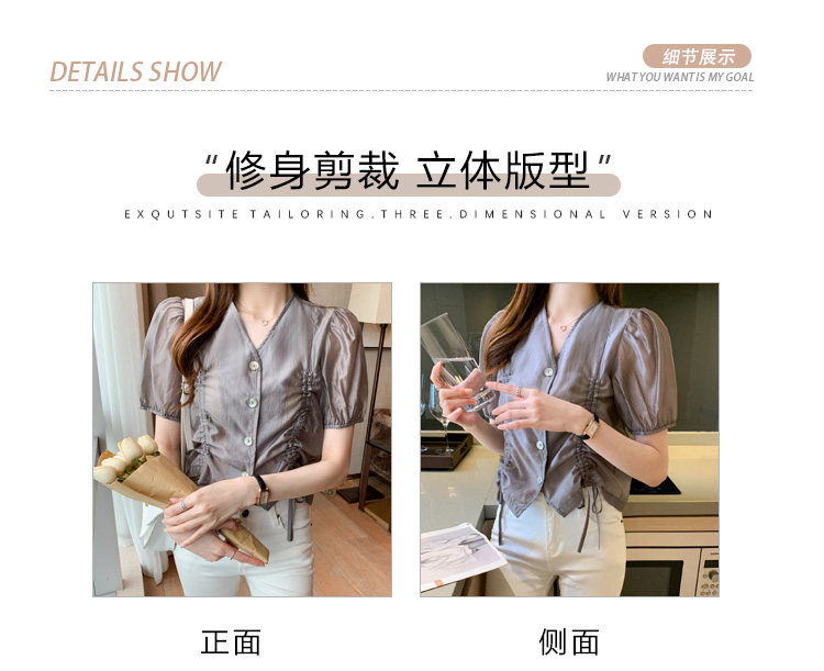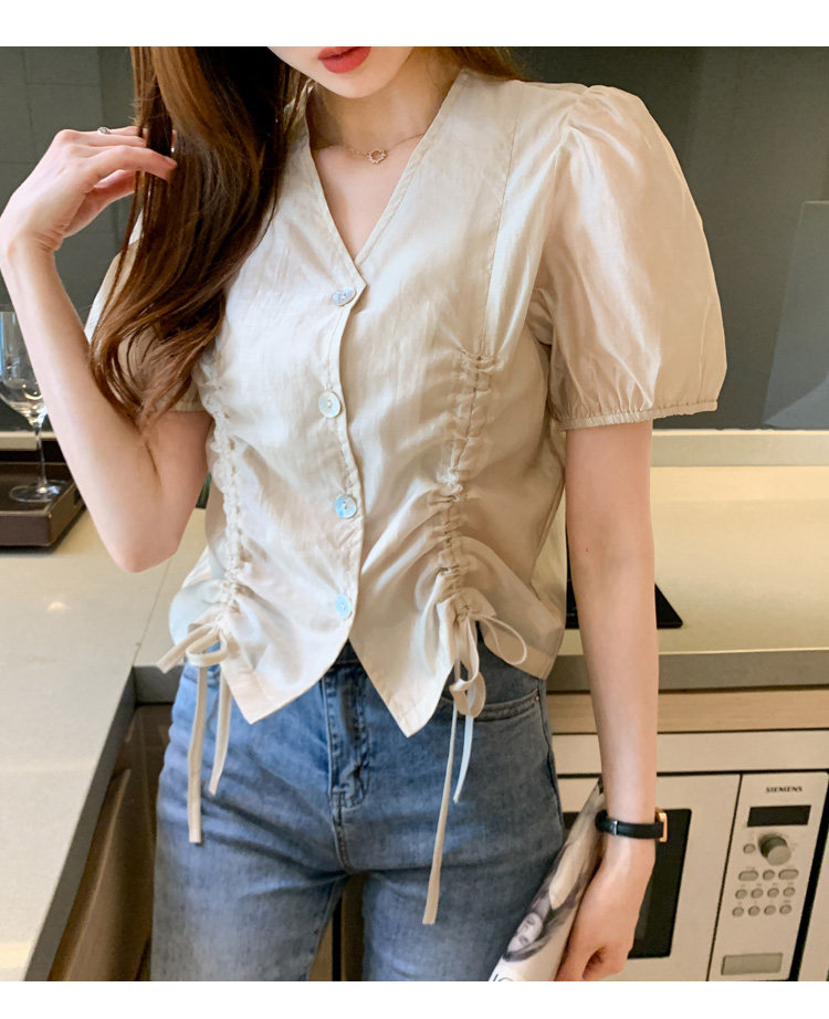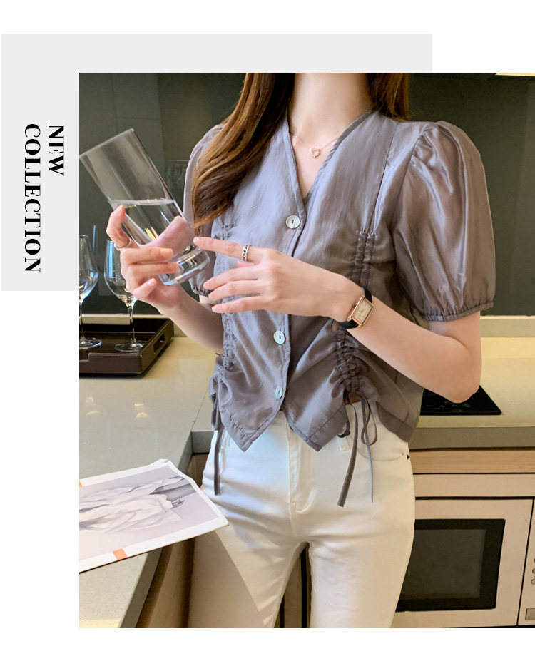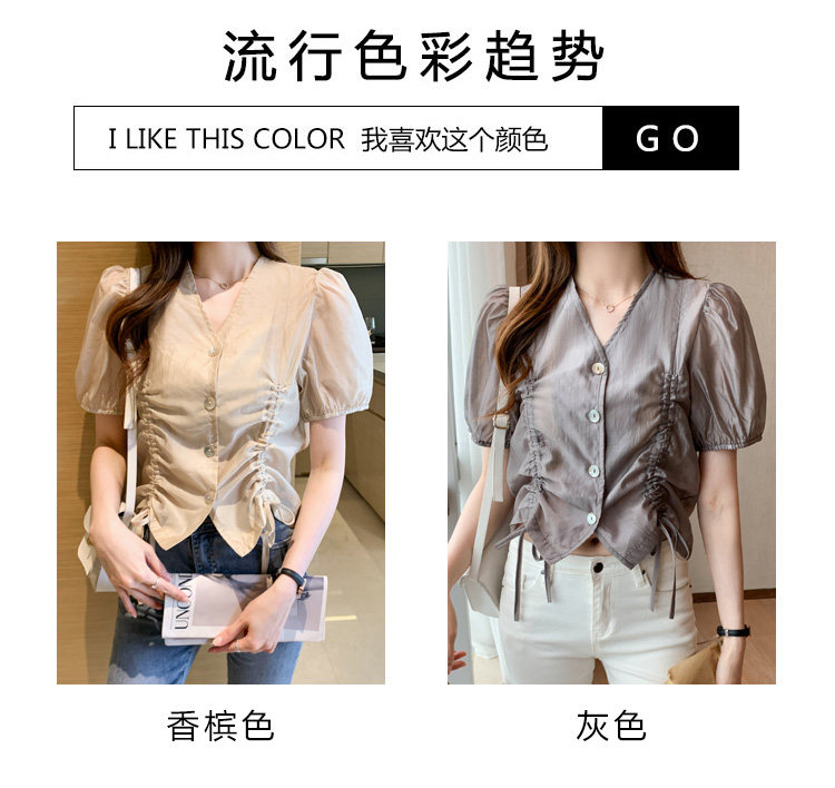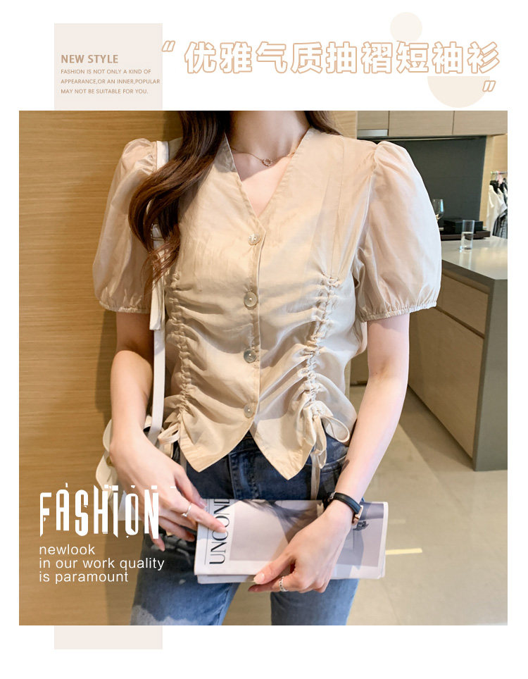 褶皱雪纺衫短袖女夏2021新款V领抽绳修身小衫法士短款设计感上衣