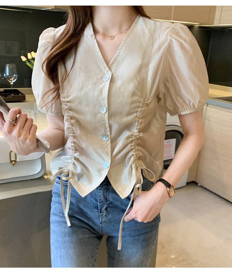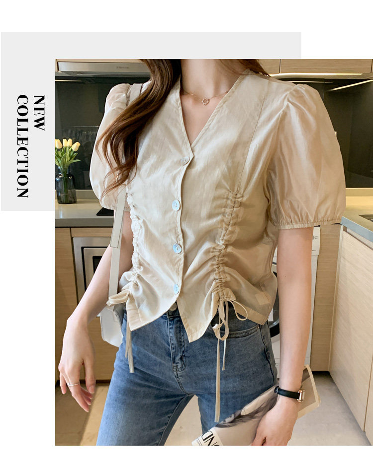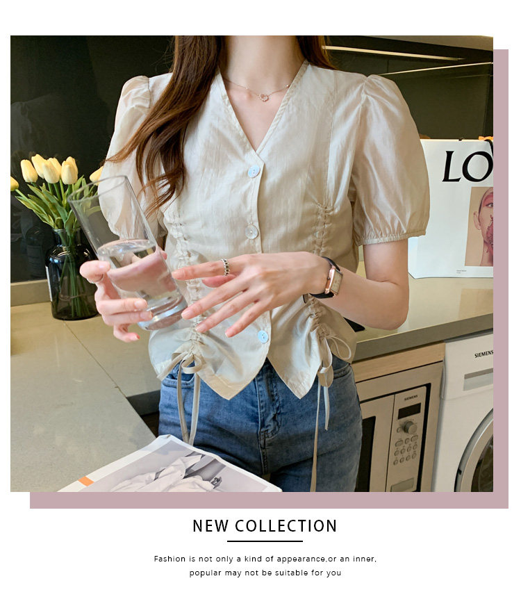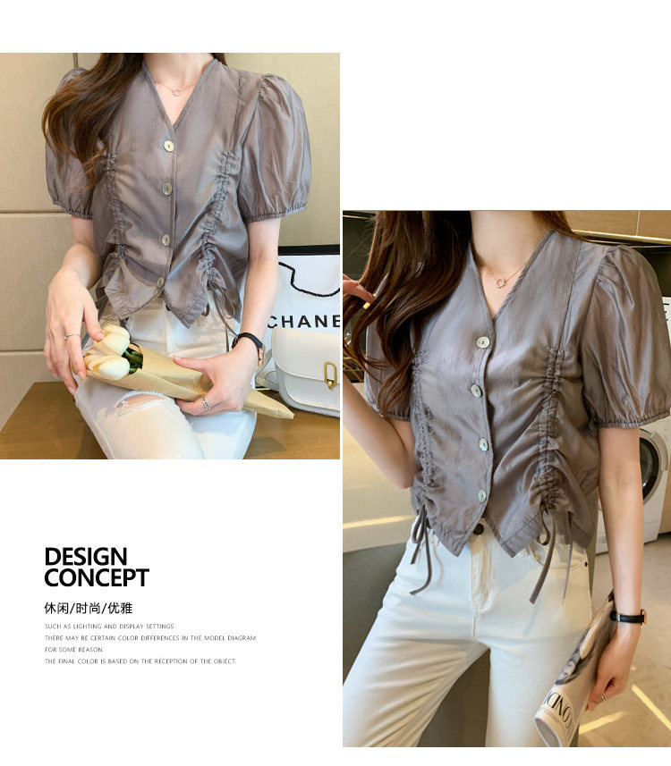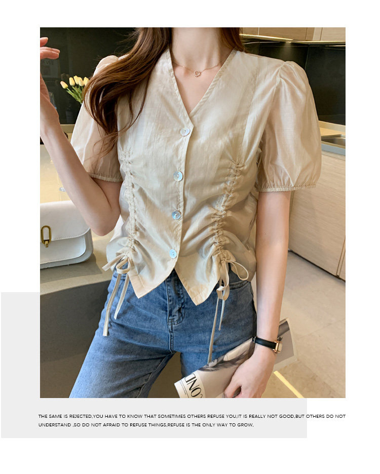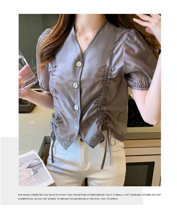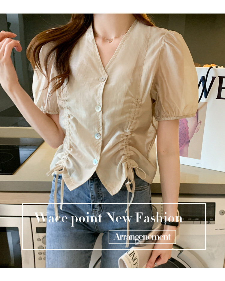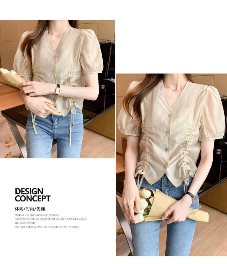 褶皱雪纺衫短袖女夏2021新款V领抽绳修身小衫法士短款设计感上衣