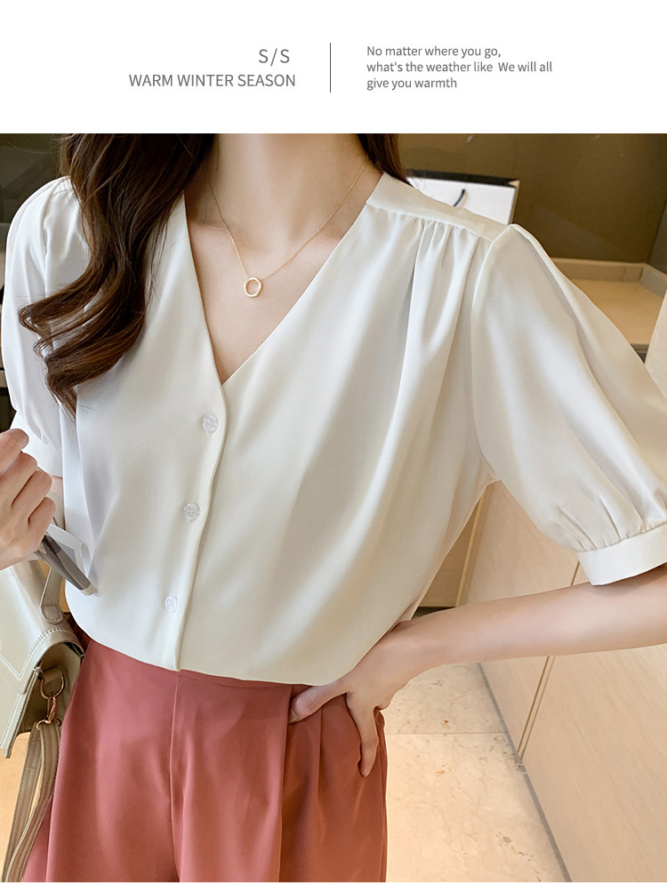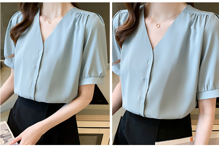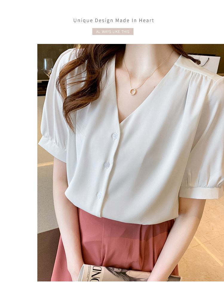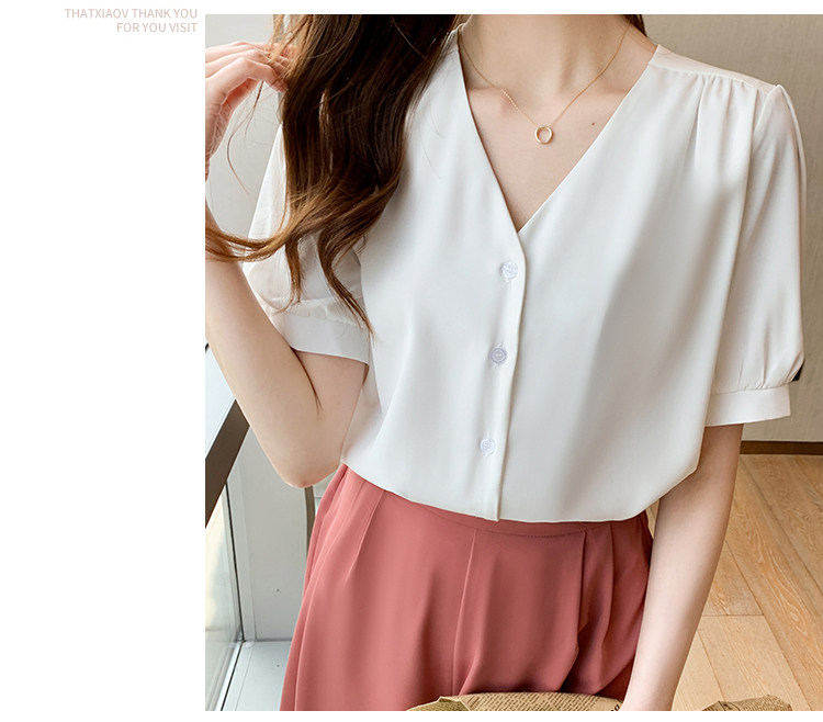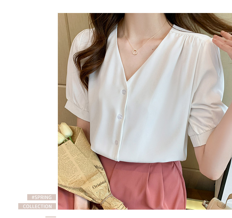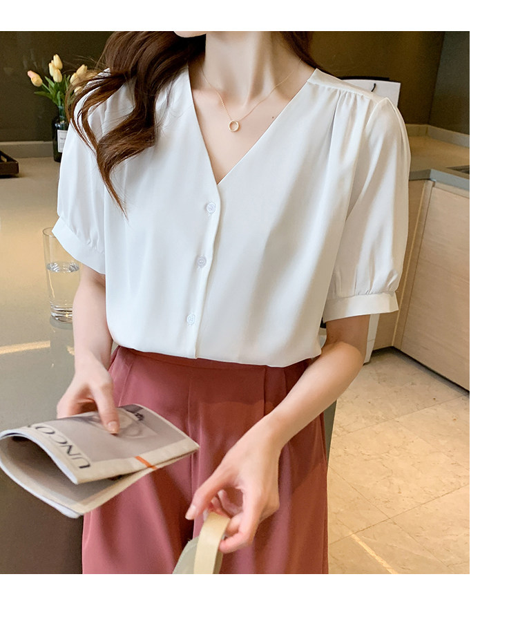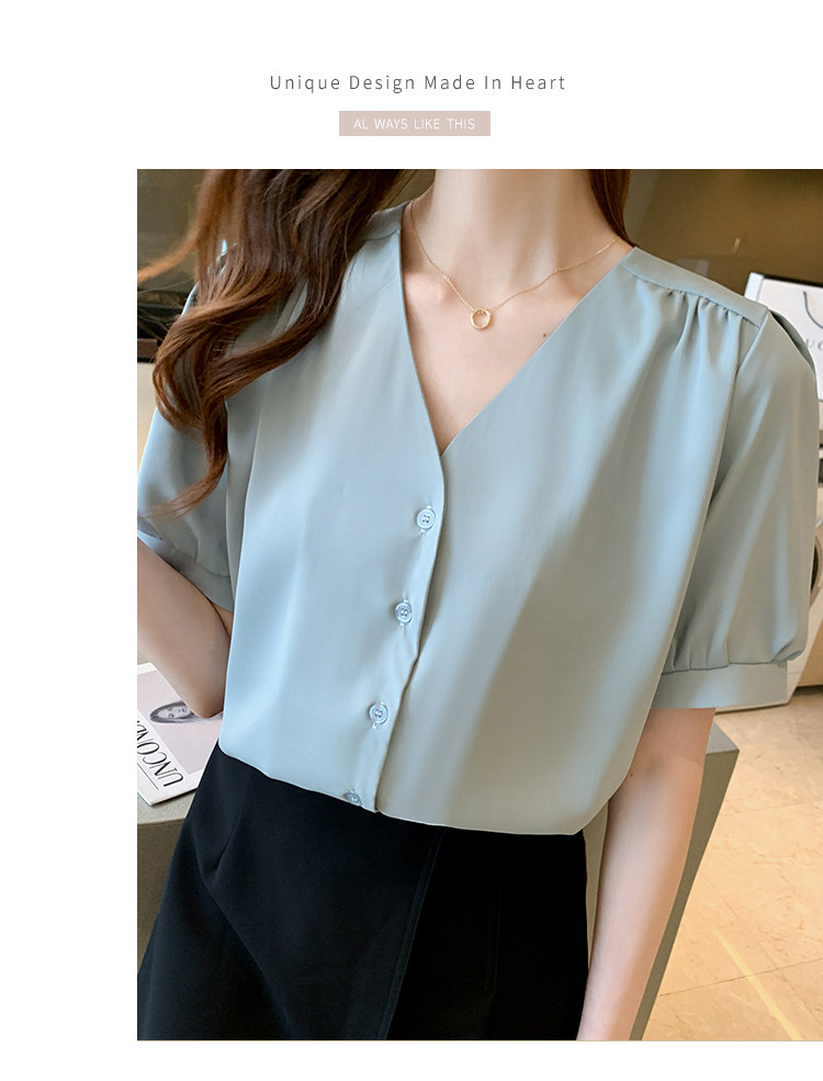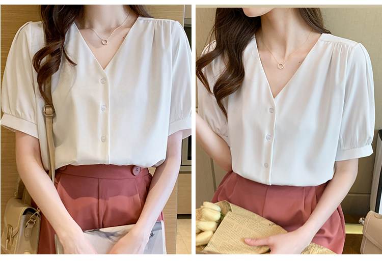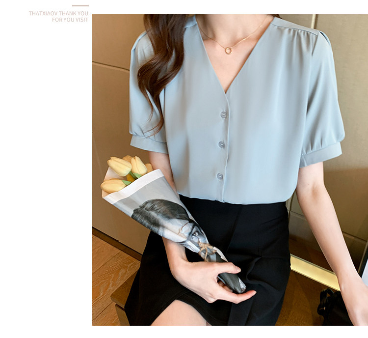 实拍小众V领衬衣女夏新款百搭小性感气质宽松短袖显瘦雪纺衫