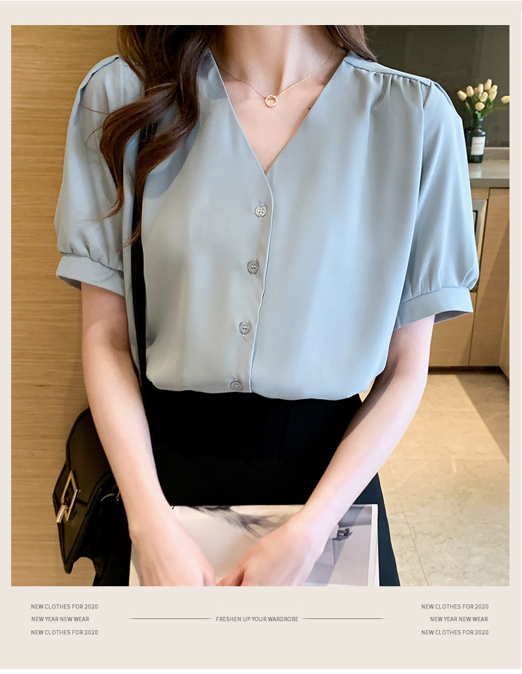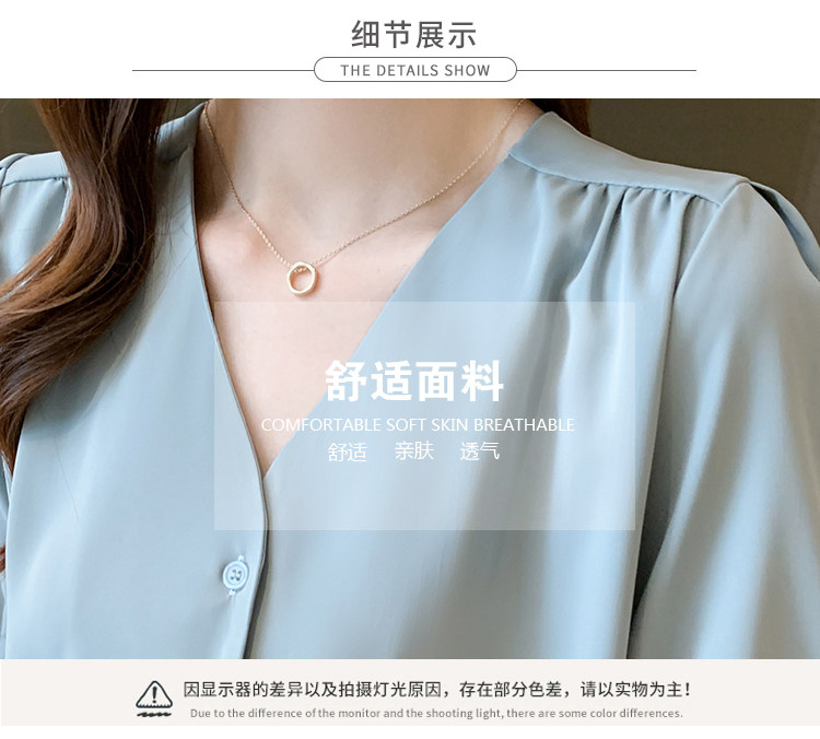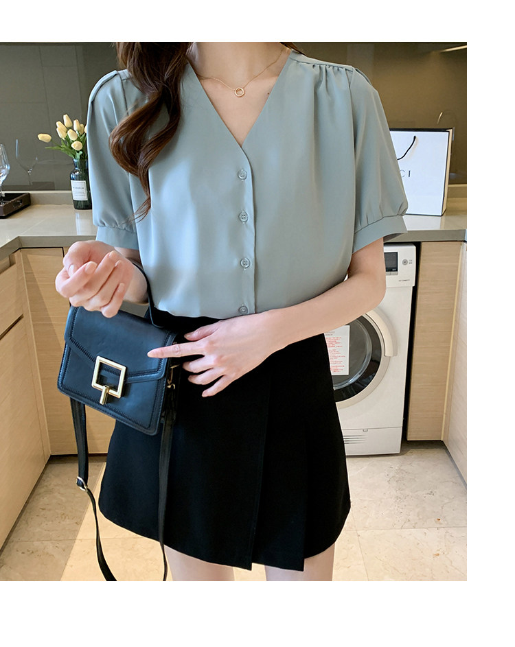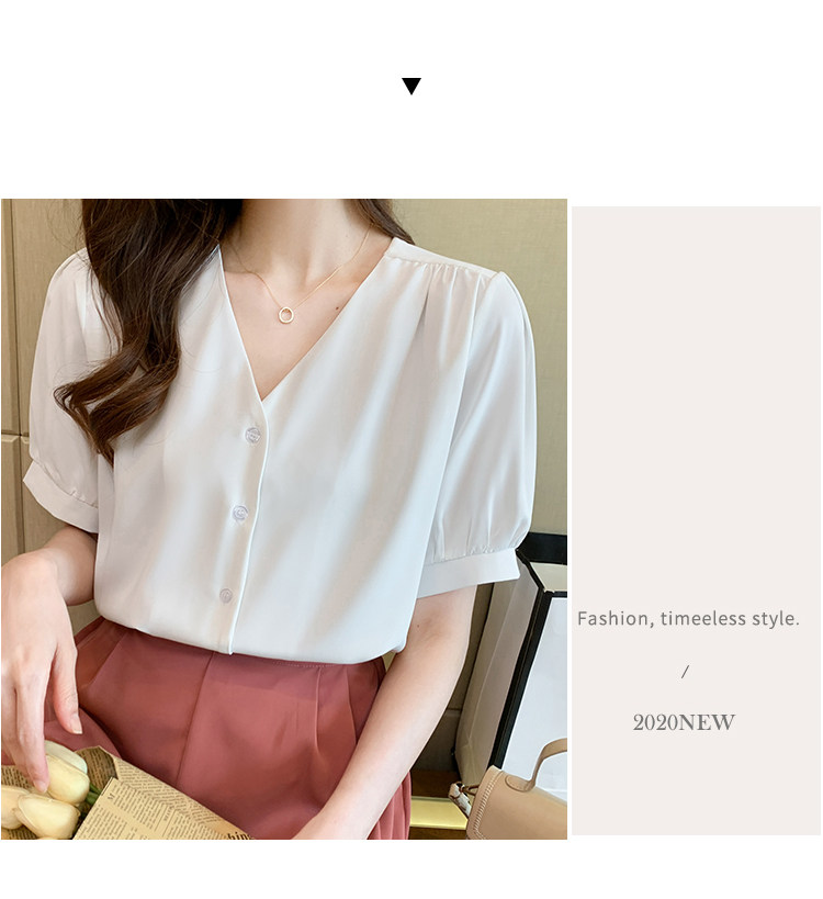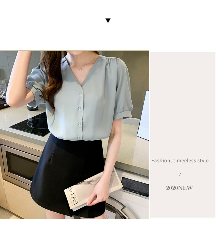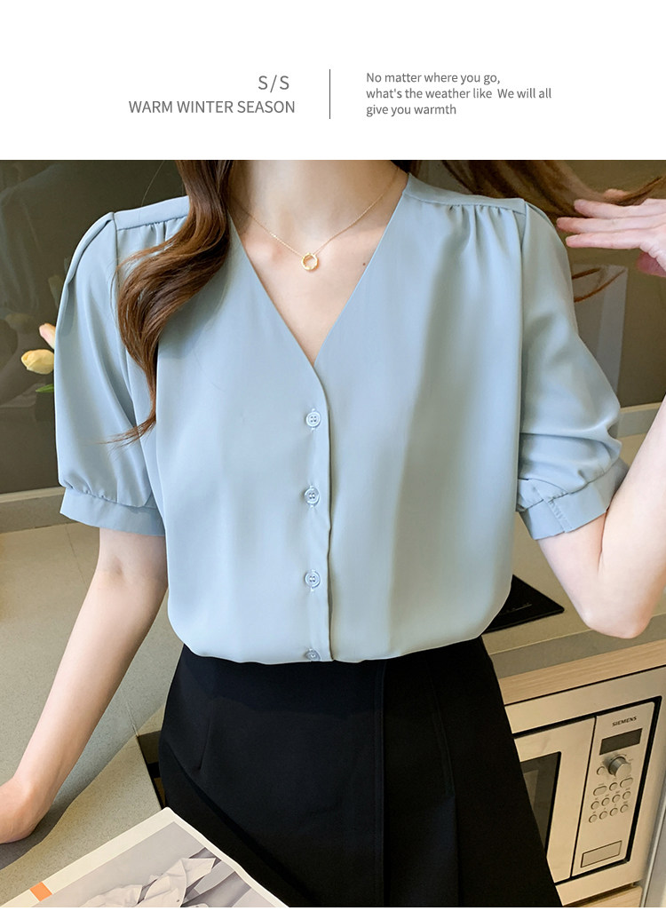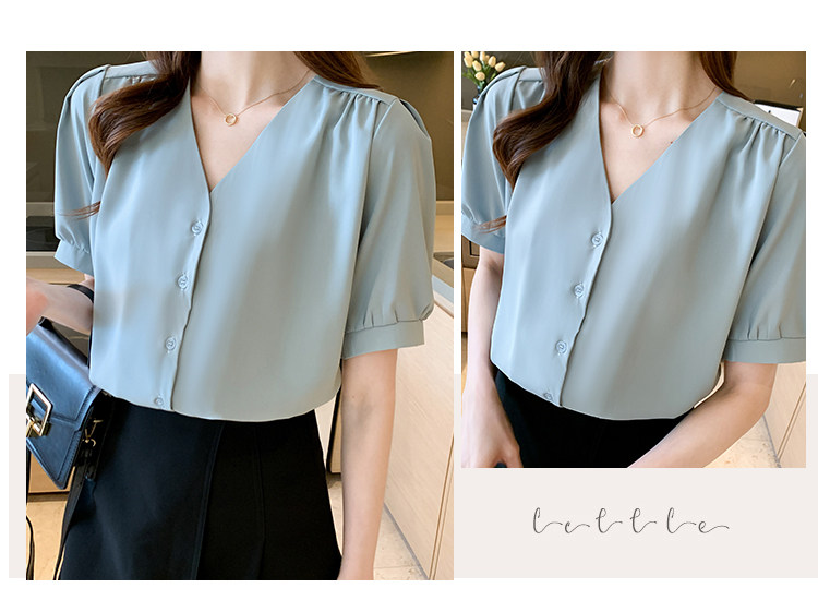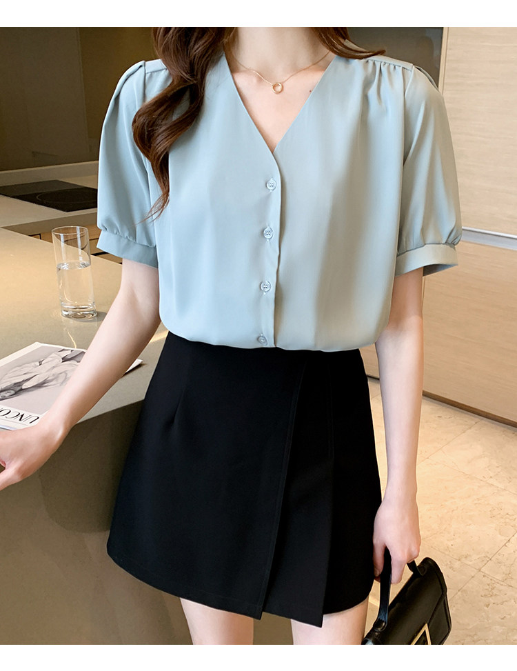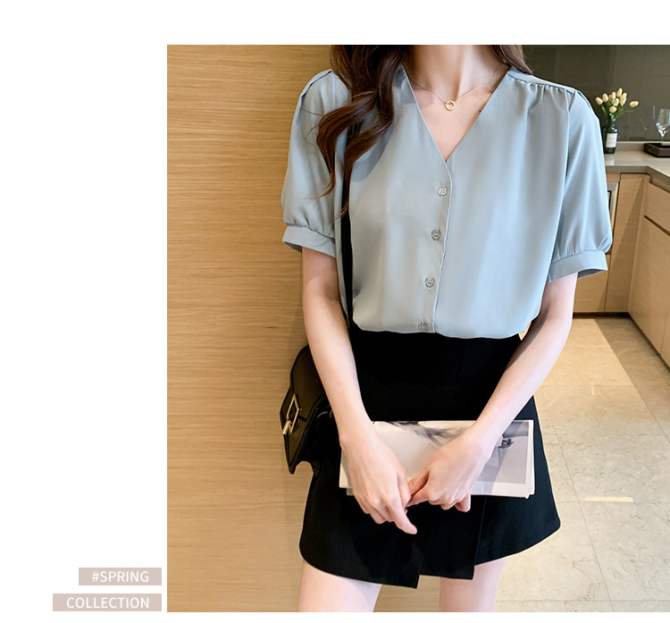 实拍小众V领衬衣女夏新款百搭小性感气质宽松短袖显瘦雪纺衫