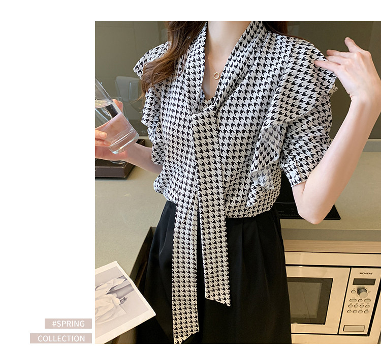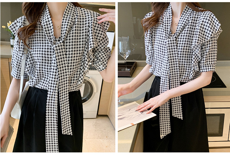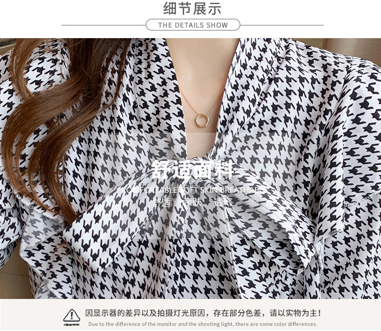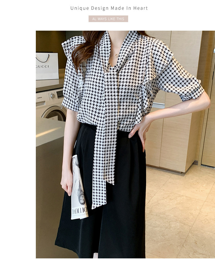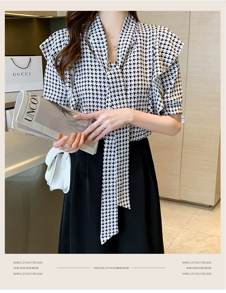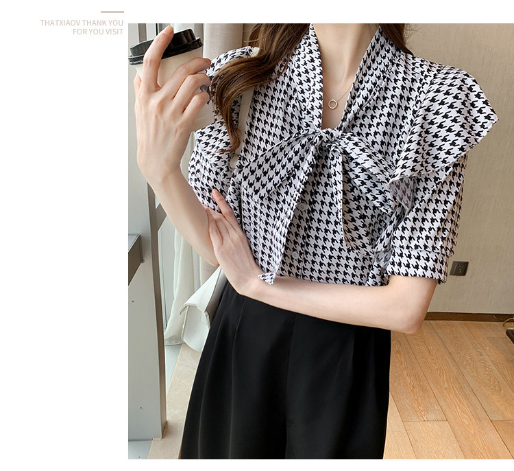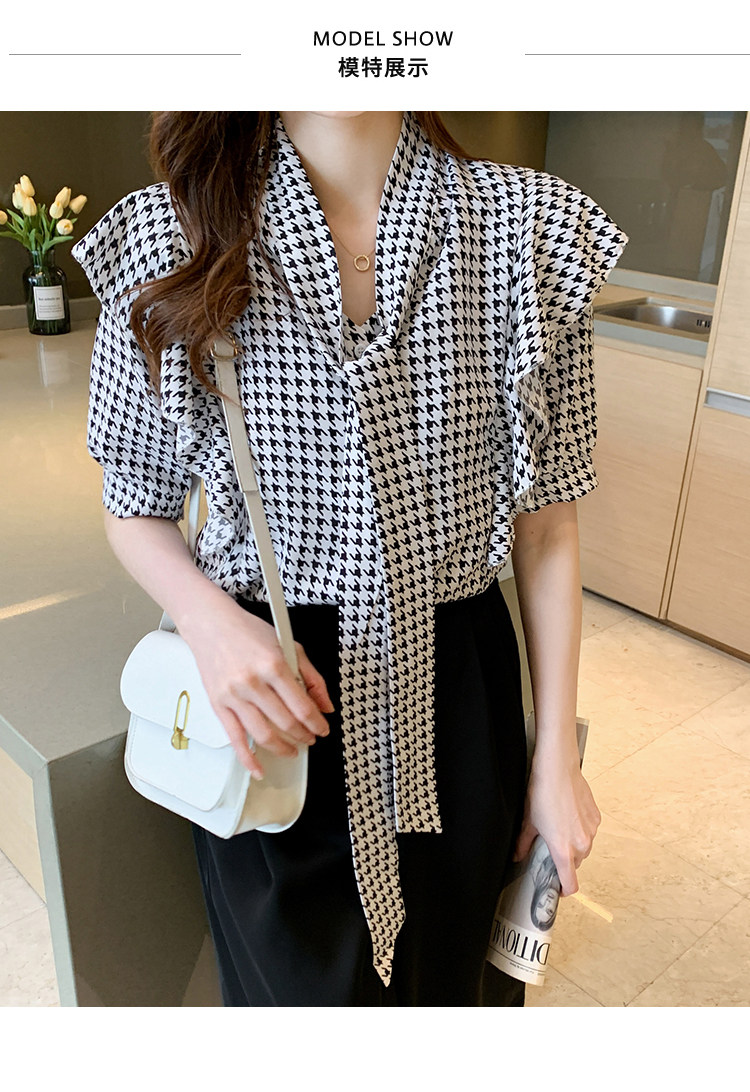 2021韩版千鸟格中袖衬衫女 宽松蝴蝶结飘带设计感小众雪纺衫