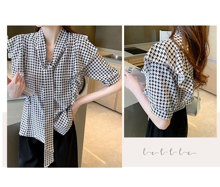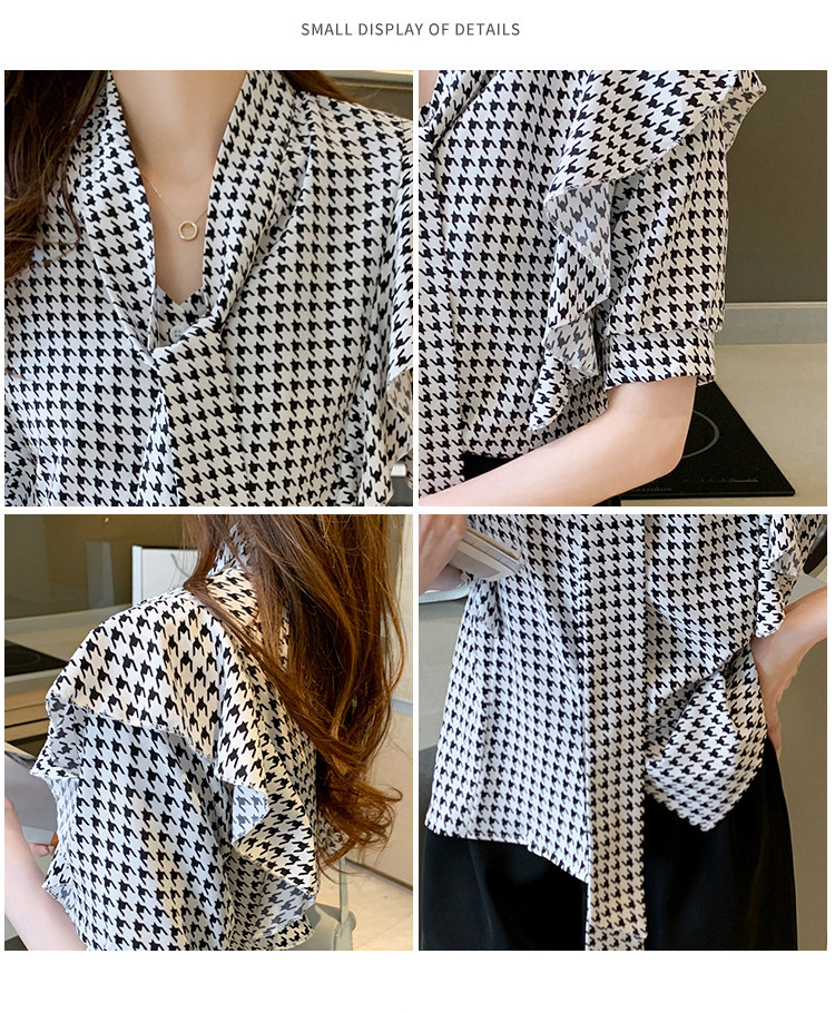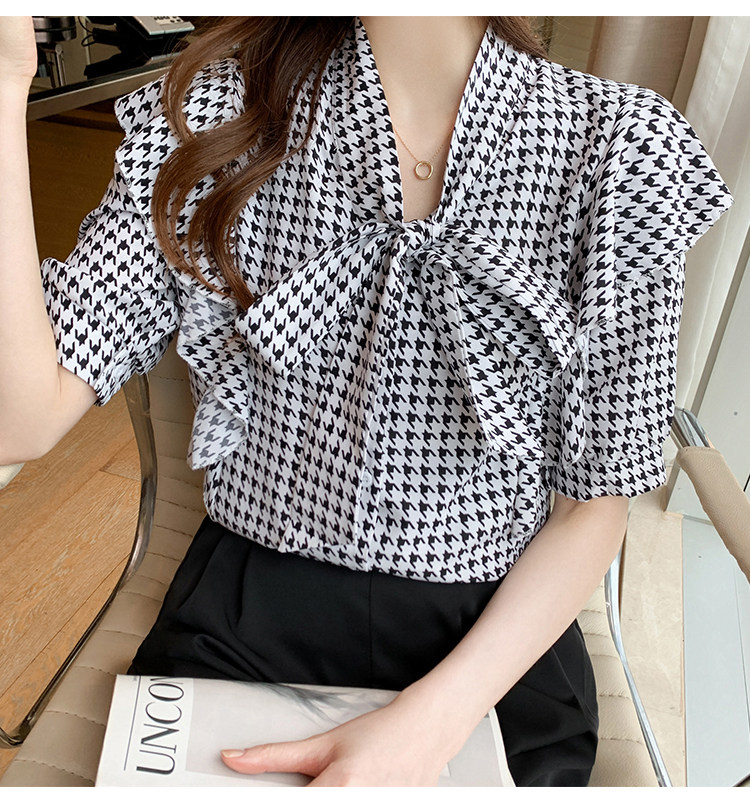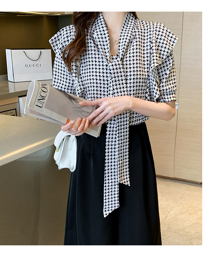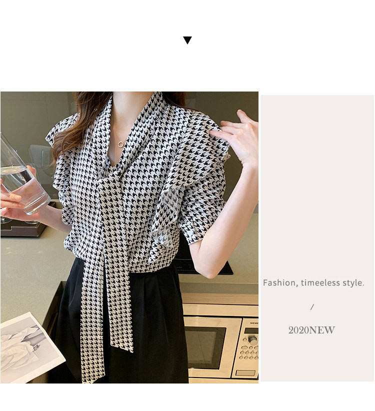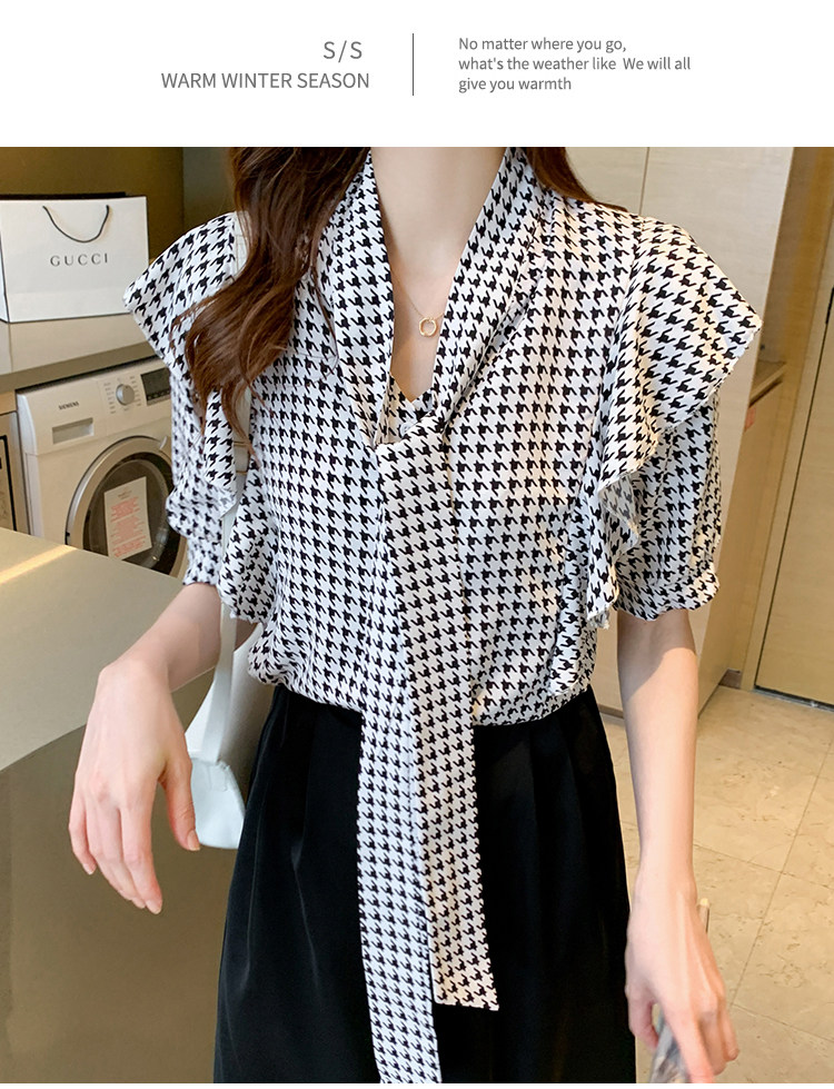 2021韩版千鸟格中袖衬衫女 宽松蝴蝶结飘带设计感小众雪纺衫