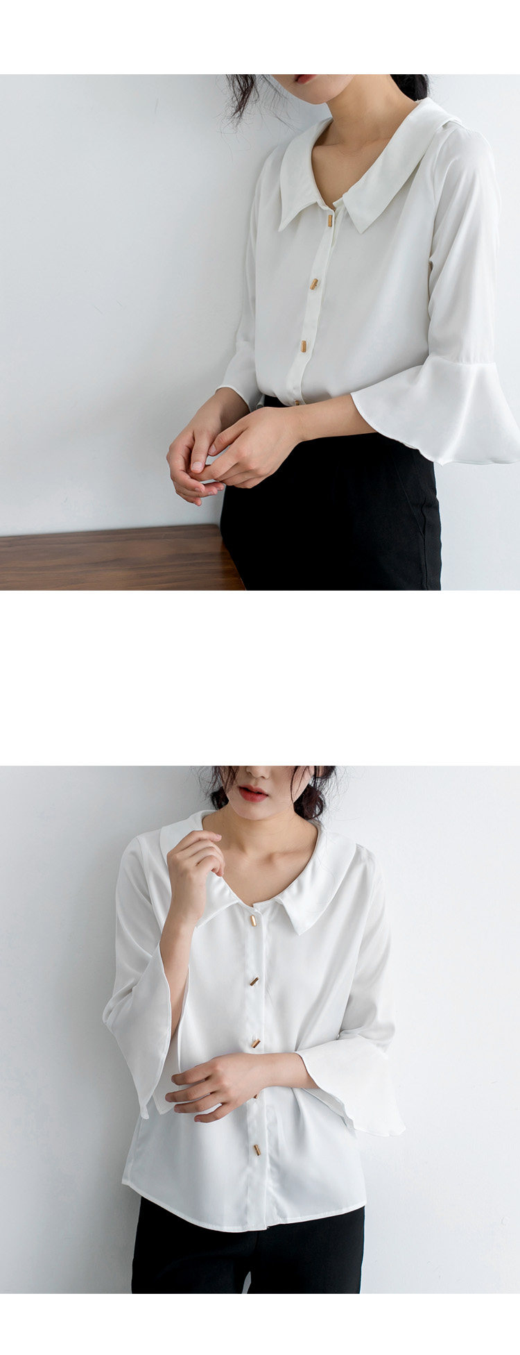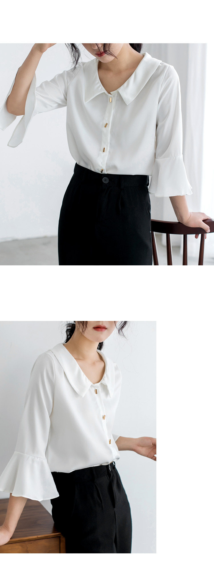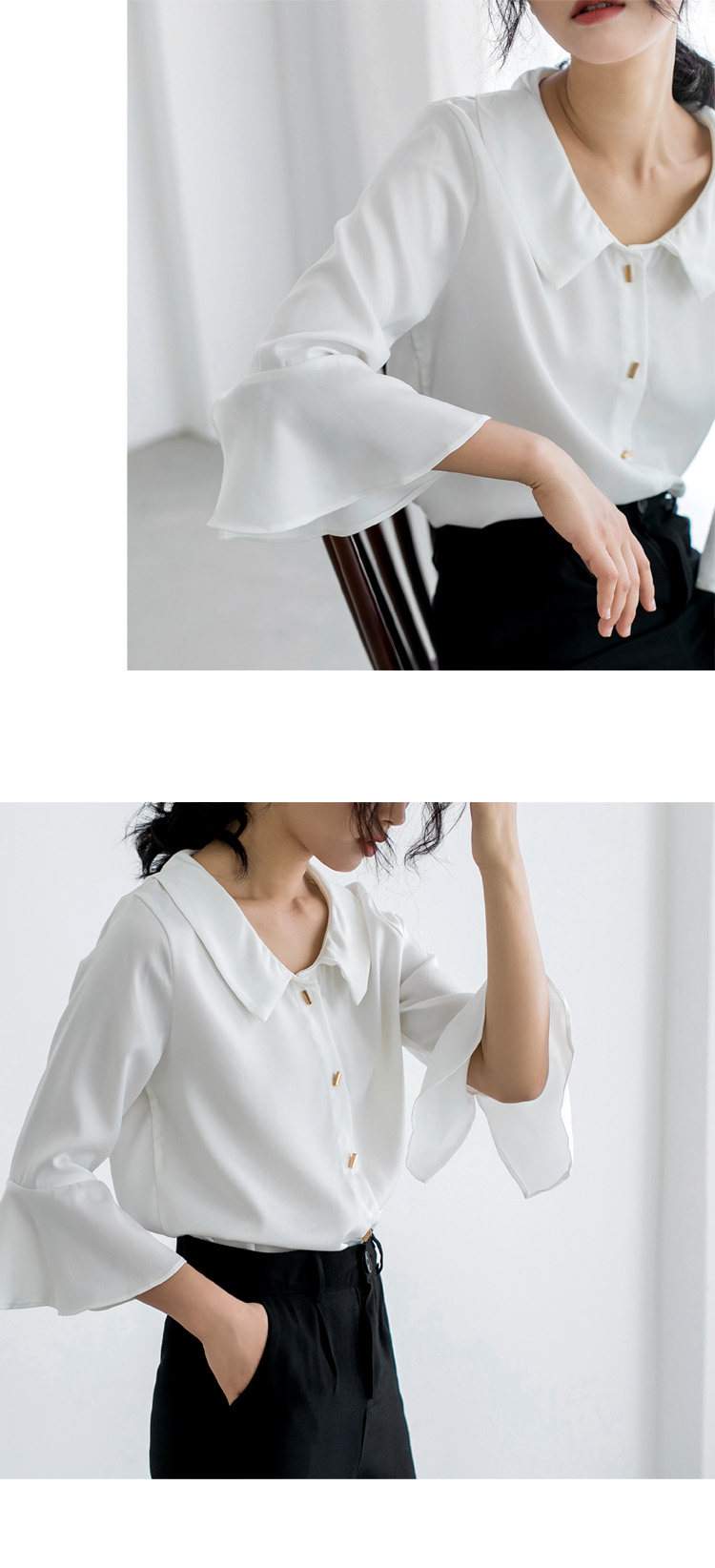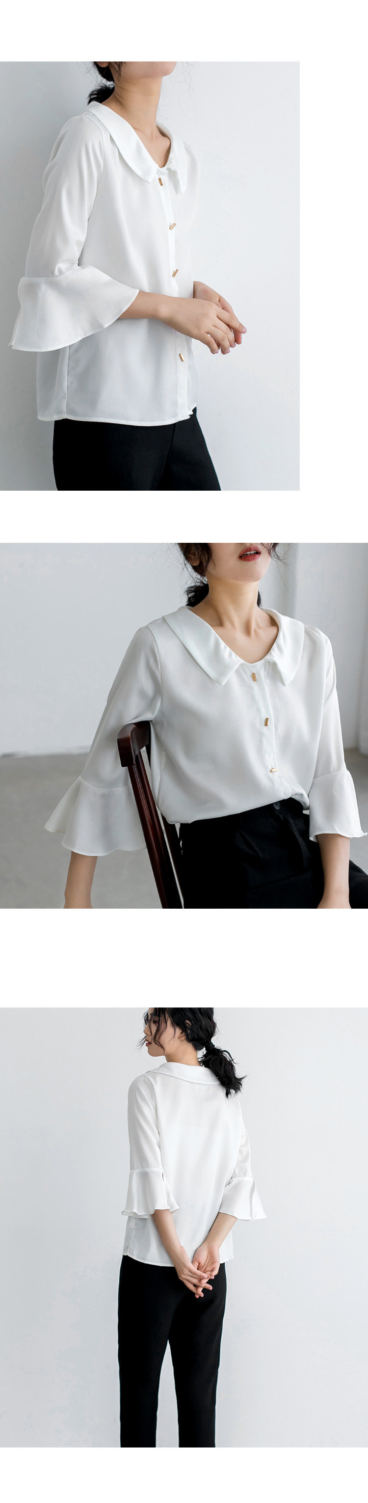 实拍小众设计感娃娃领大领口雪纺衫 喇叭袖衬衣女