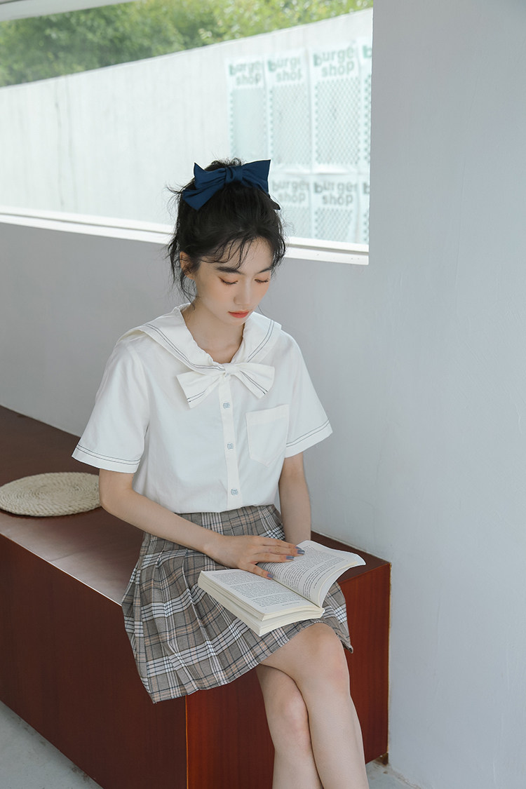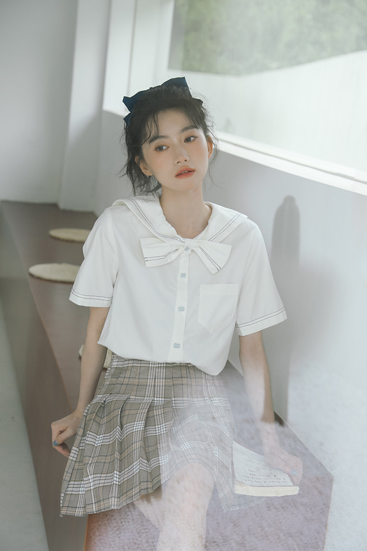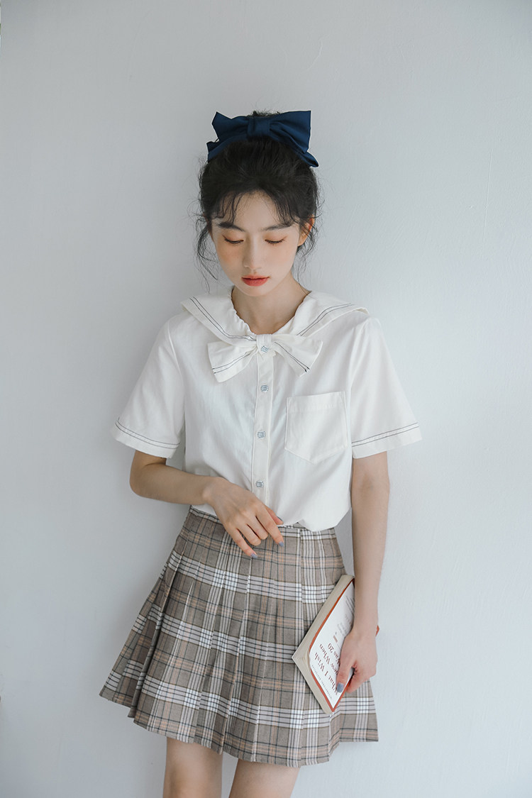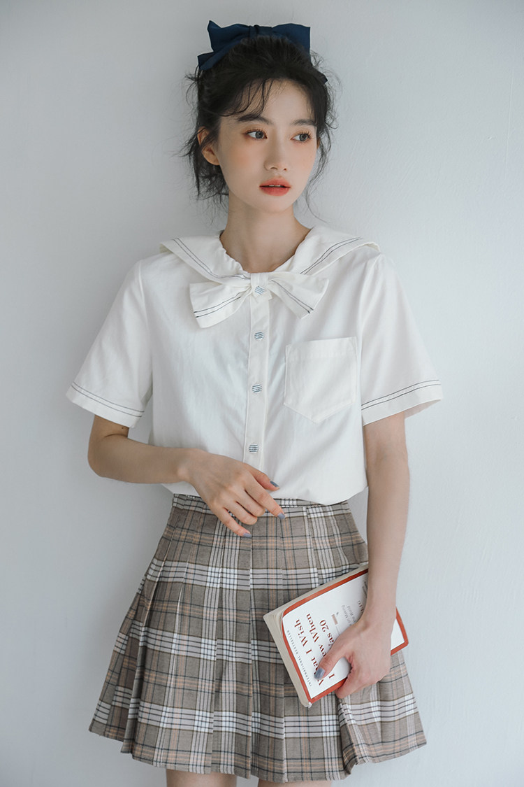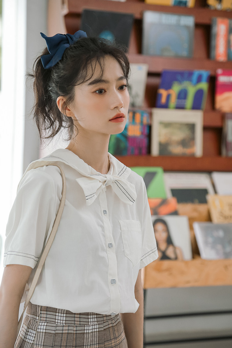 实拍2021夏季新款 明线设计打结蝴蝶结海军领衬衫上衣女