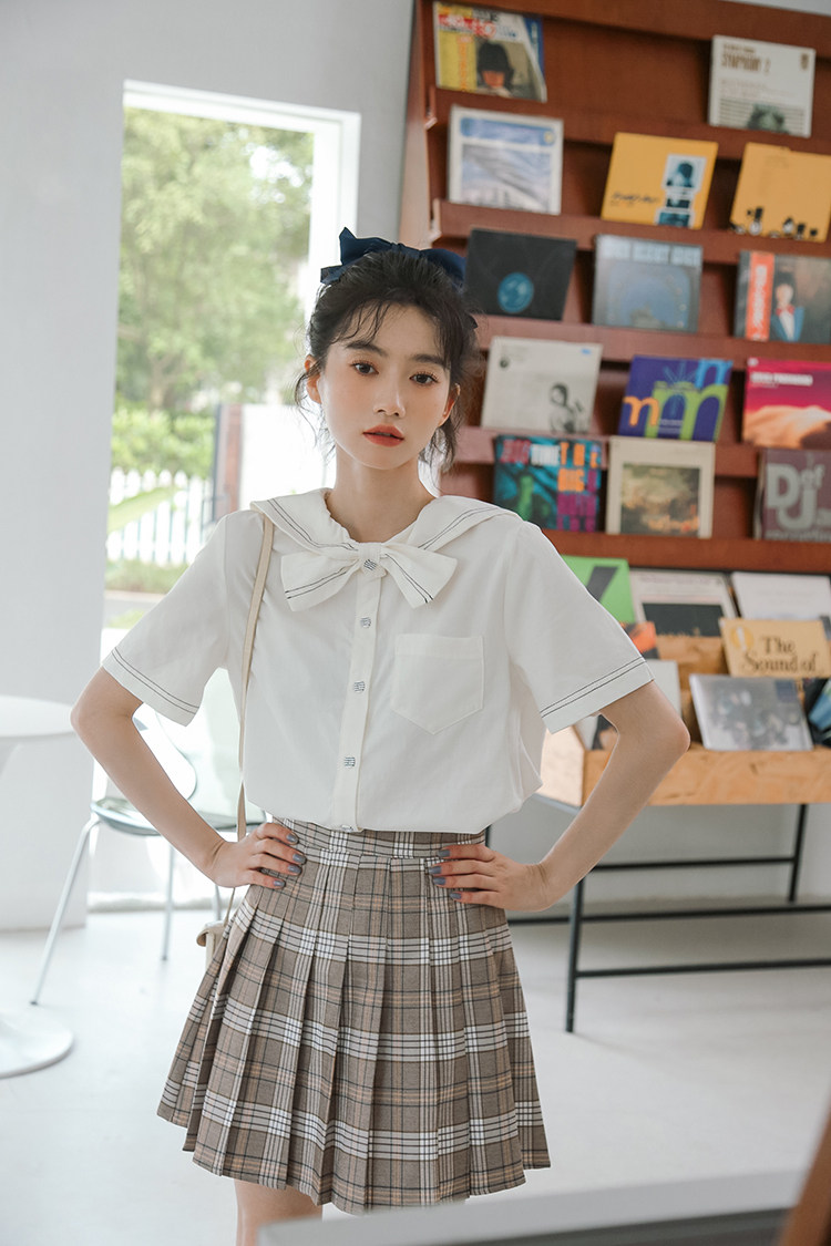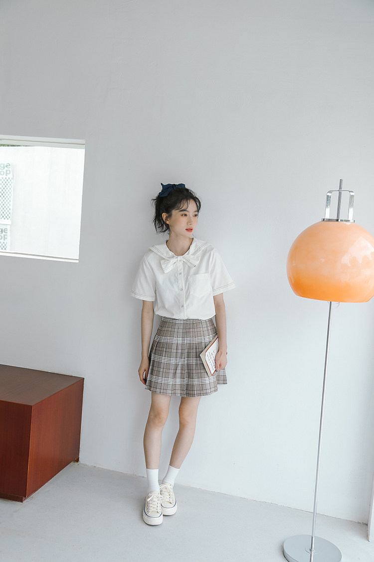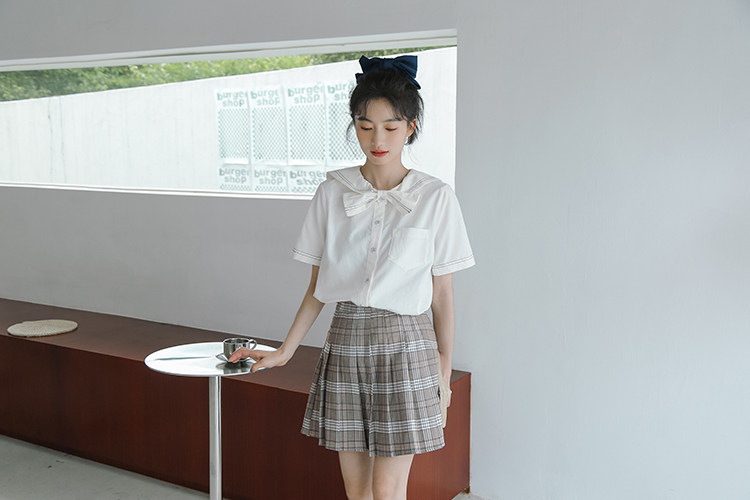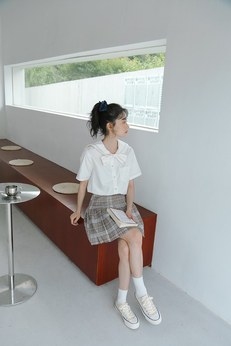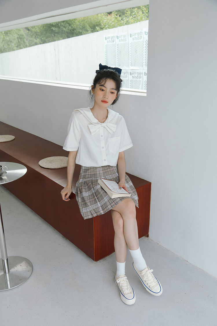 实拍2021夏季新款 明线设计打结蝴蝶结海军领衬衫上衣女