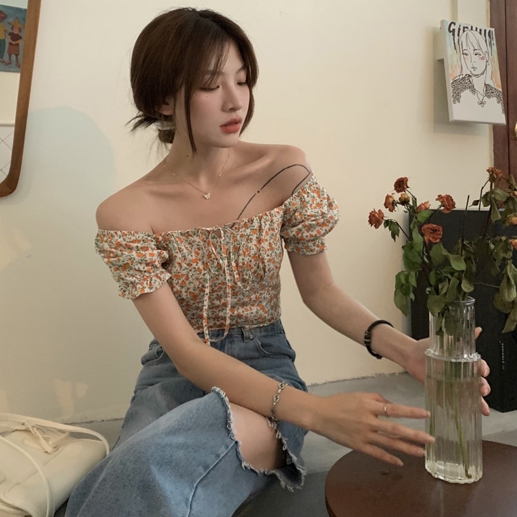 实拍实价~ 韩版夏款 设计感小众别致方领碎花短款短袖衬衫