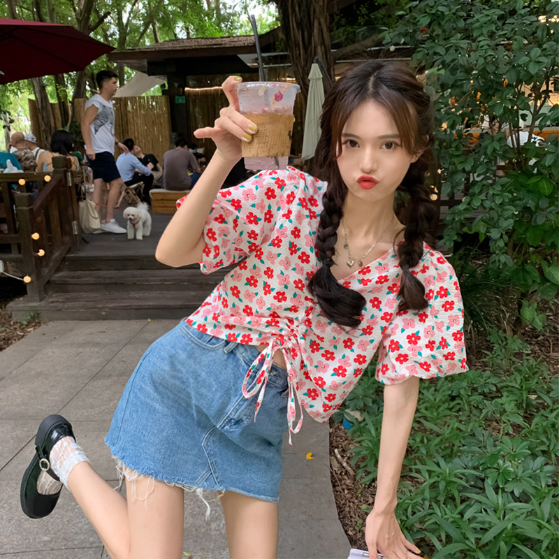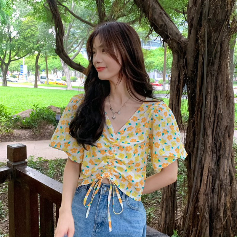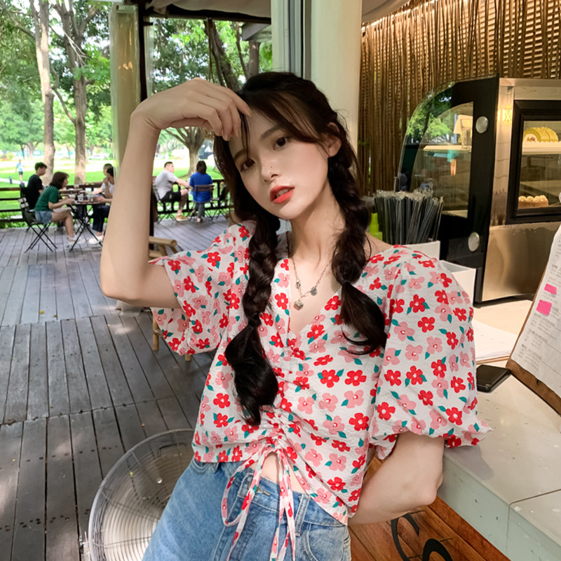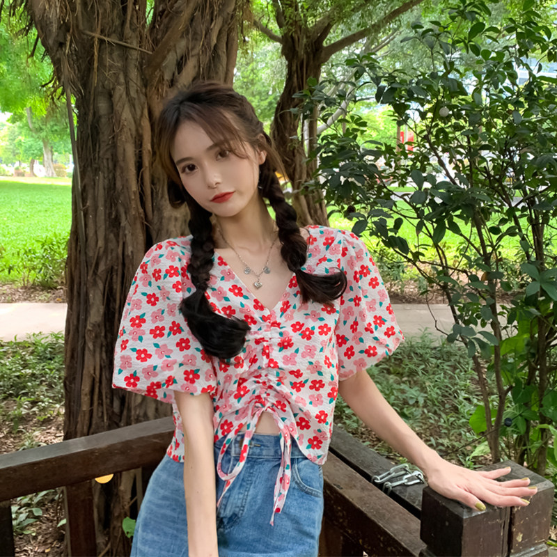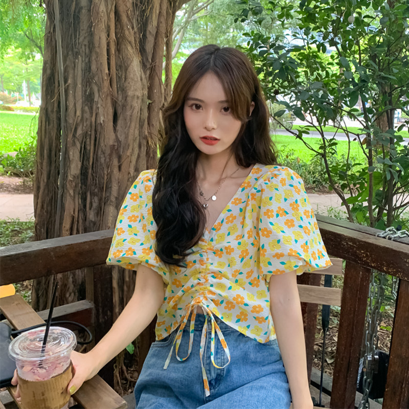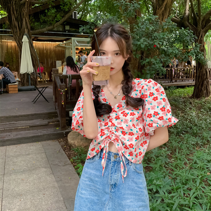实价实拍 抽绳短款衬衣女设计感小众上衣2021夏季新款泡泡袖衬衫