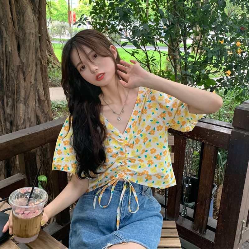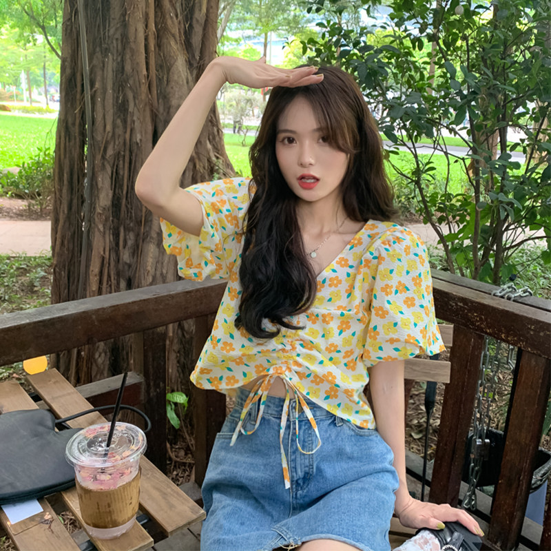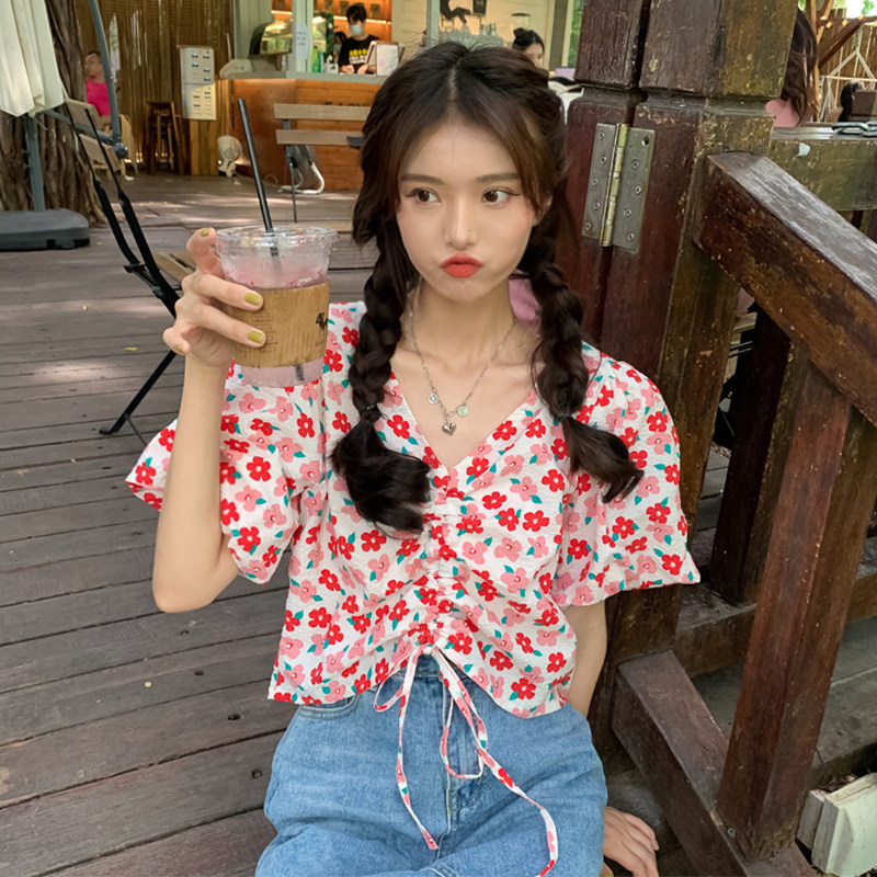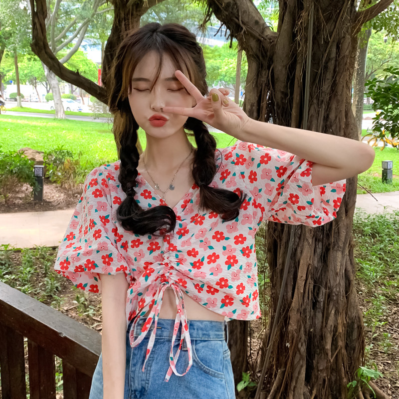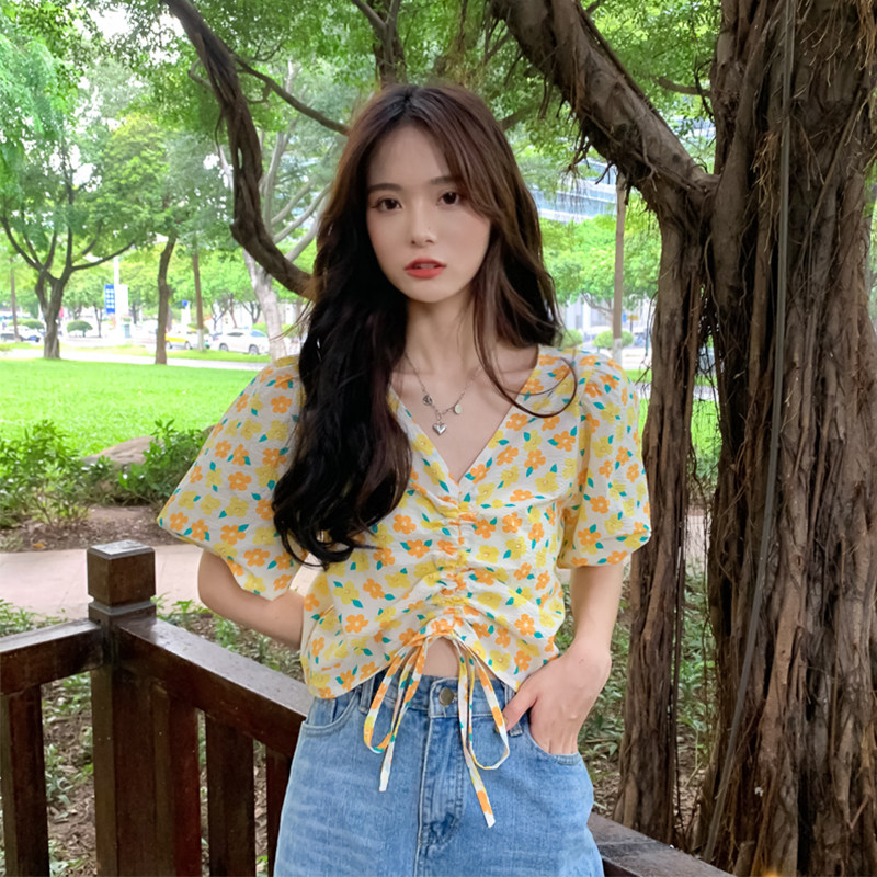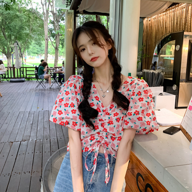 实价实拍 抽绳短款衬衣女设计感小众上衣2021夏季新款泡泡袖衬衫