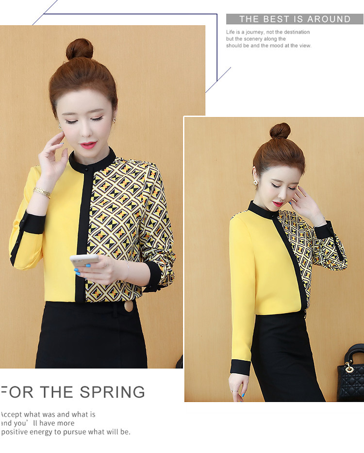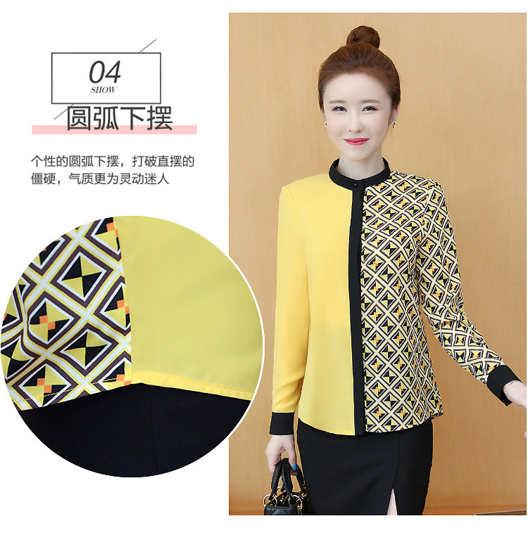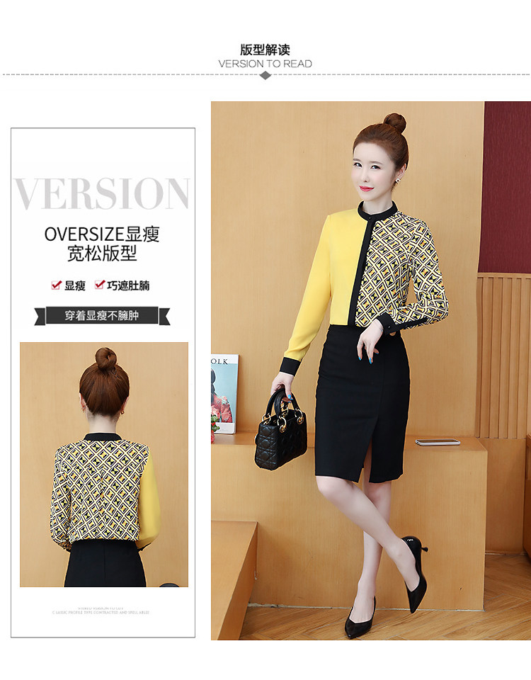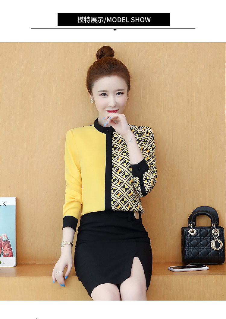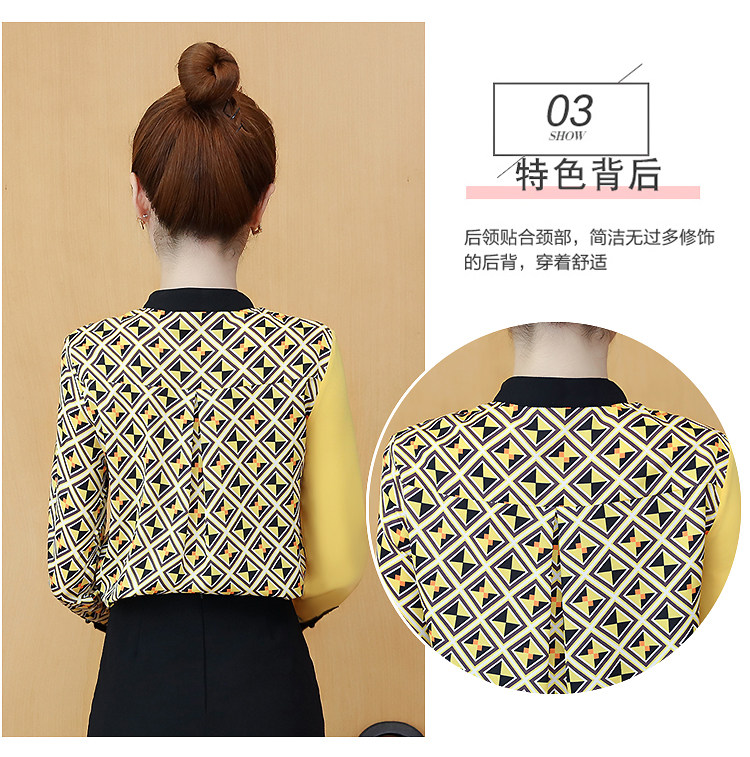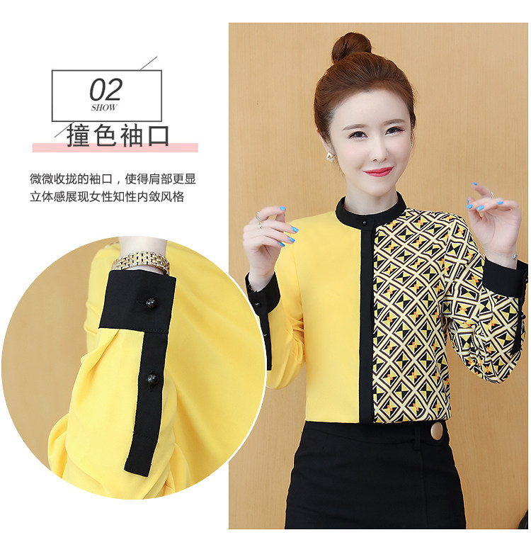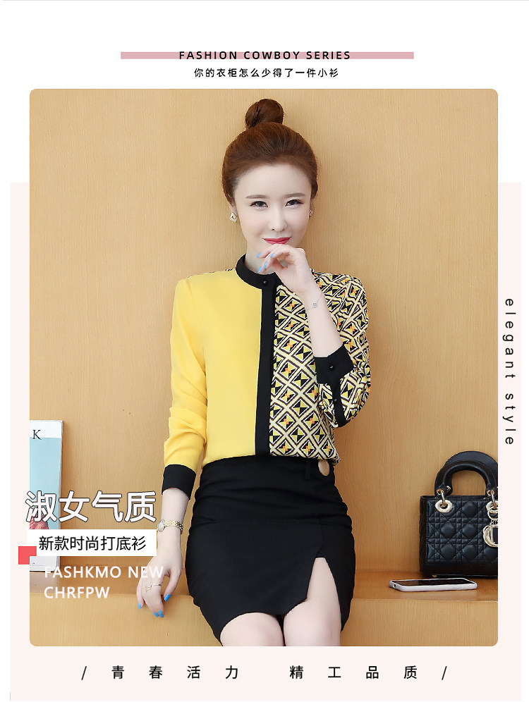 实拍2021春装长袖圆领印花拼色韩版宽松百搭衬衣雪纺衫