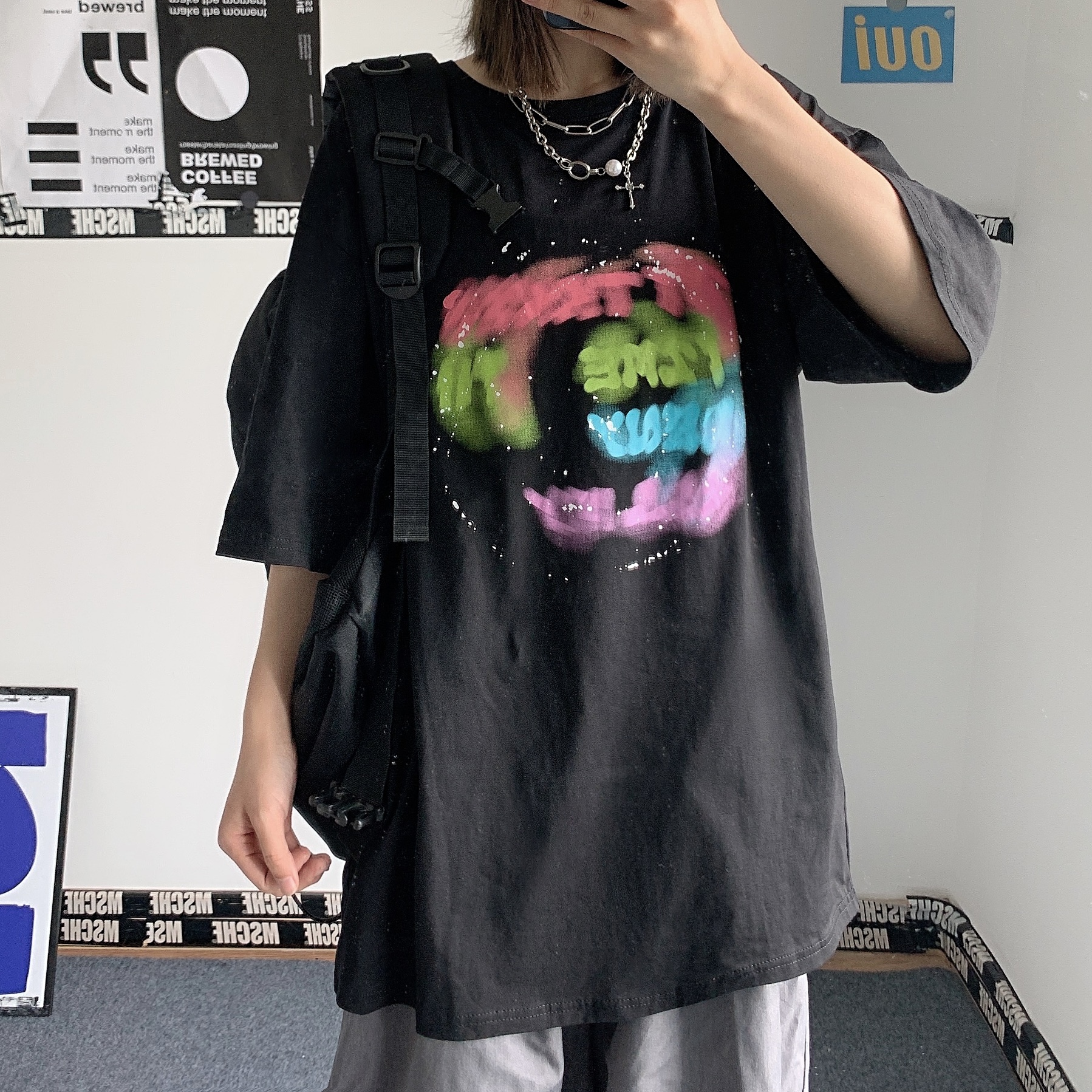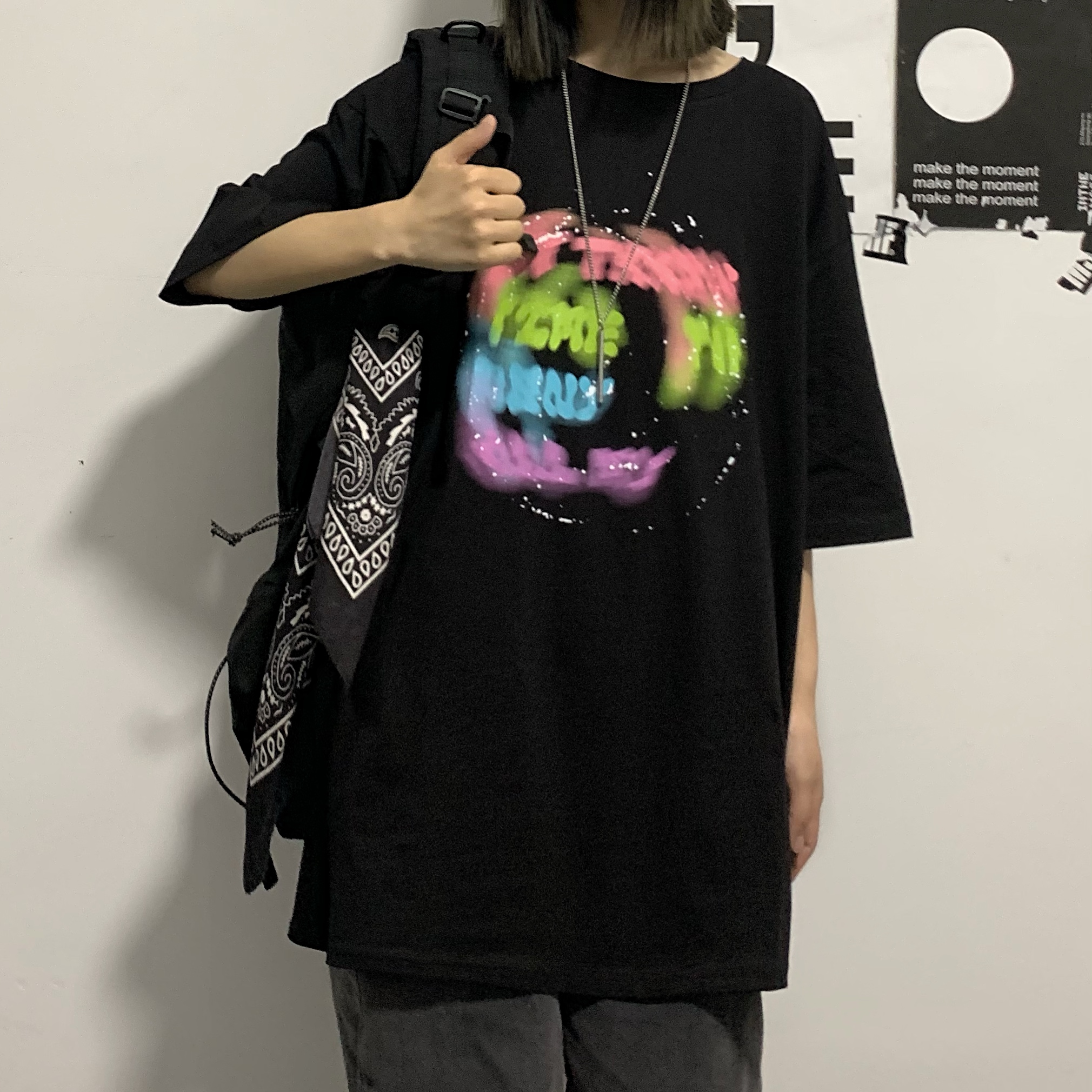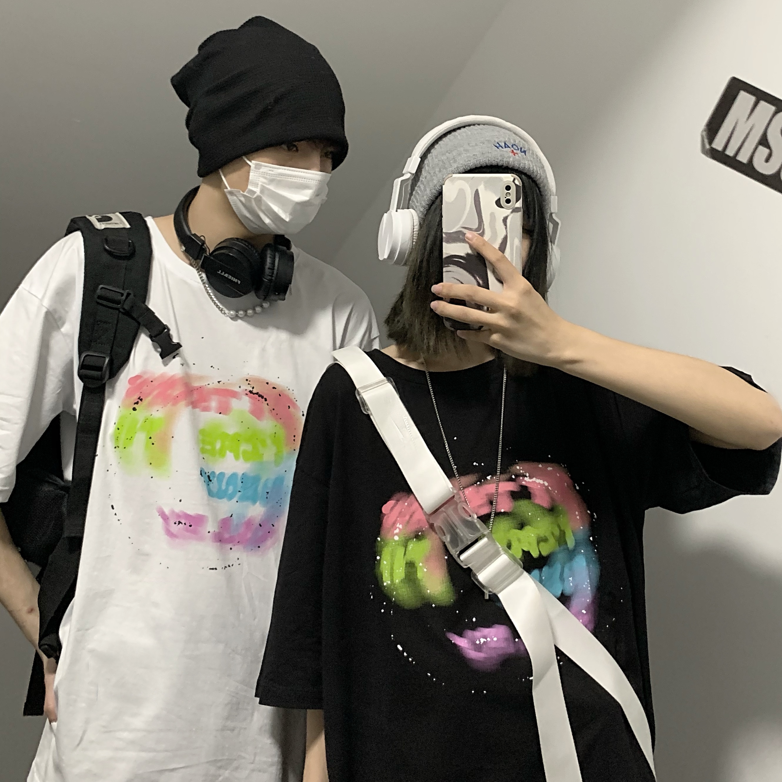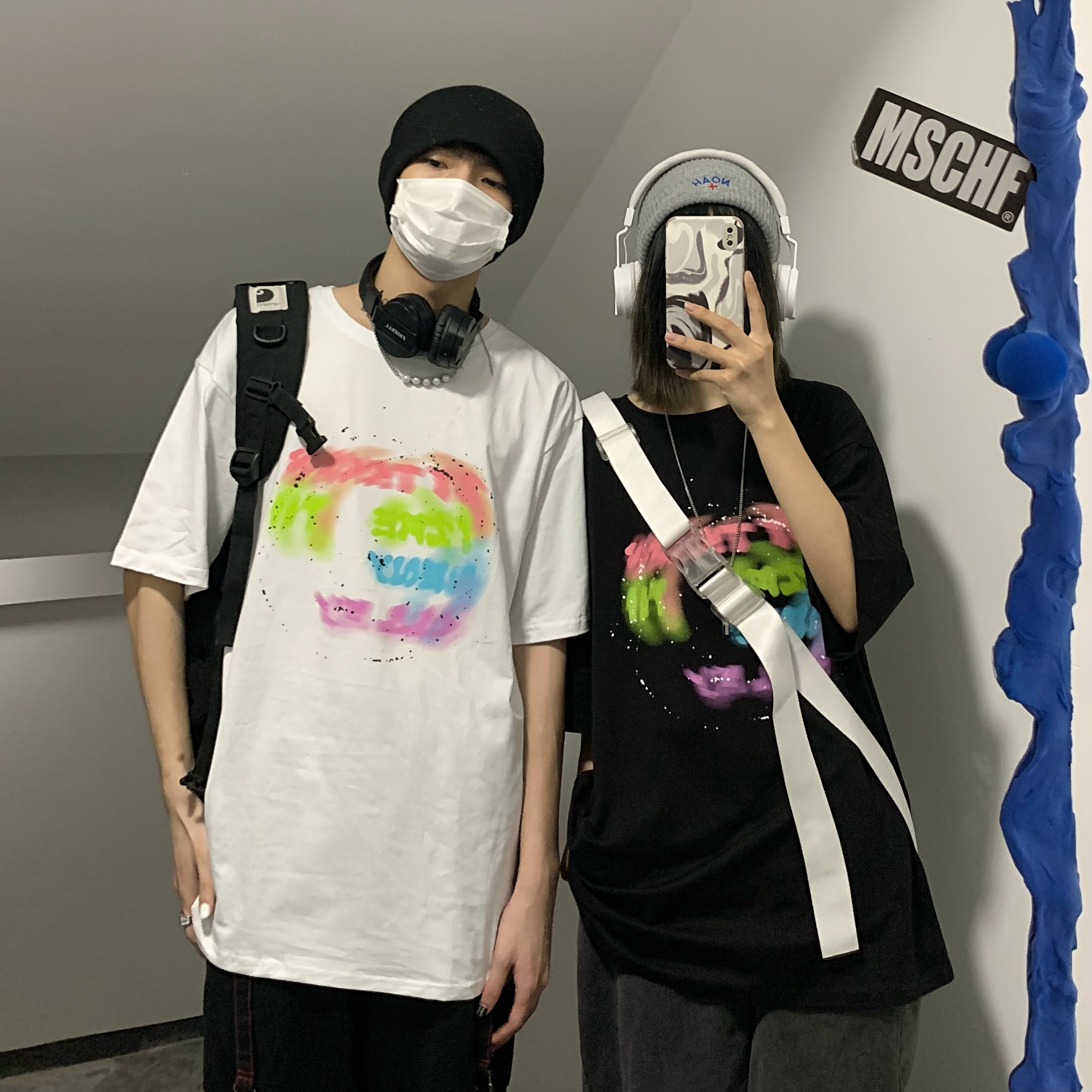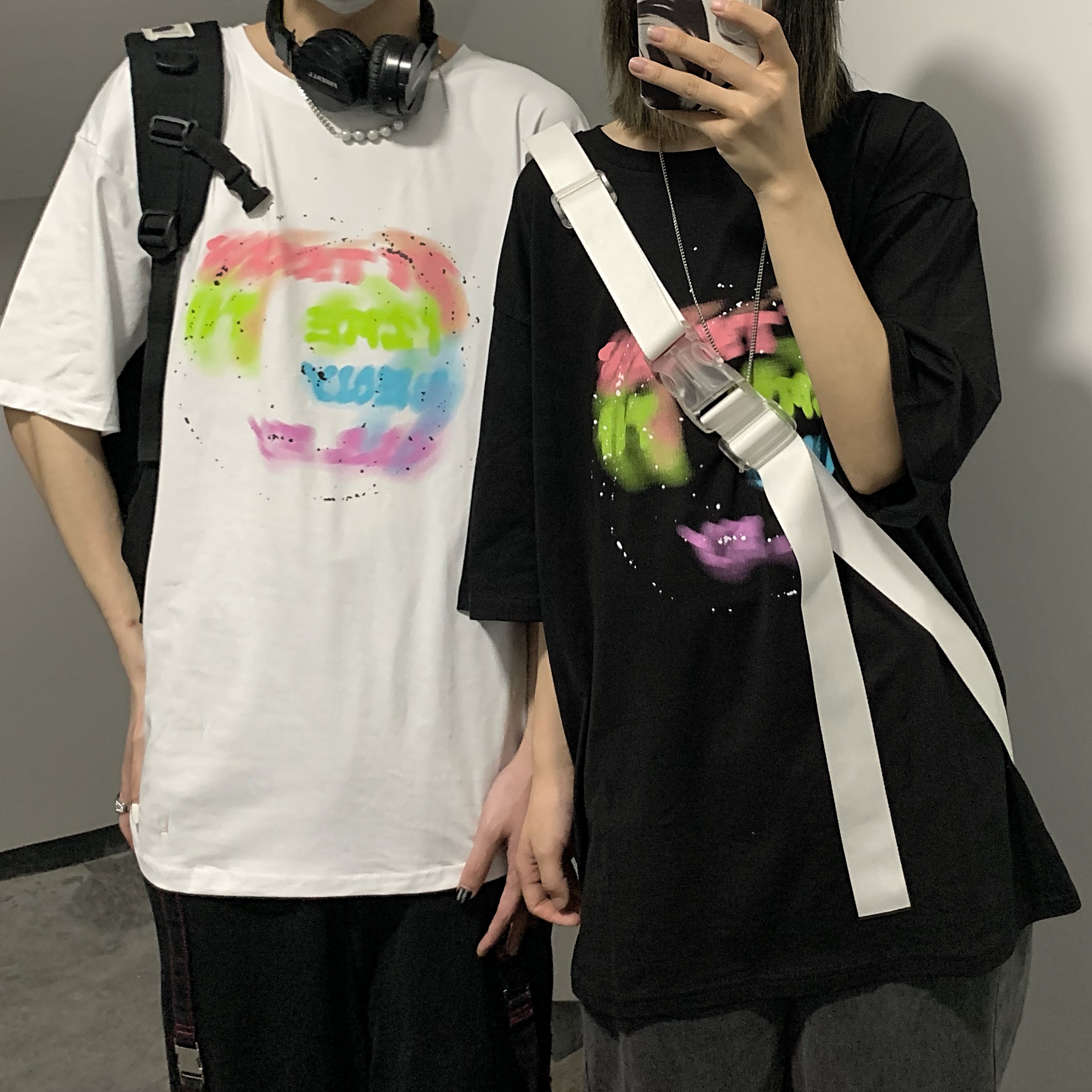 控+3实拍实价原创原宿纯棉INS泼墨彩色印花情侣短袖T恤男女上衣