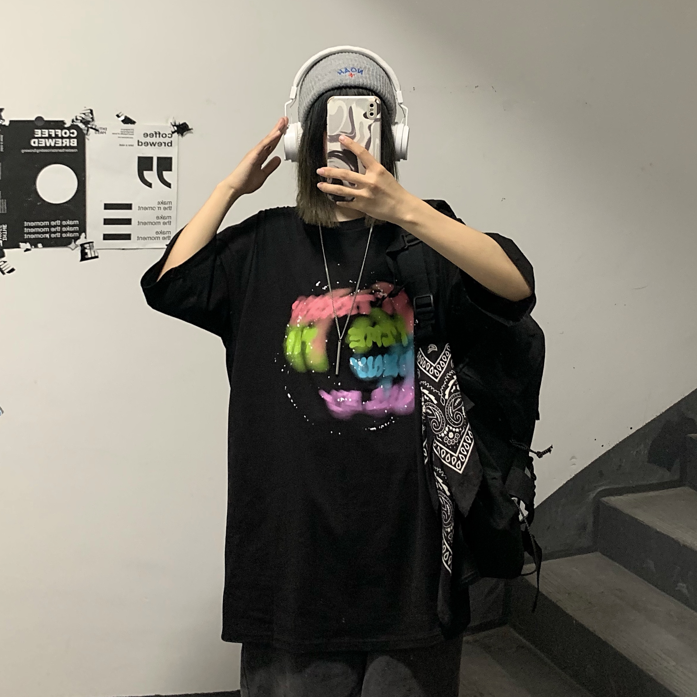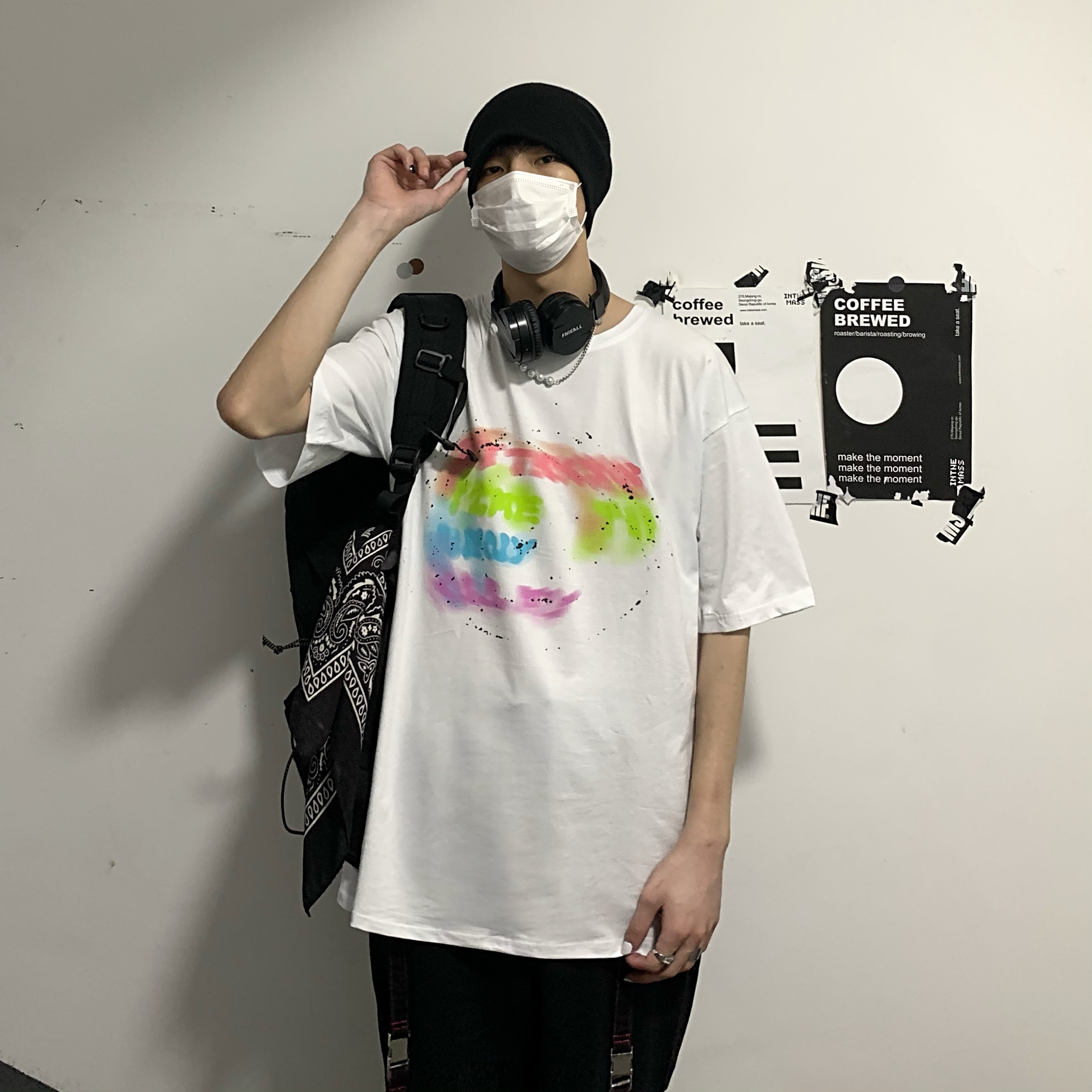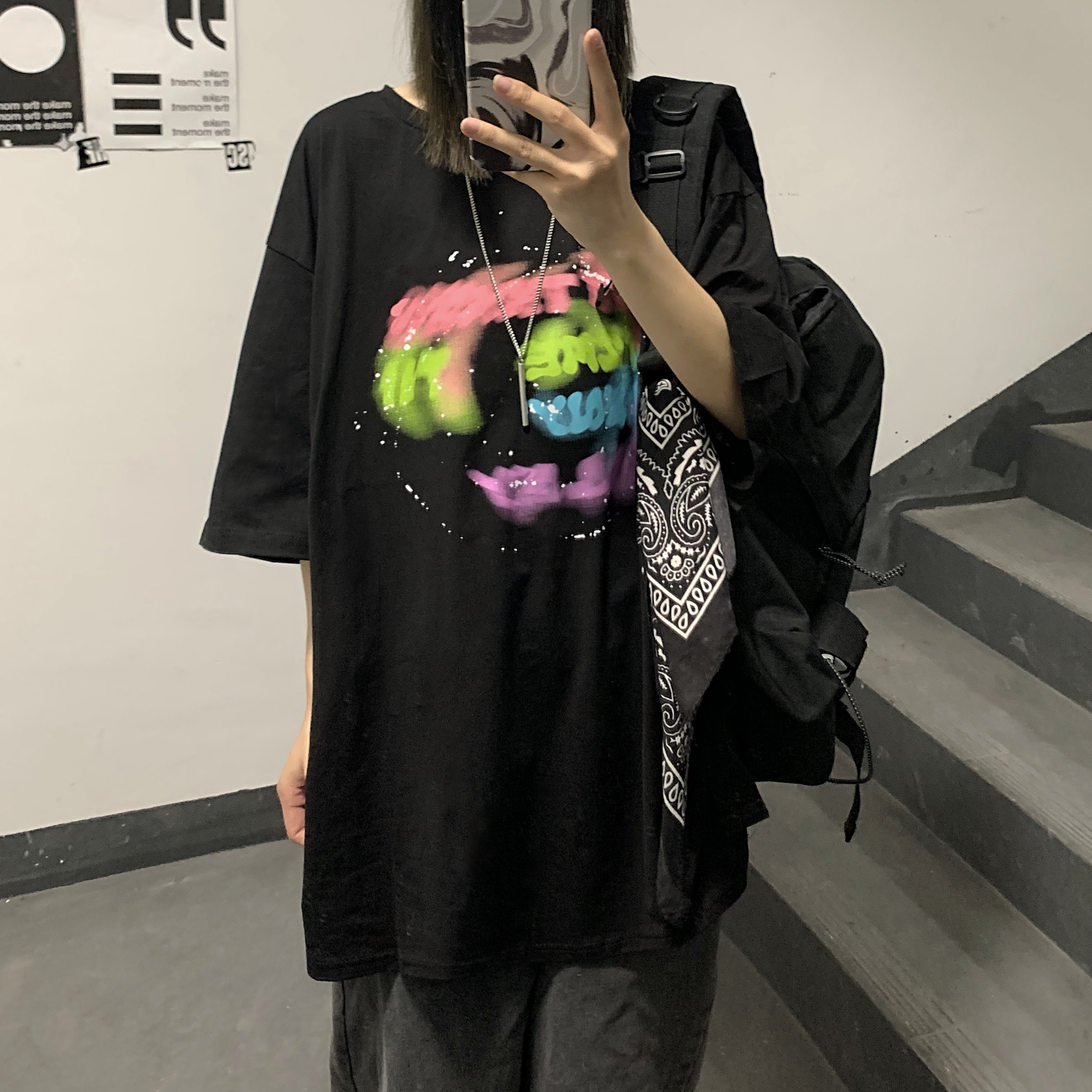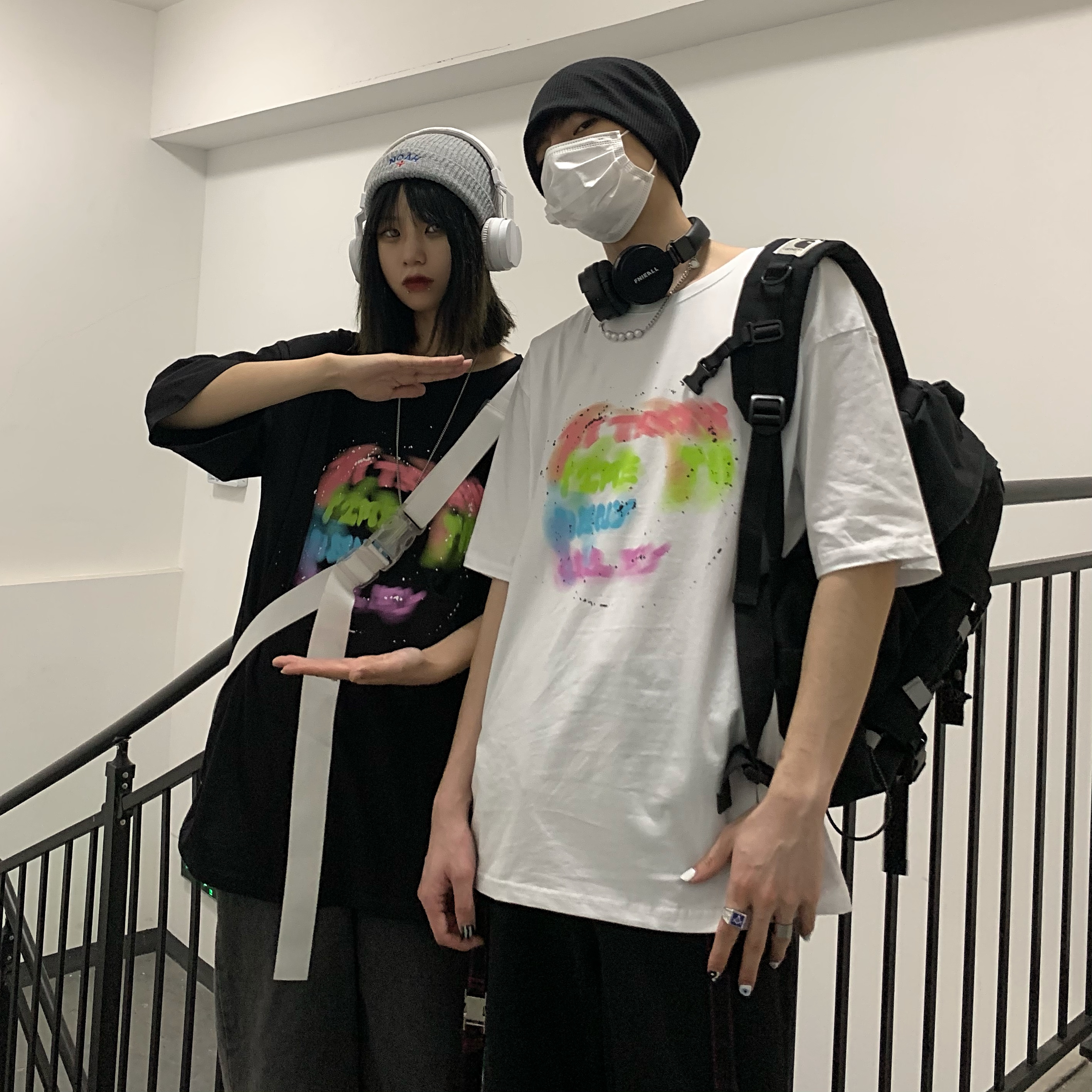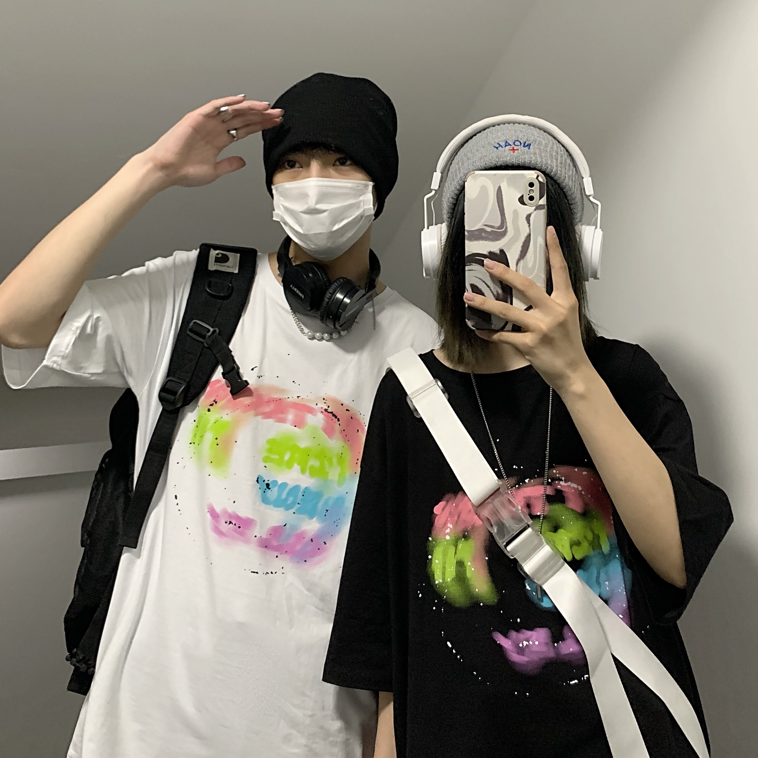 控+3实拍实价原创原宿纯棉INS泼墨彩色印花情侣短袖T恤男女上衣