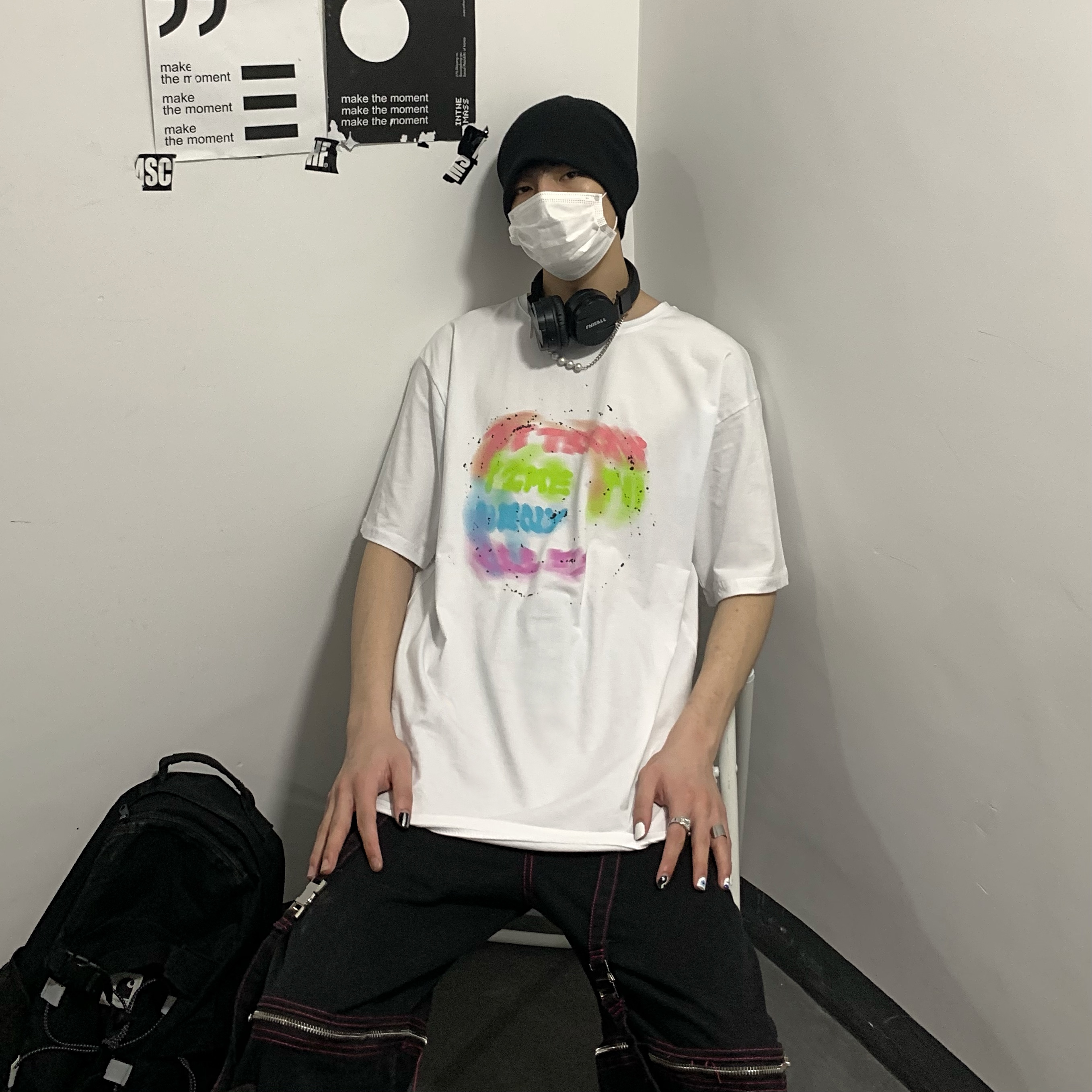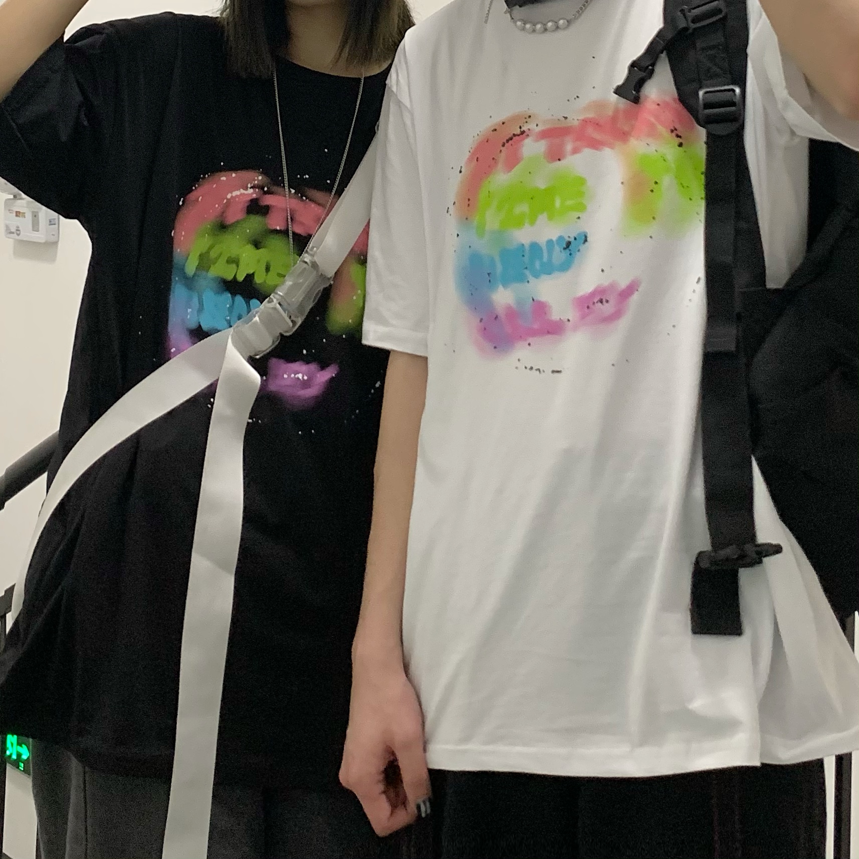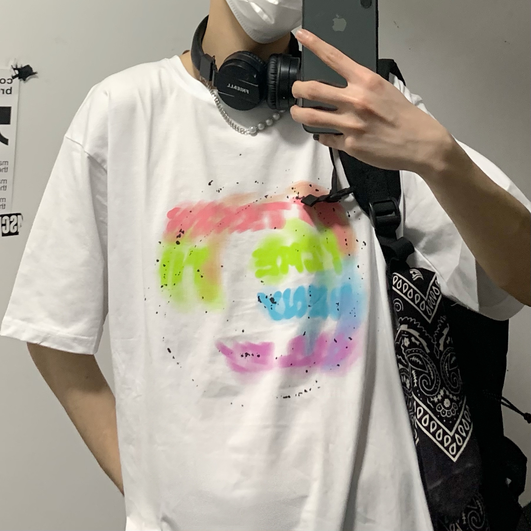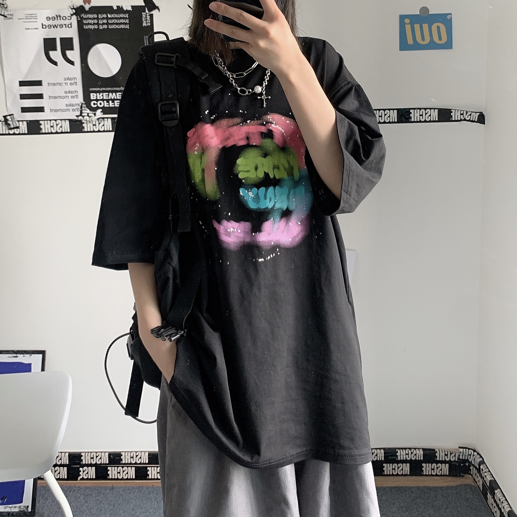 控+3实拍实价原创原宿纯棉INS泼墨彩色印花情侣短袖T恤男女上衣
