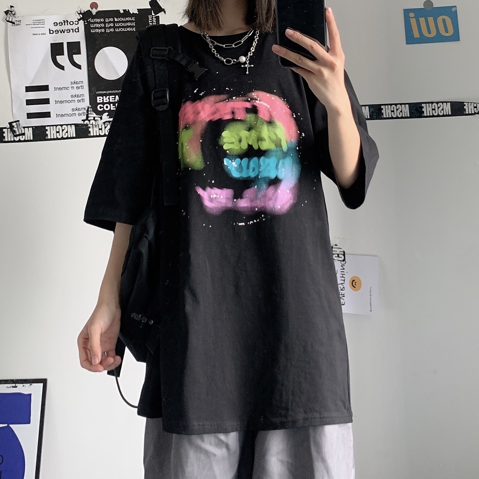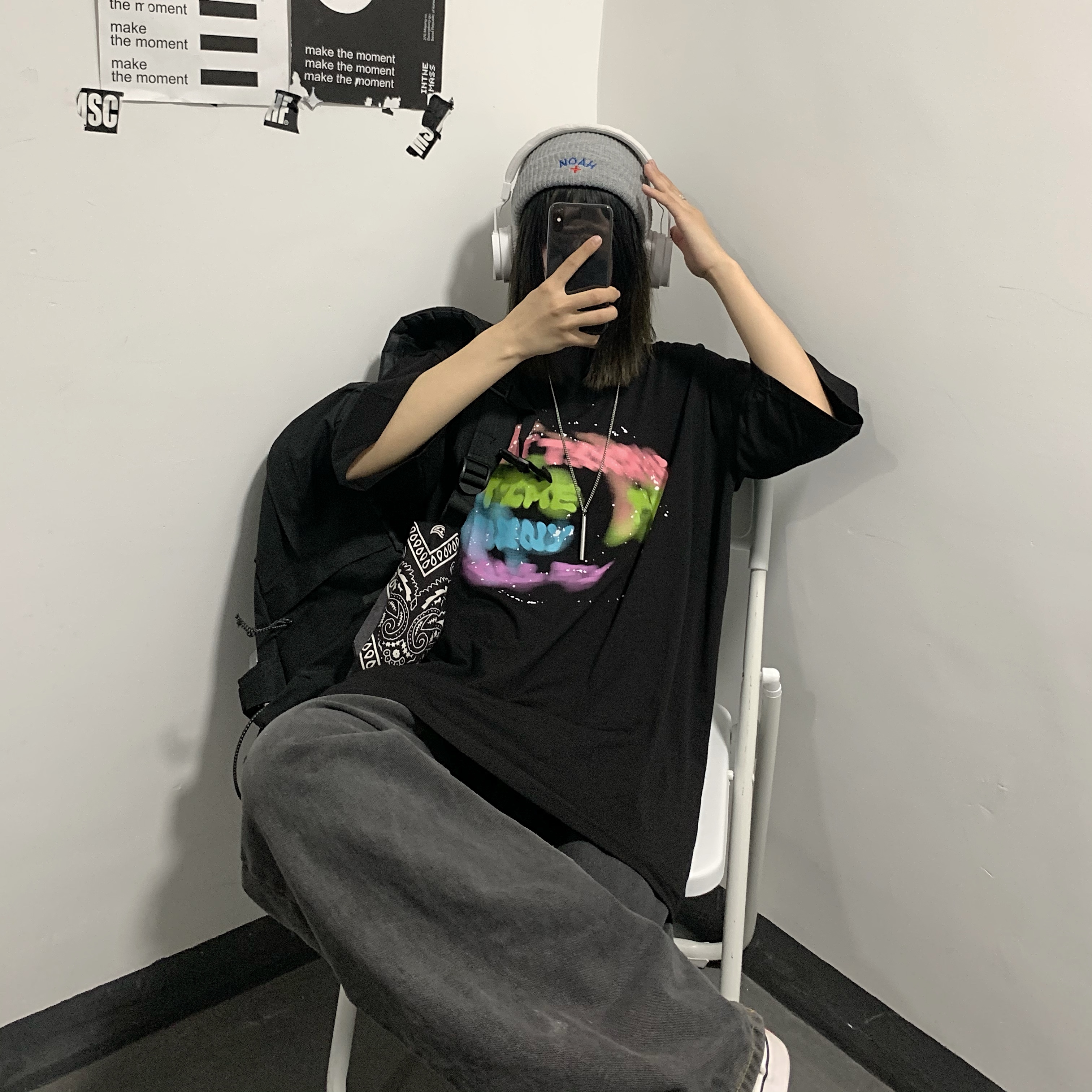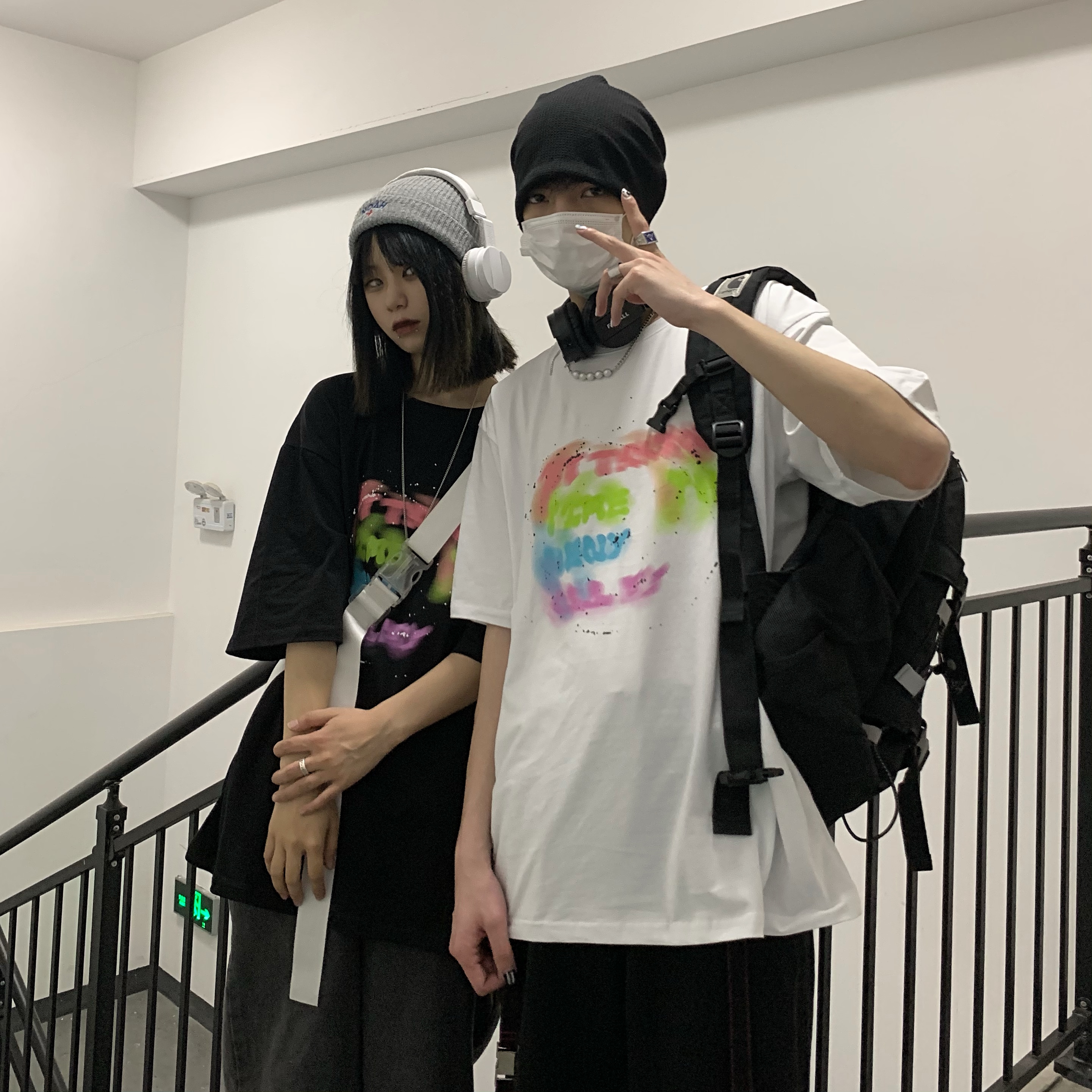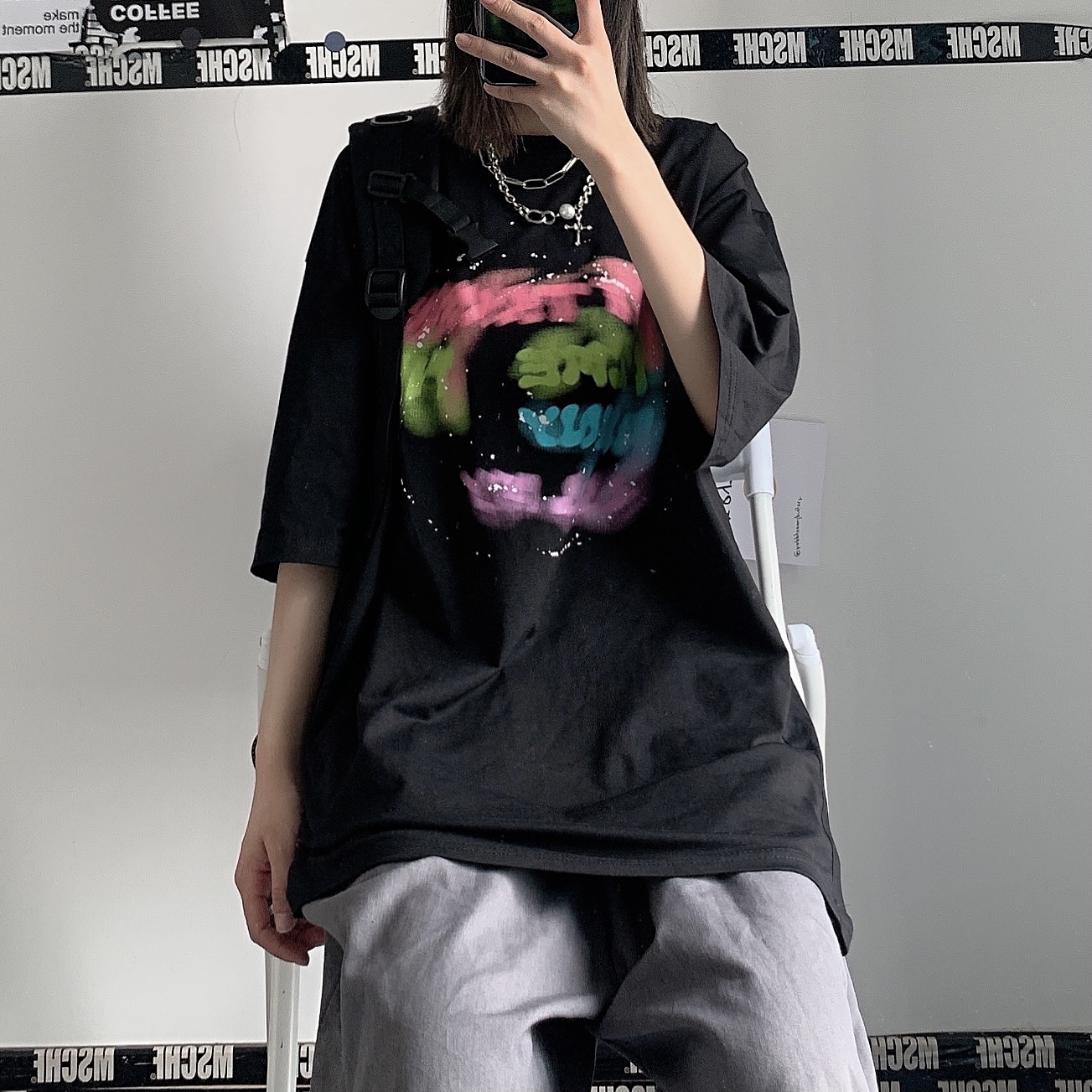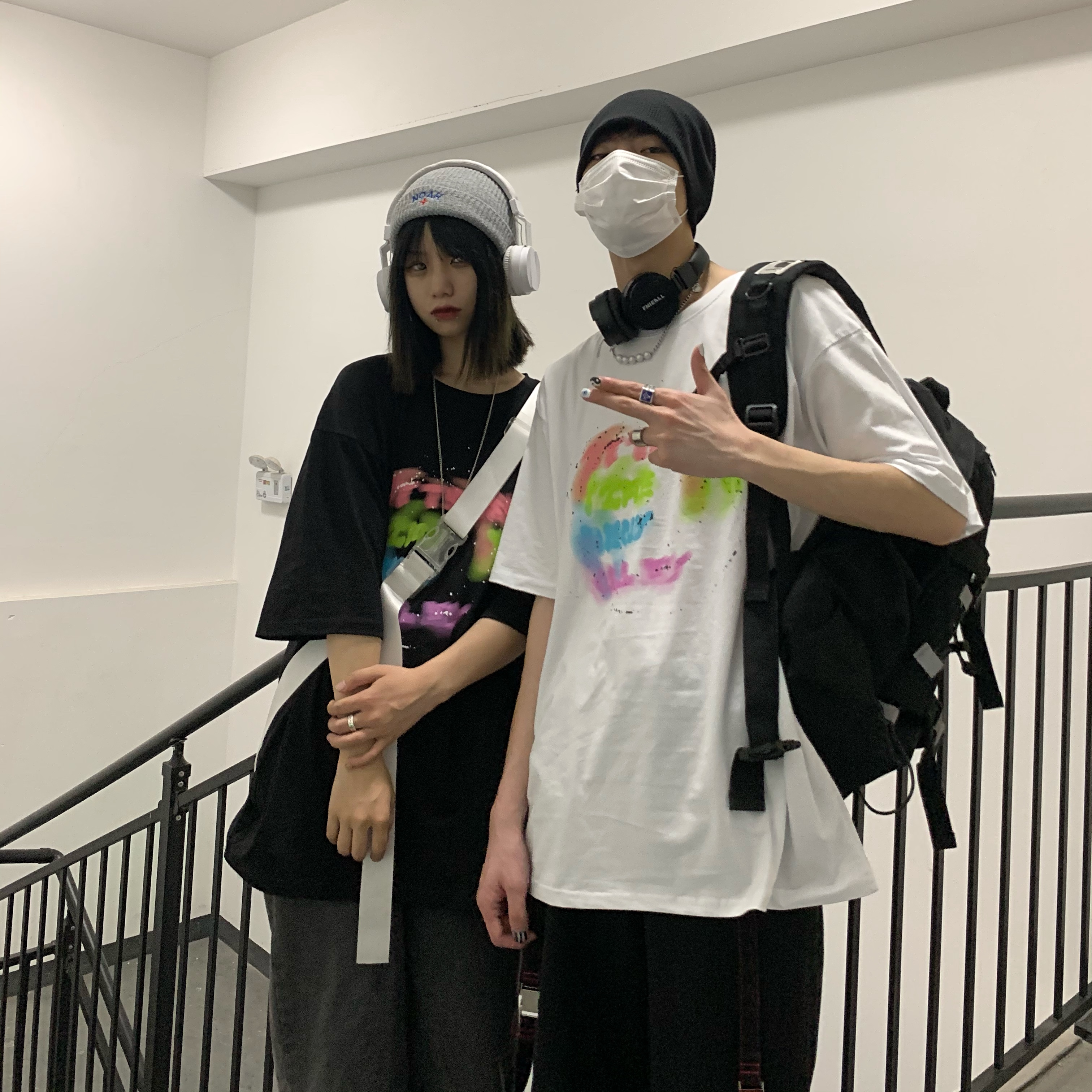 控+3实拍实价原创原宿纯棉INS泼墨彩色印花情侣短袖T恤男女上衣