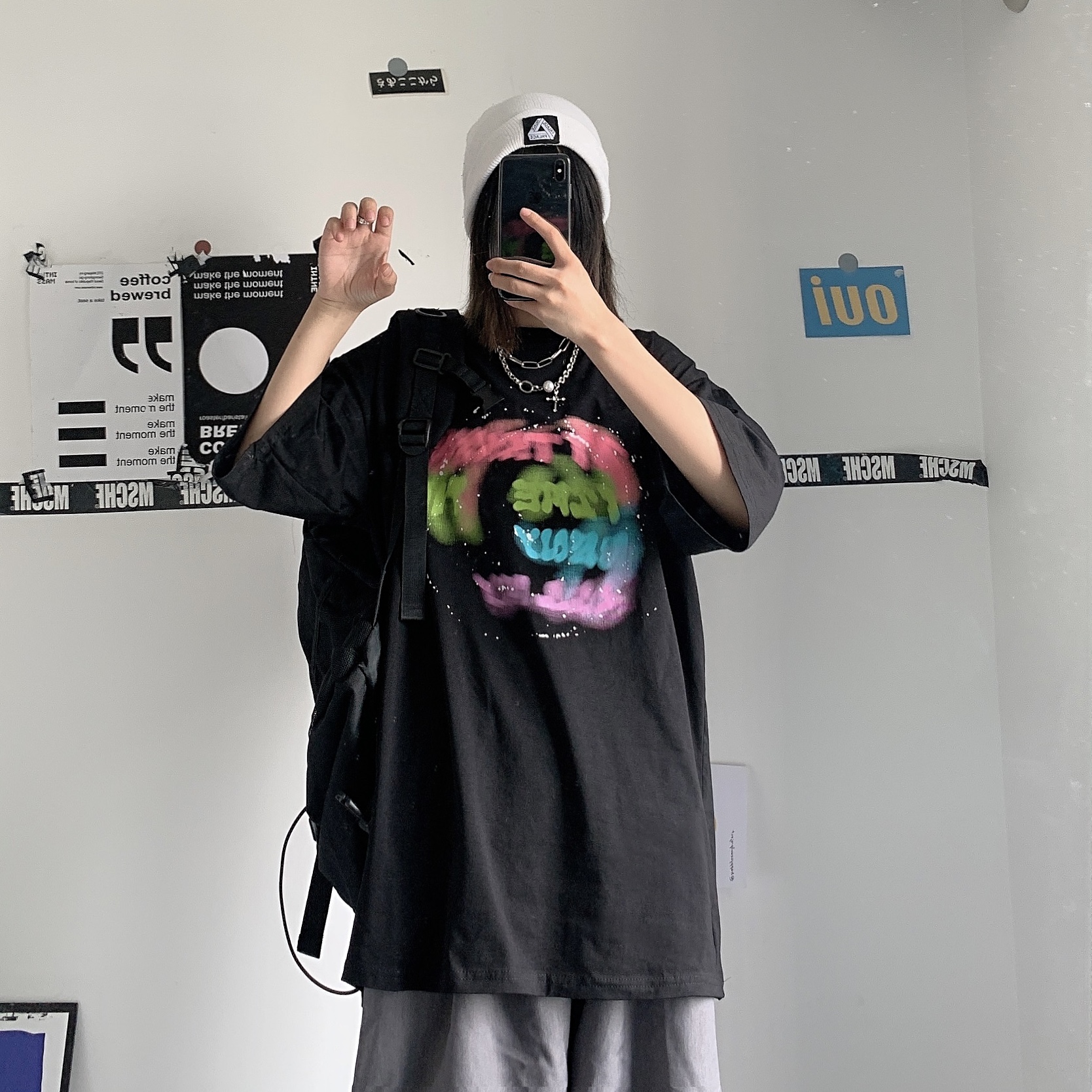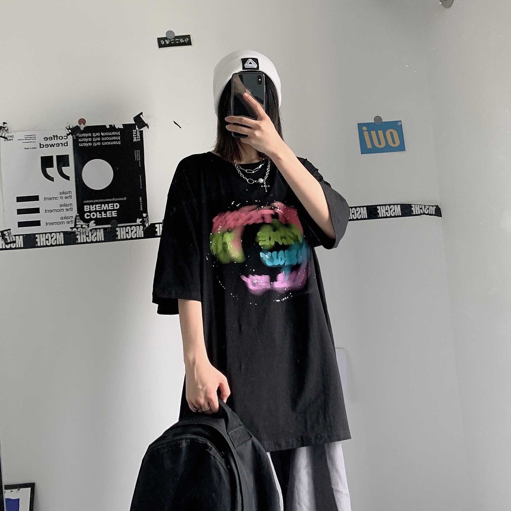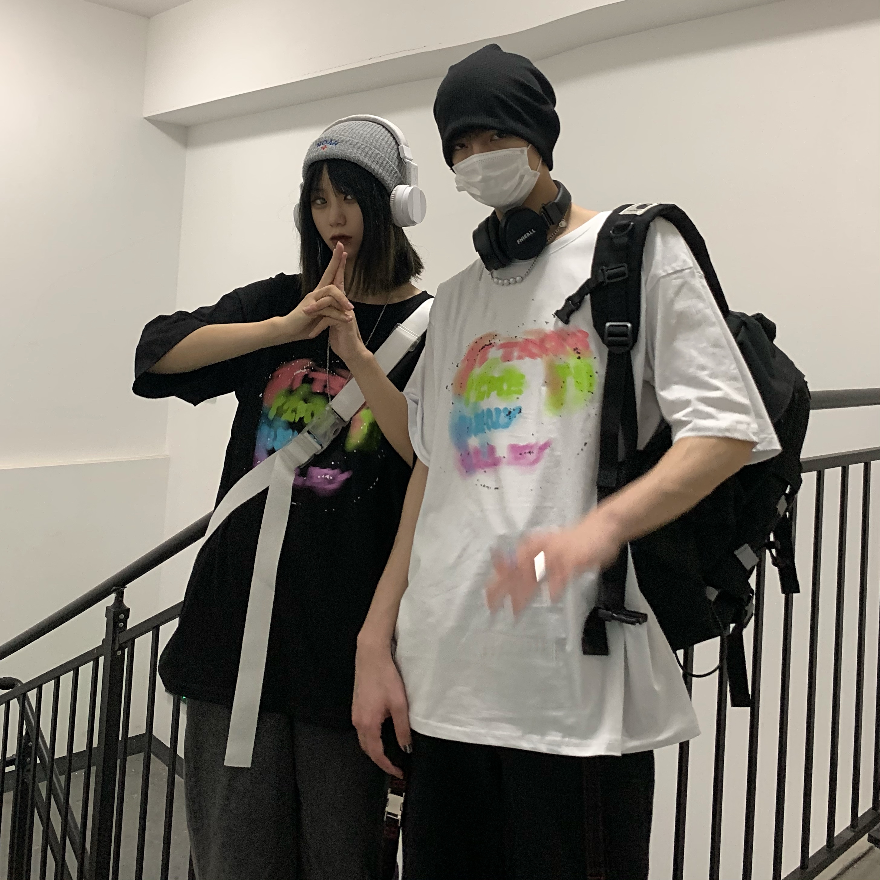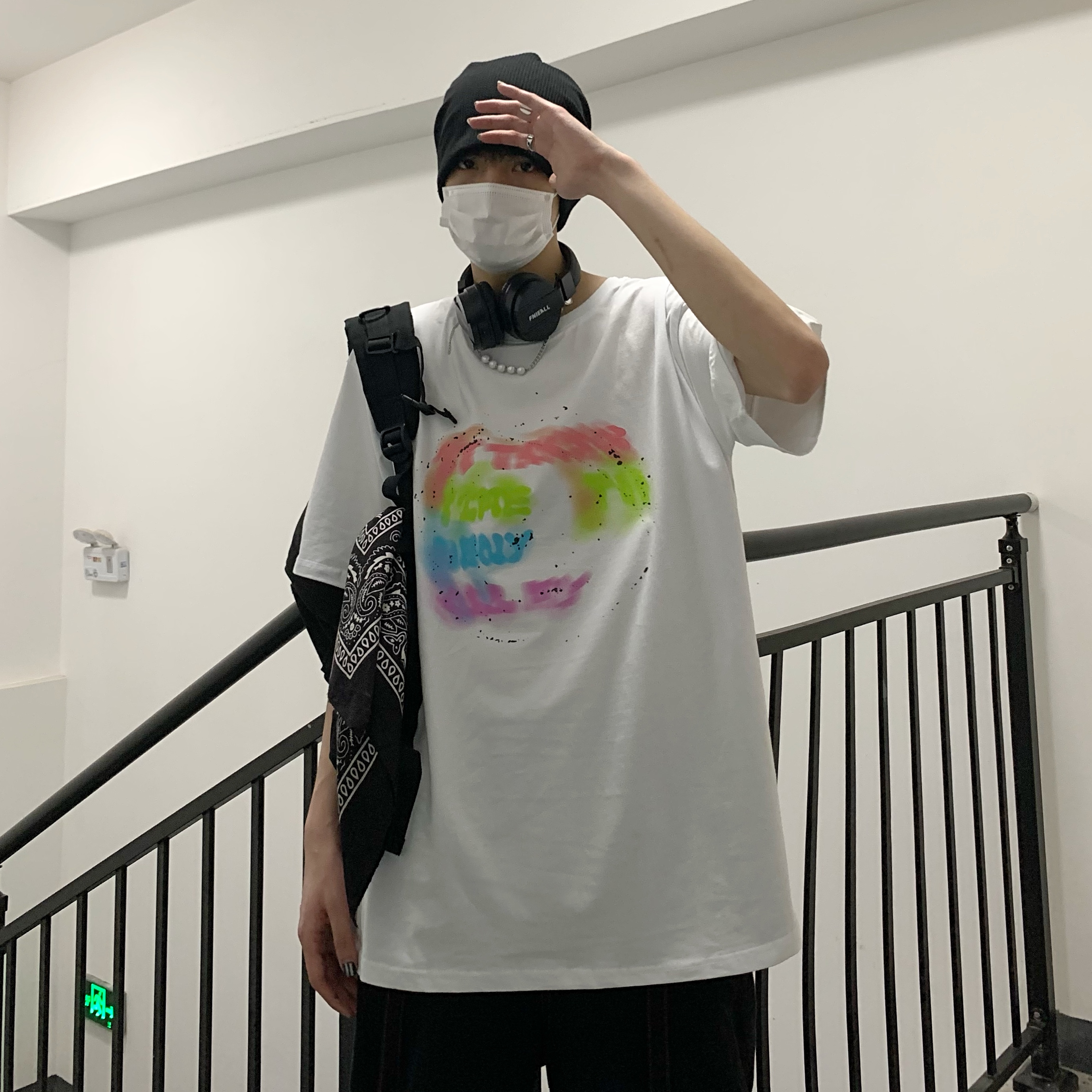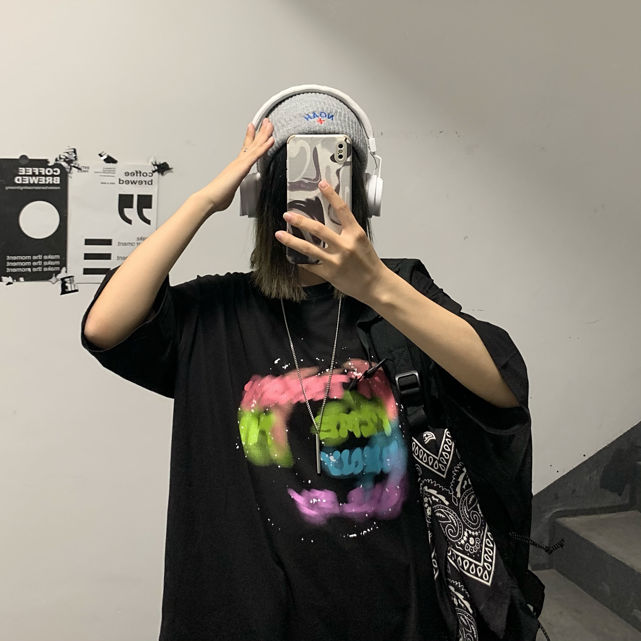 控+3实拍实价原创原宿纯棉INS泼墨彩色印花情侣短袖T恤男女上衣